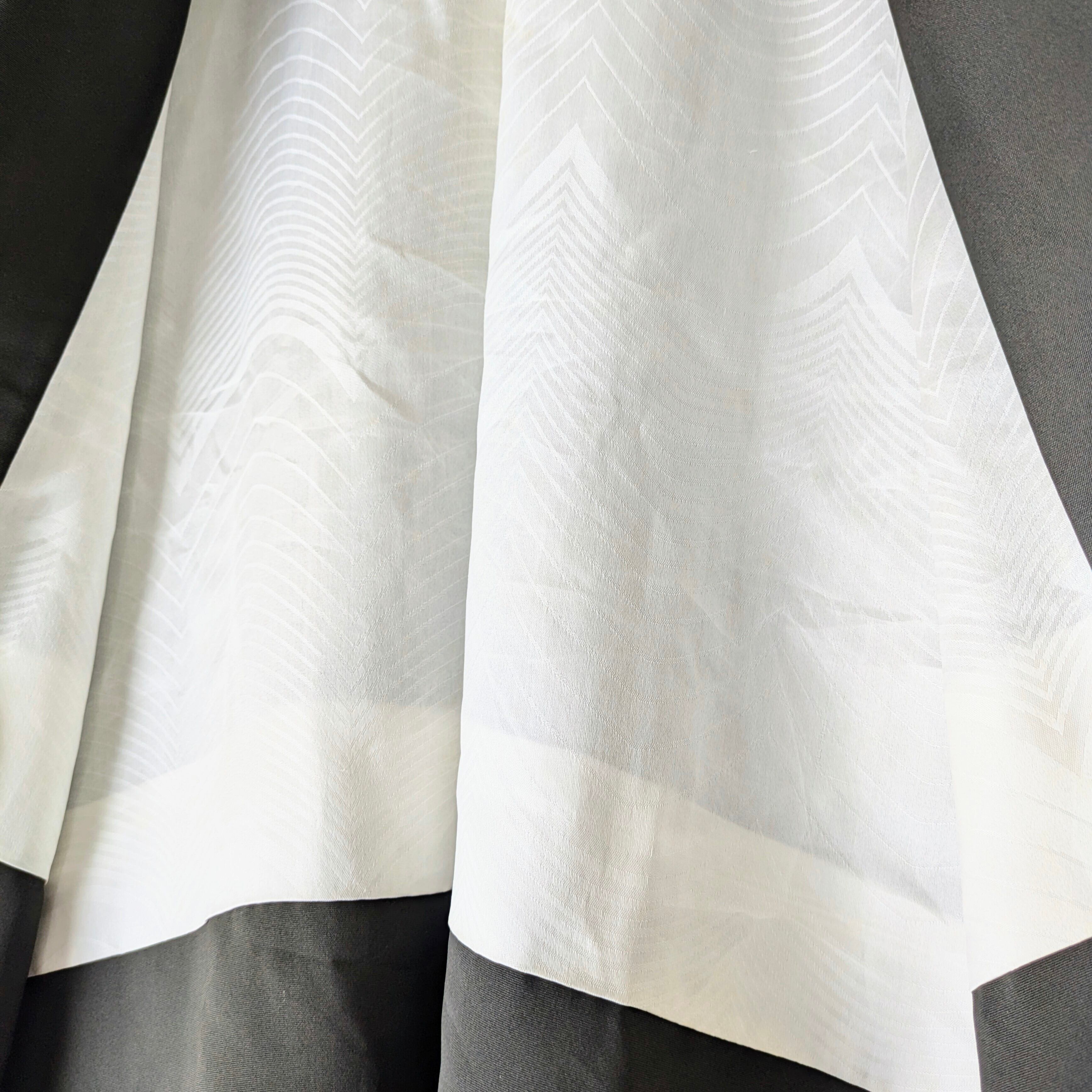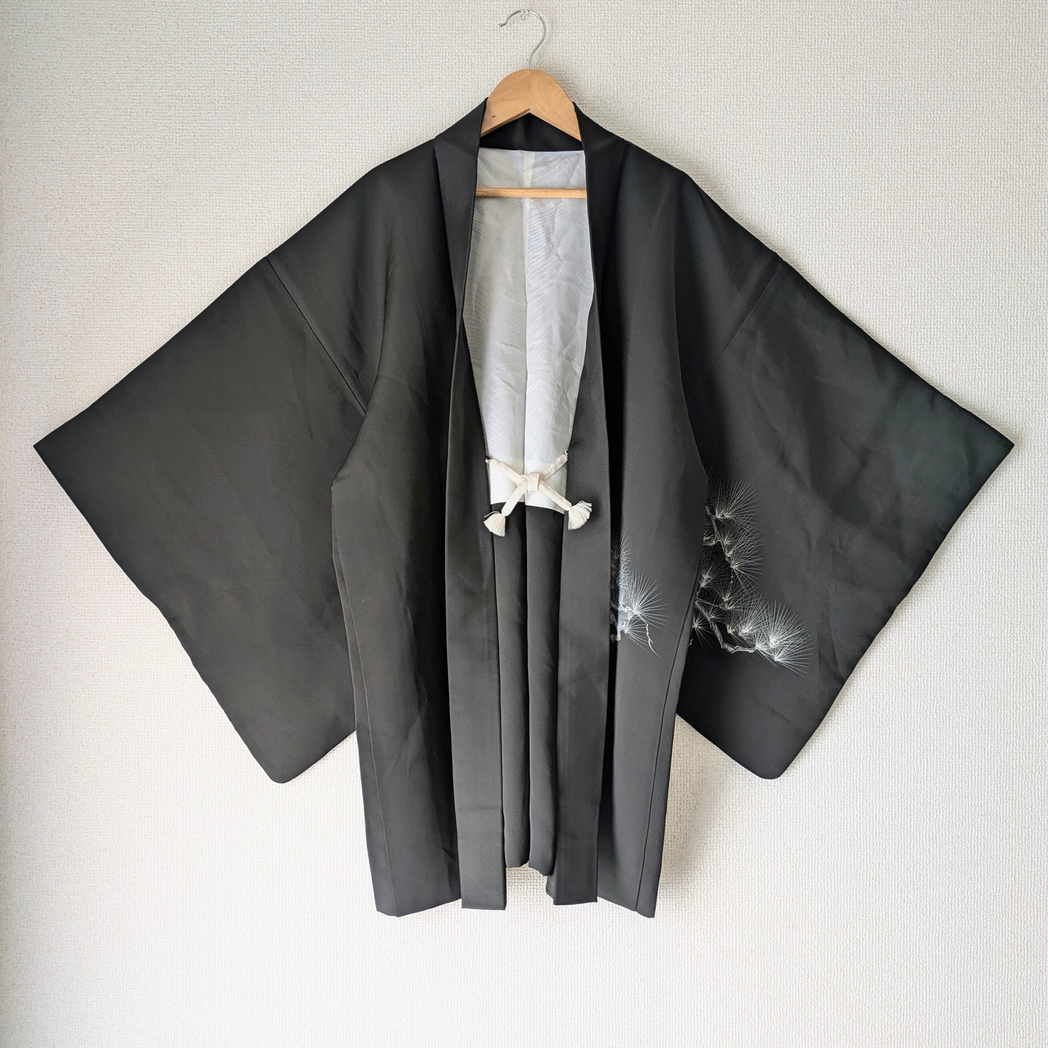 漆黒の絹地に、まるで発光するかのように輝く白松の幽玄な佇まいが印象的な長羽織です。白松柄の一部には刺繍が施されています。