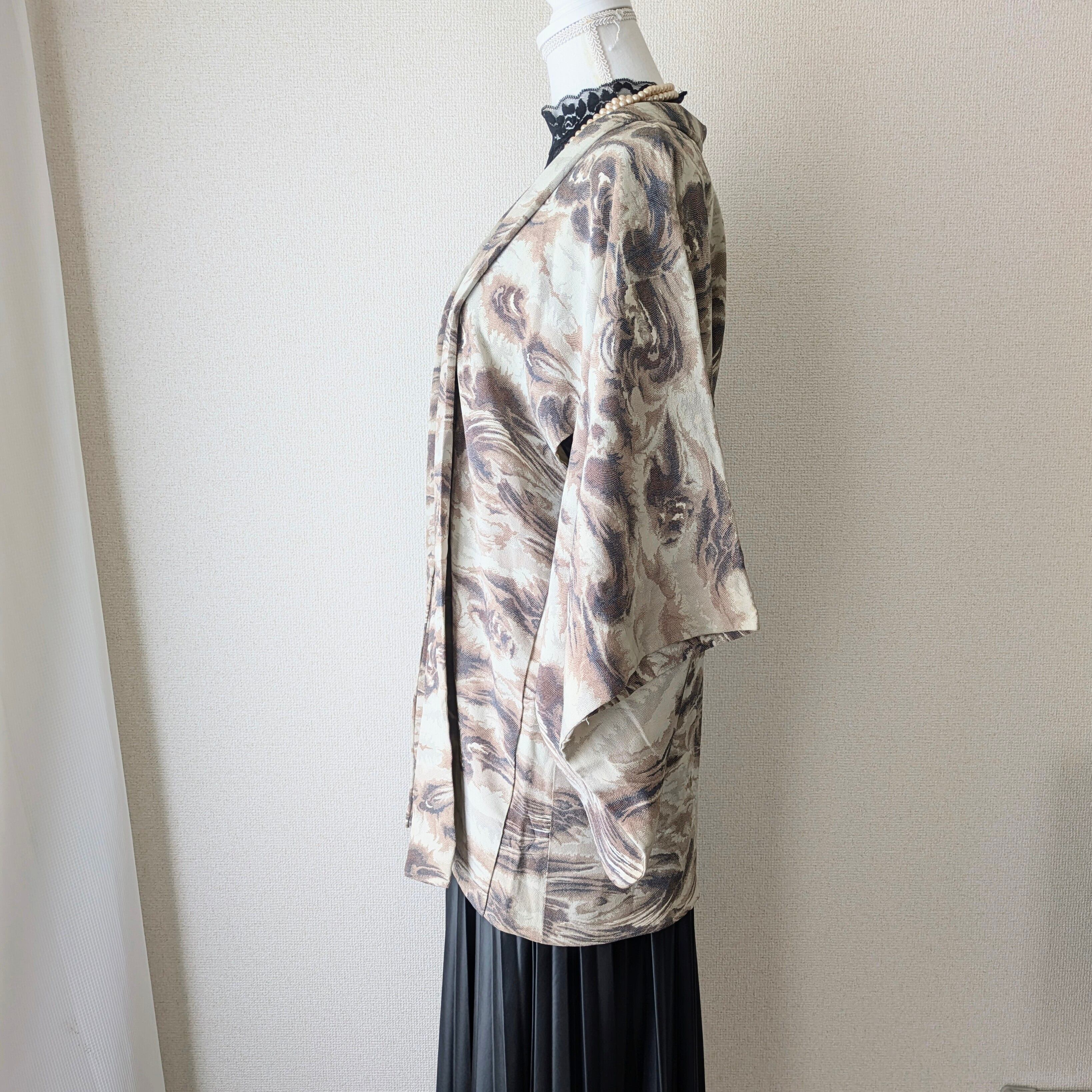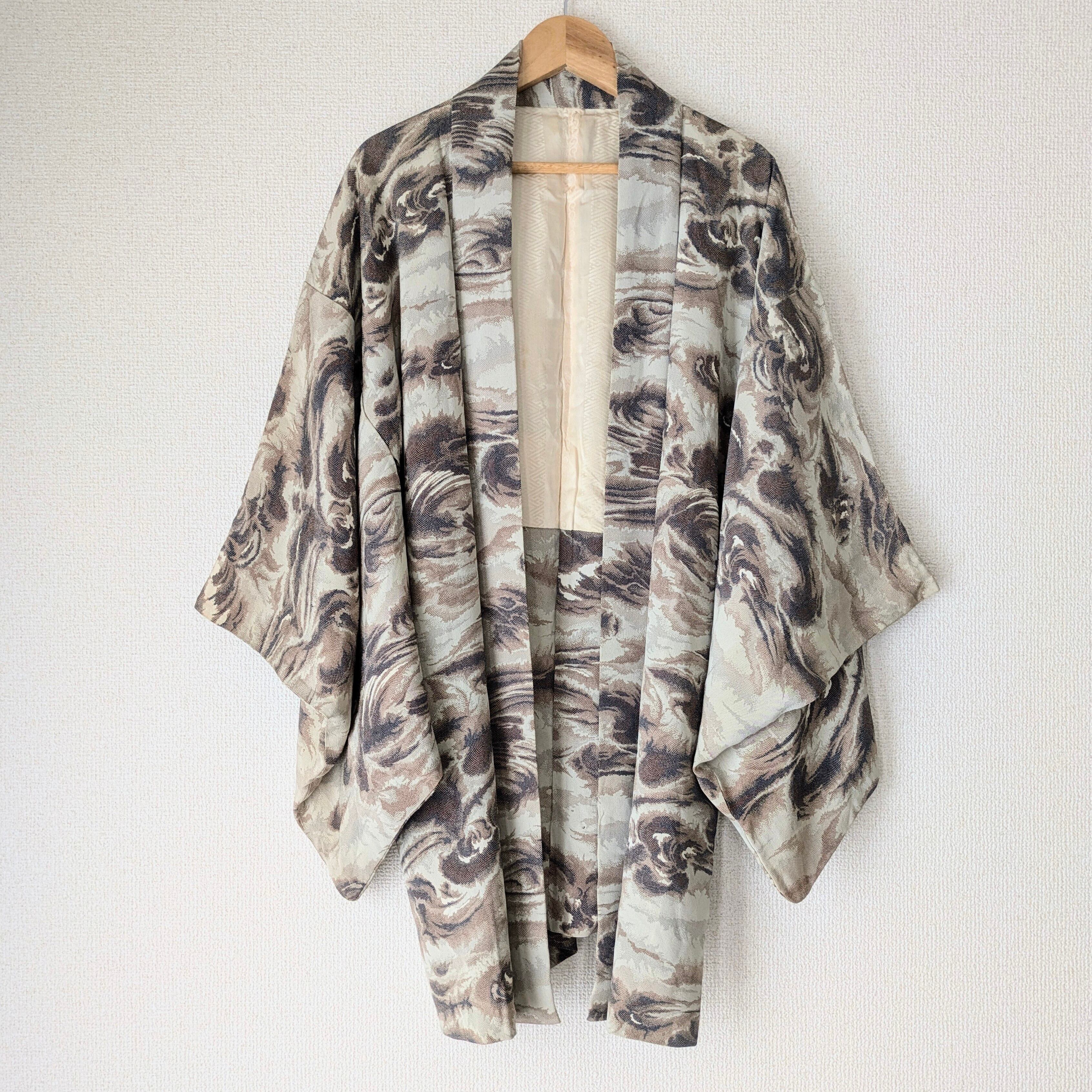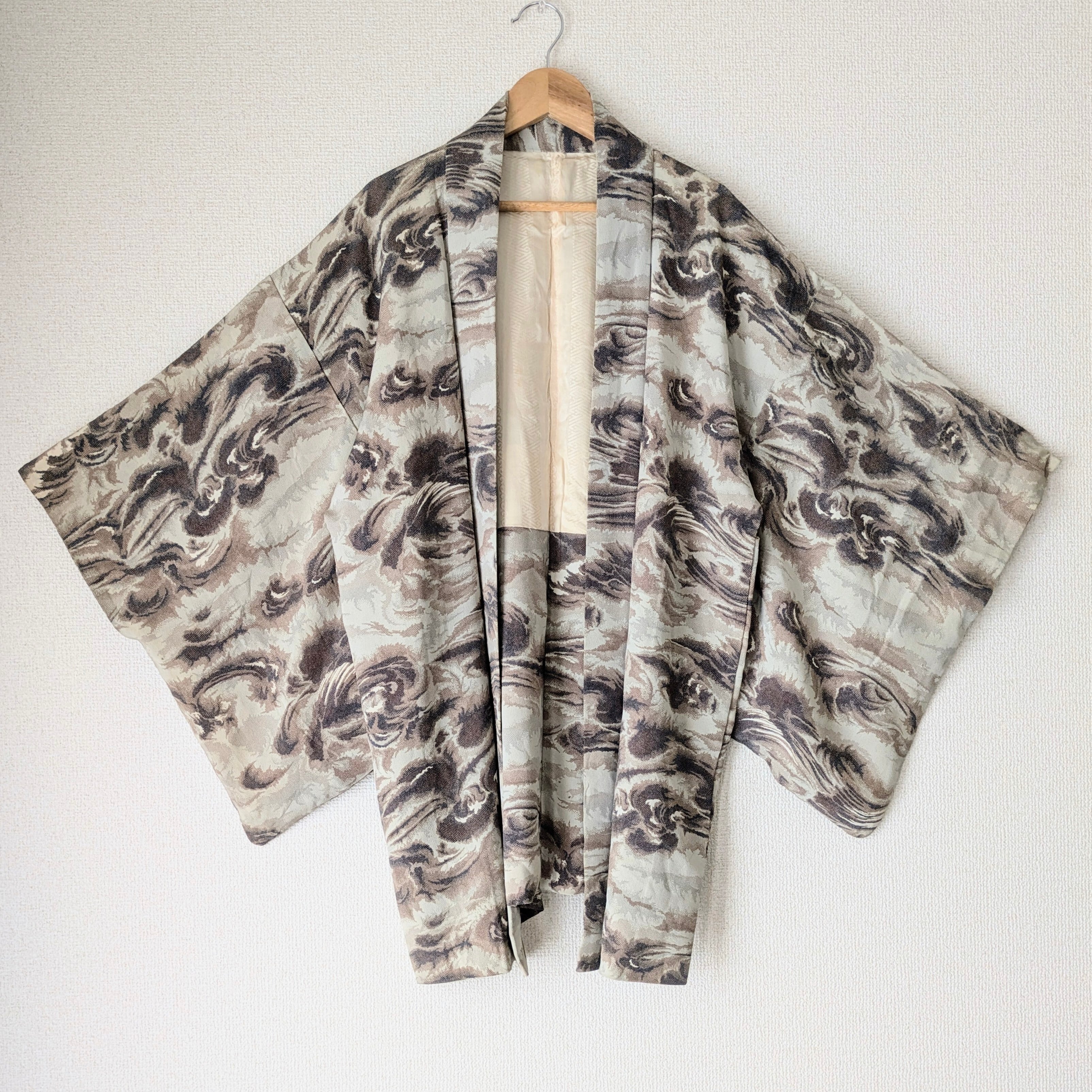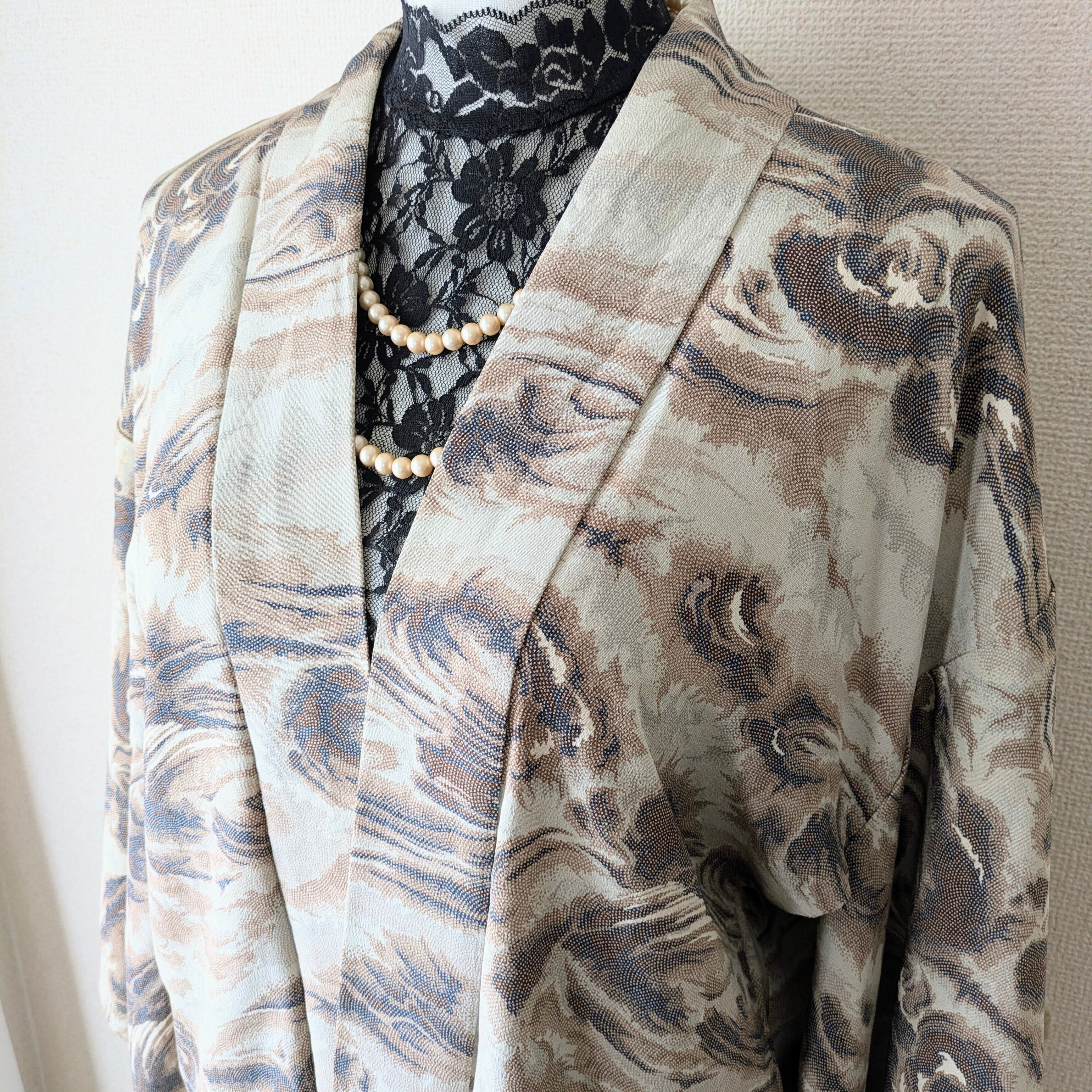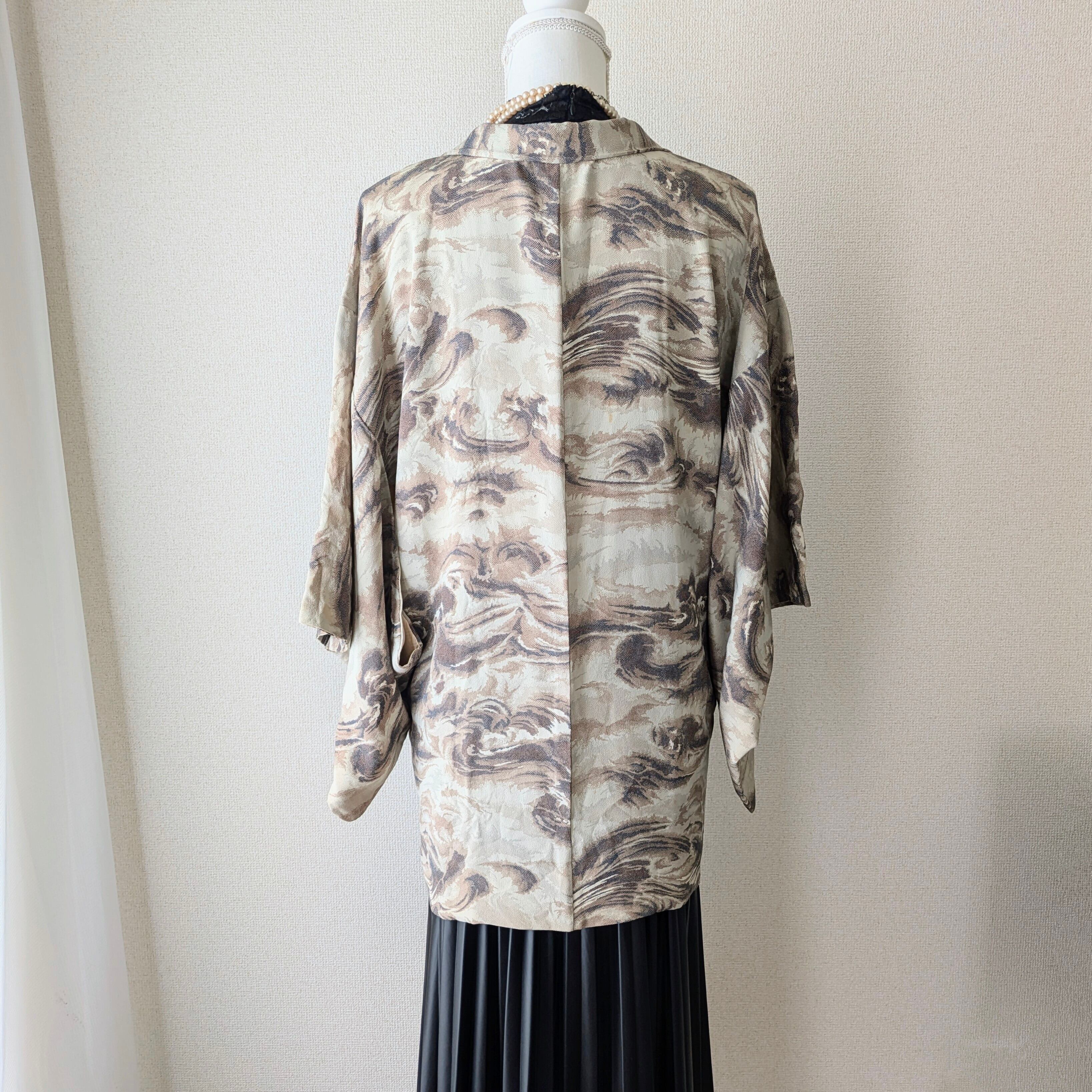 地模様には鮫小紋柄、躍動感のある荒波が羽織全体に描かれた縮緬の羽織です。