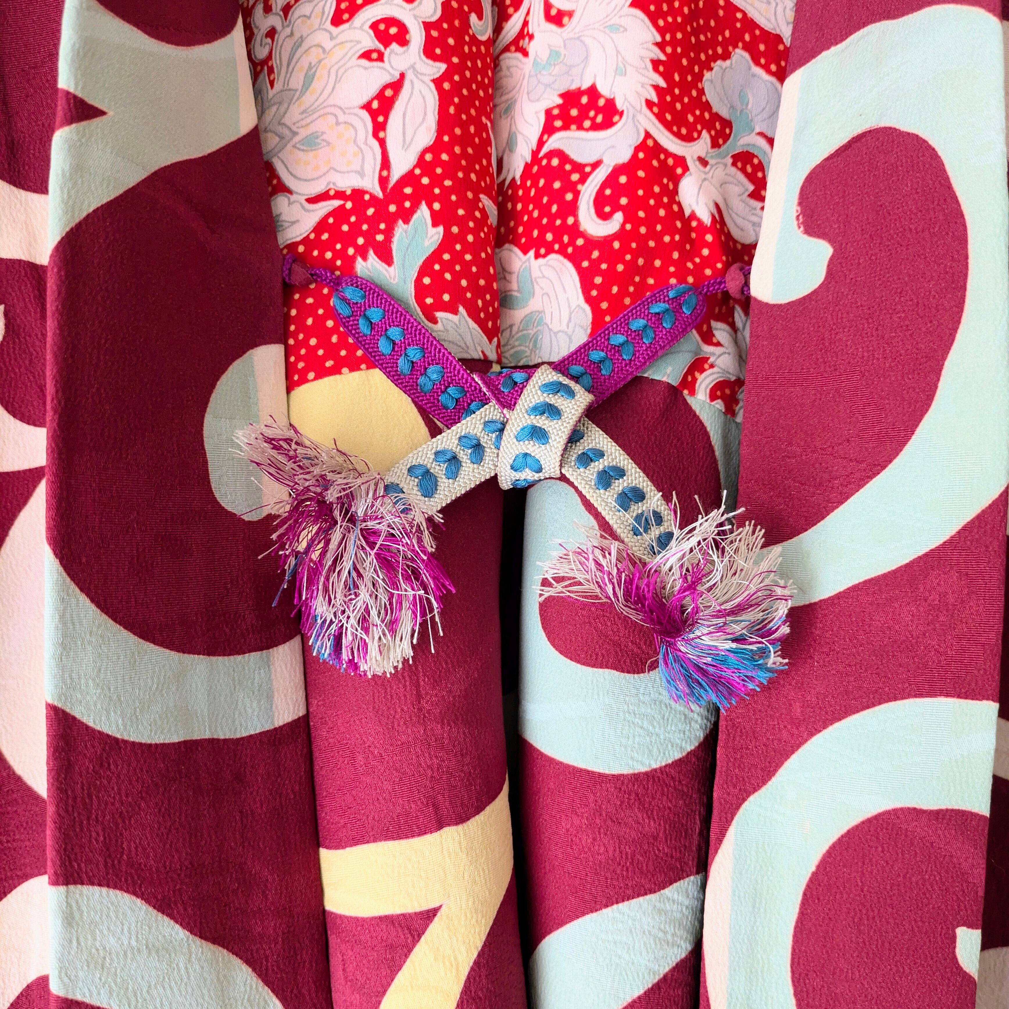 えんじ色に唐草模様が大胆にアレンジされた縮緬のやや厚手の長羽織です。
