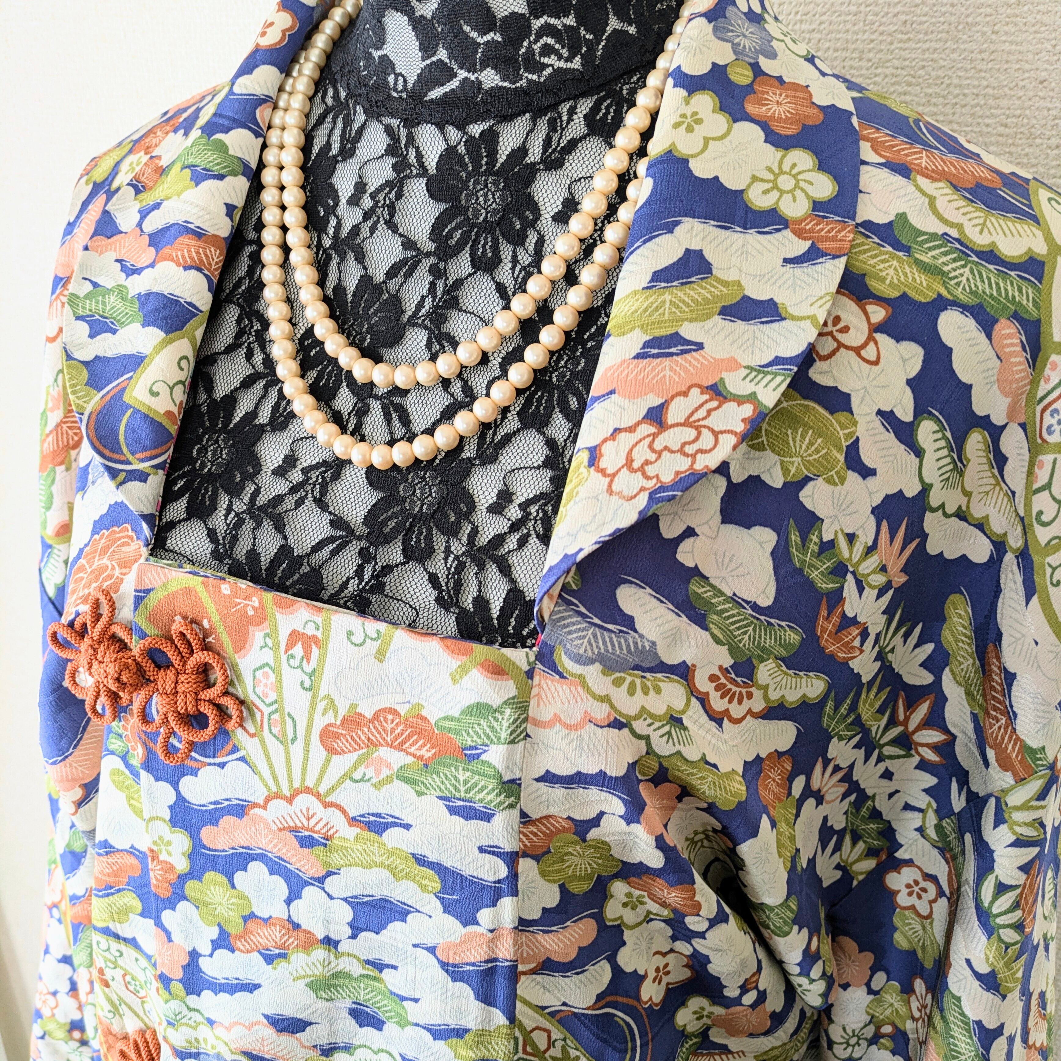 珍しい襟付きの道行コートです。柄はとても華やかな松竹梅の吉祥柄。