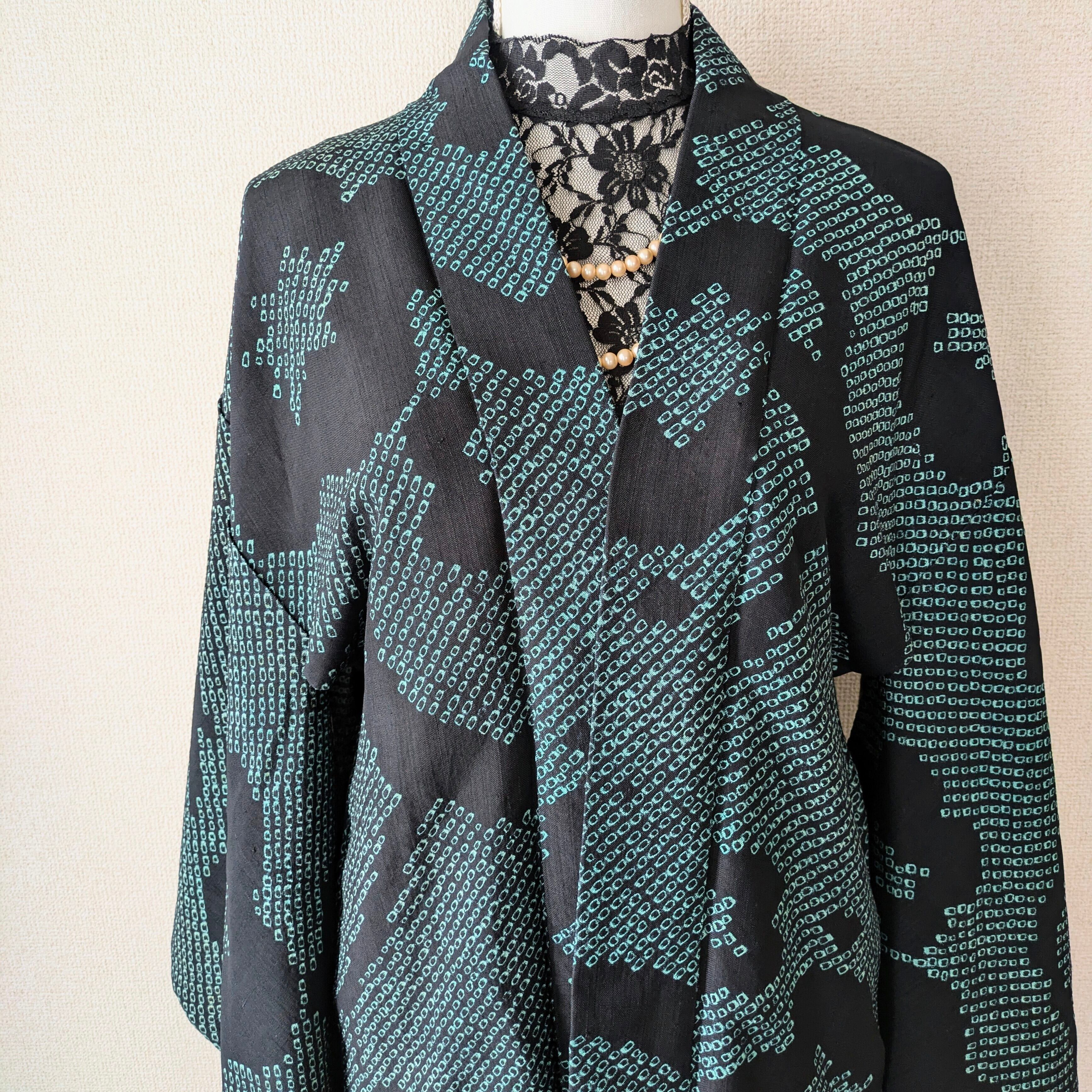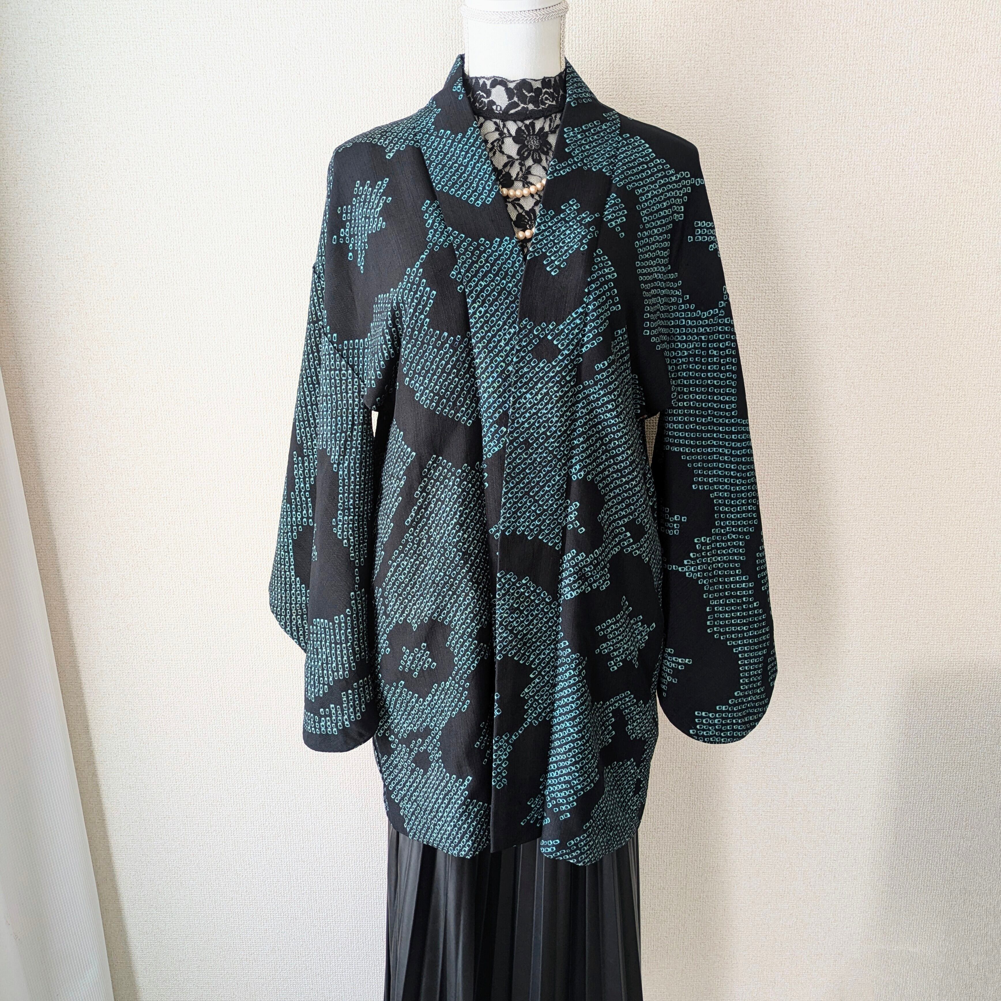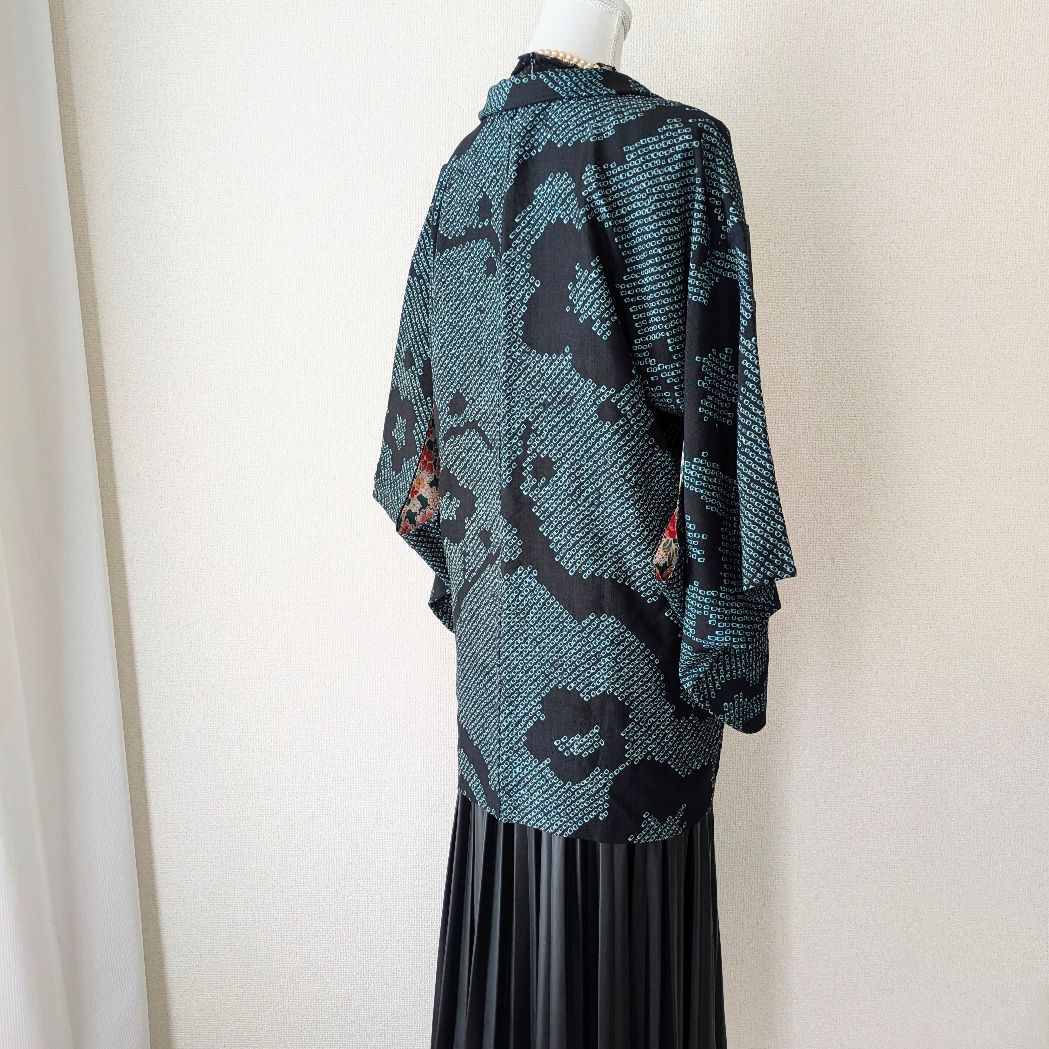 【Vintage】HAORI 長羽織 羽織 正絹 縮緬 黒 緑 梅の木 鹿の子 大正浪漫 古布 時代布 和洋折衷
