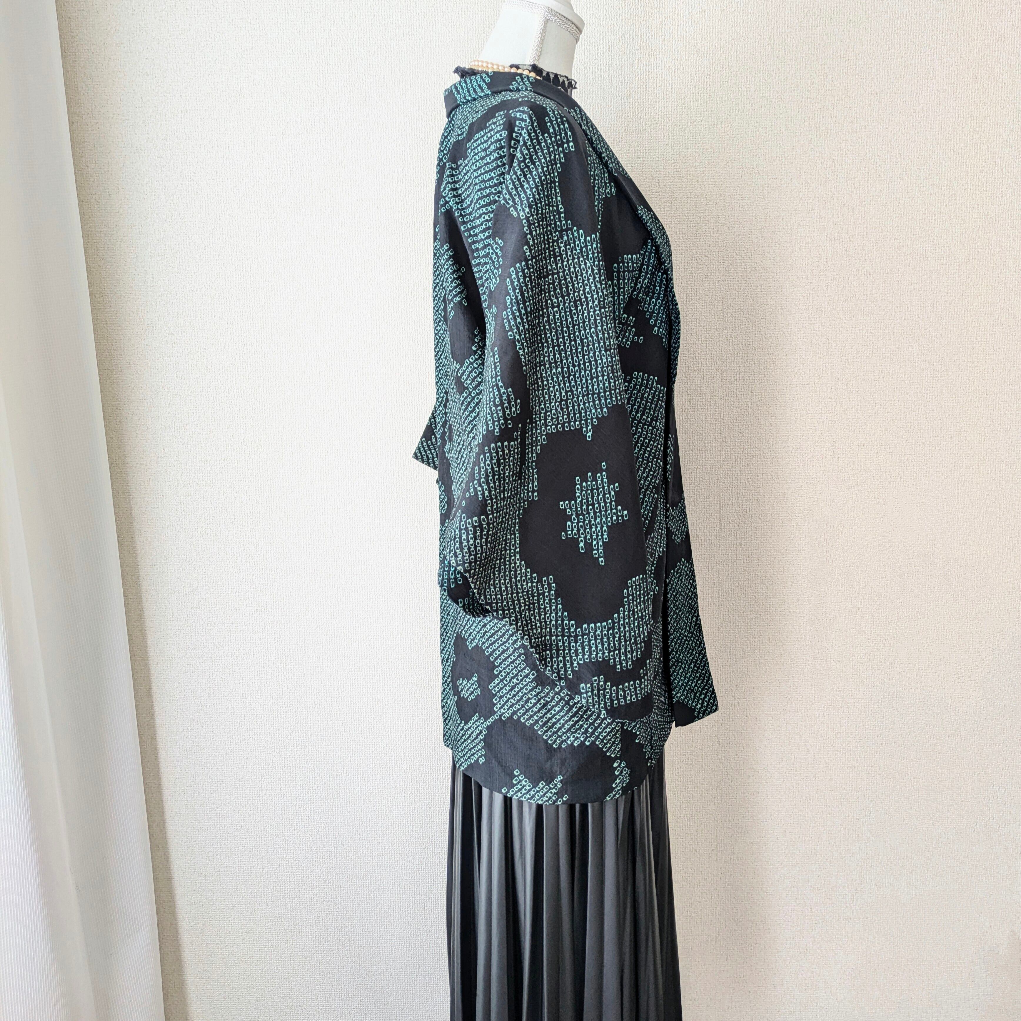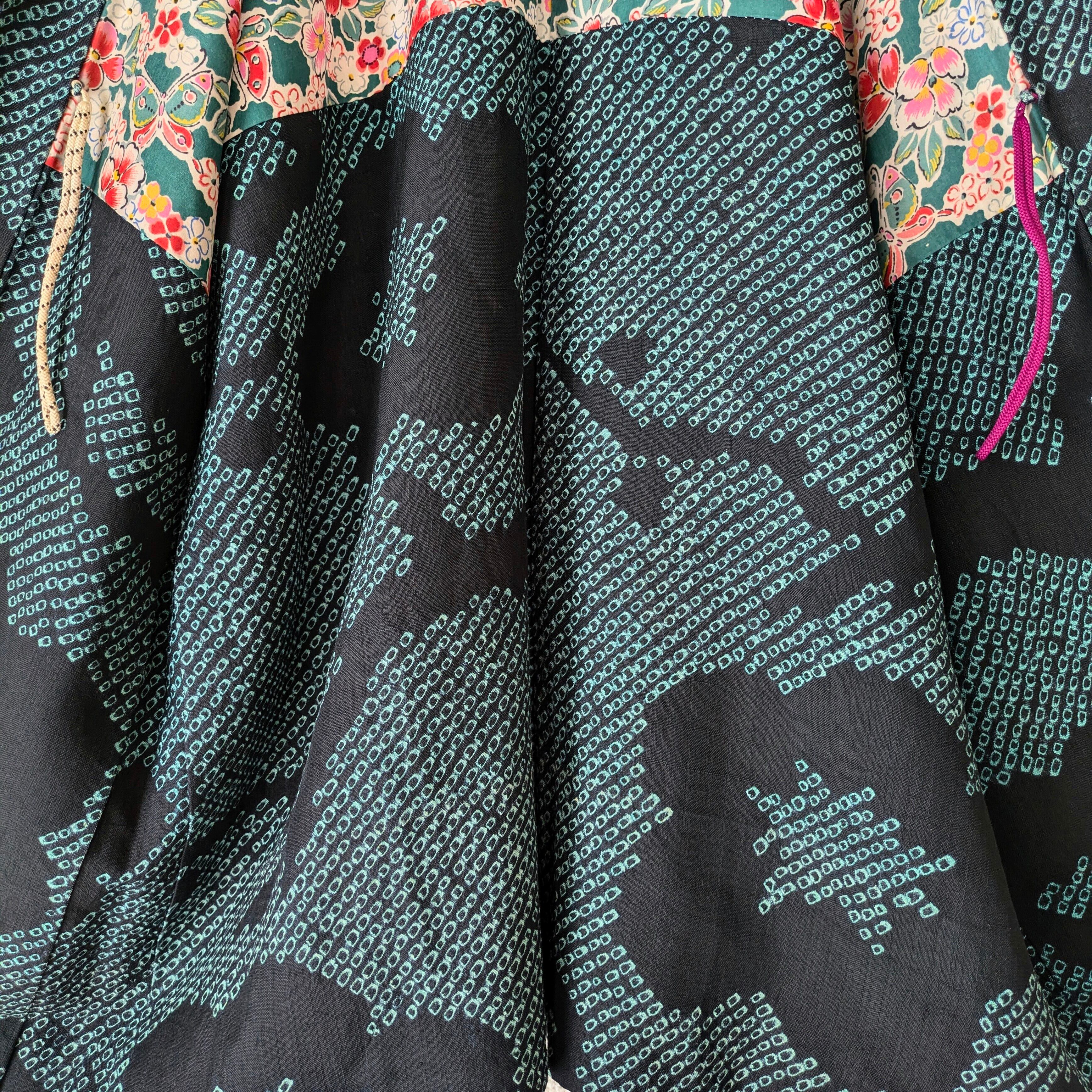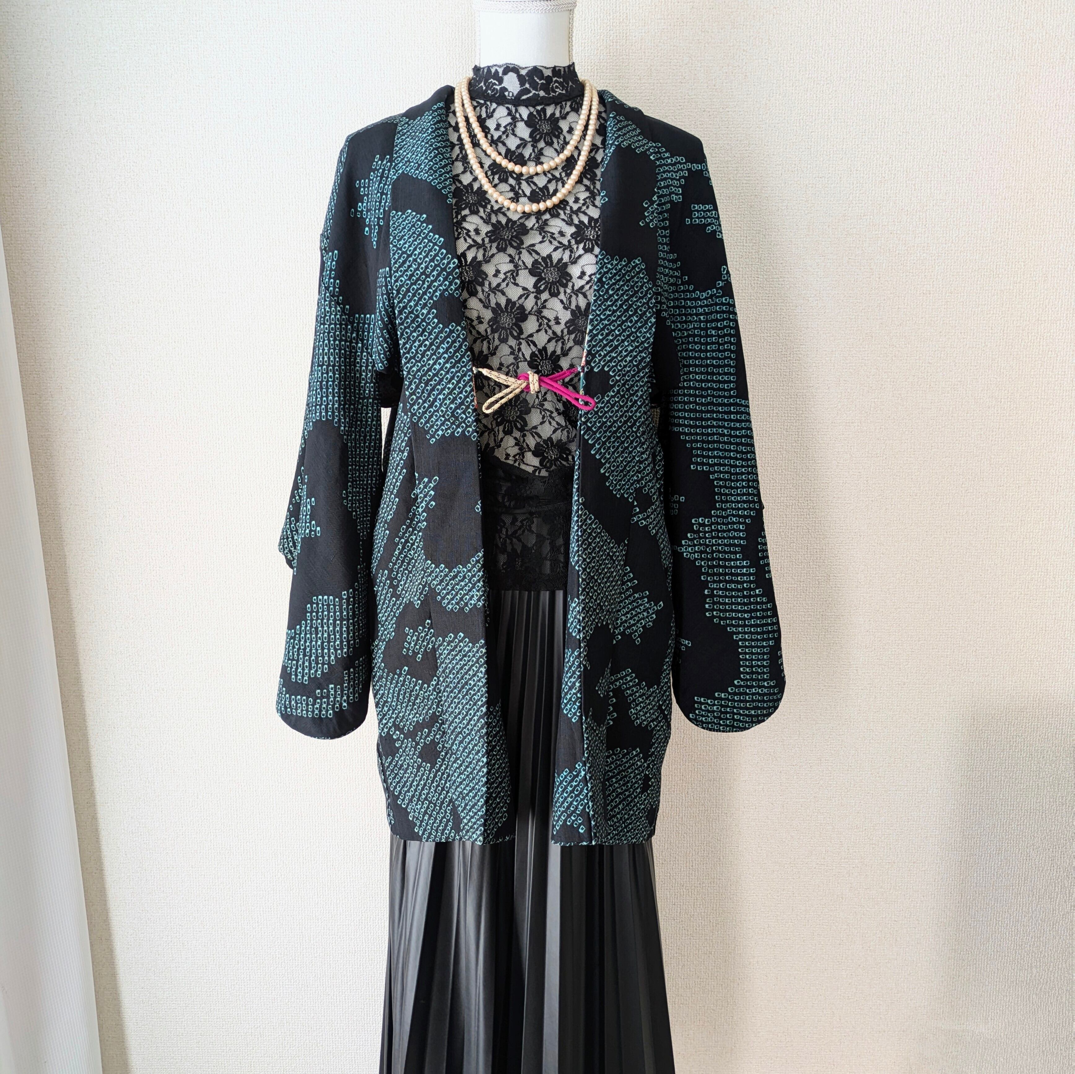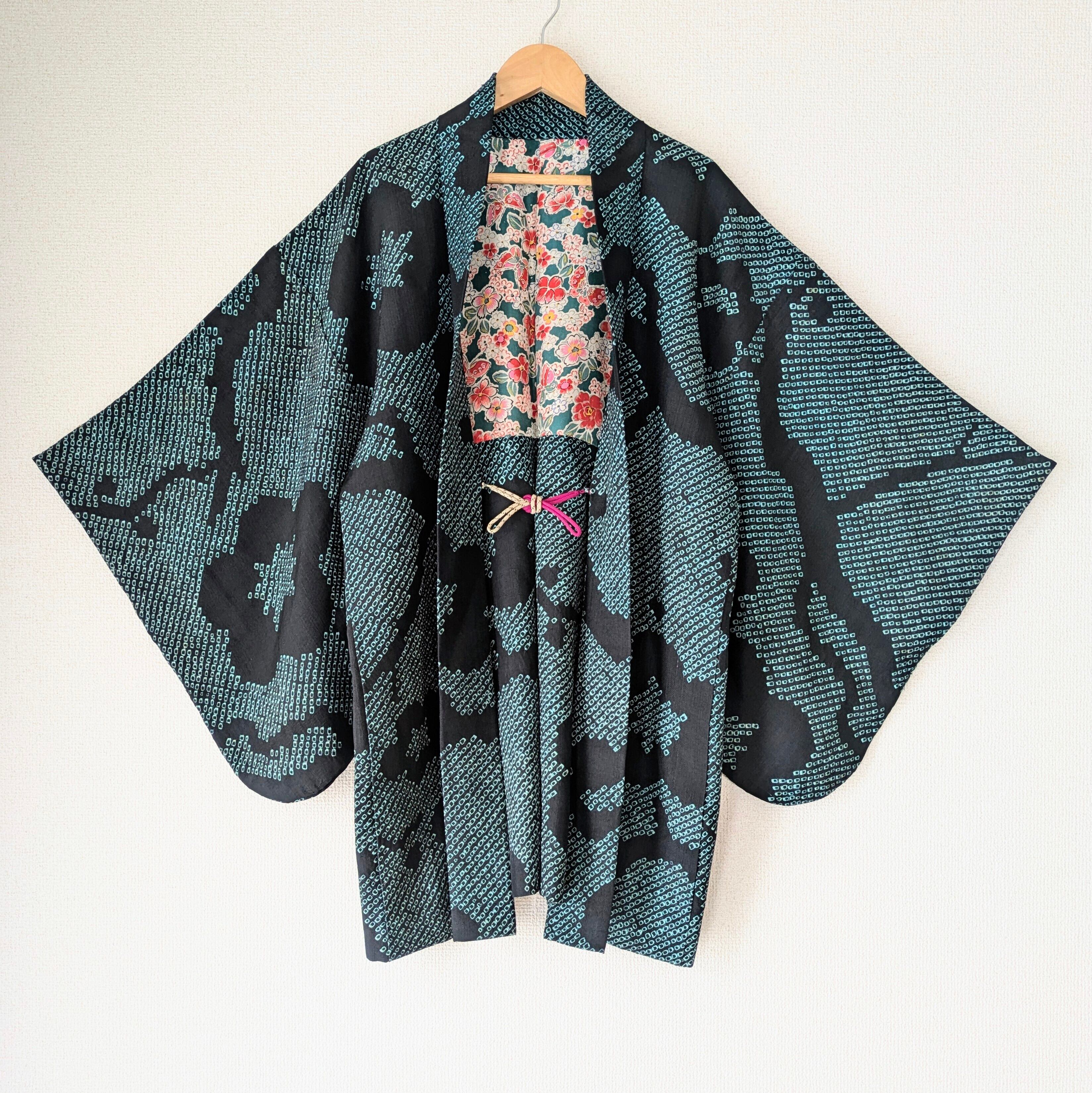 【Vintage】HAORI 長羽織 羽織 正絹 縮緬 黒 緑 梅の木 鹿の子 大正浪漫 古布 時代布 和洋折衷