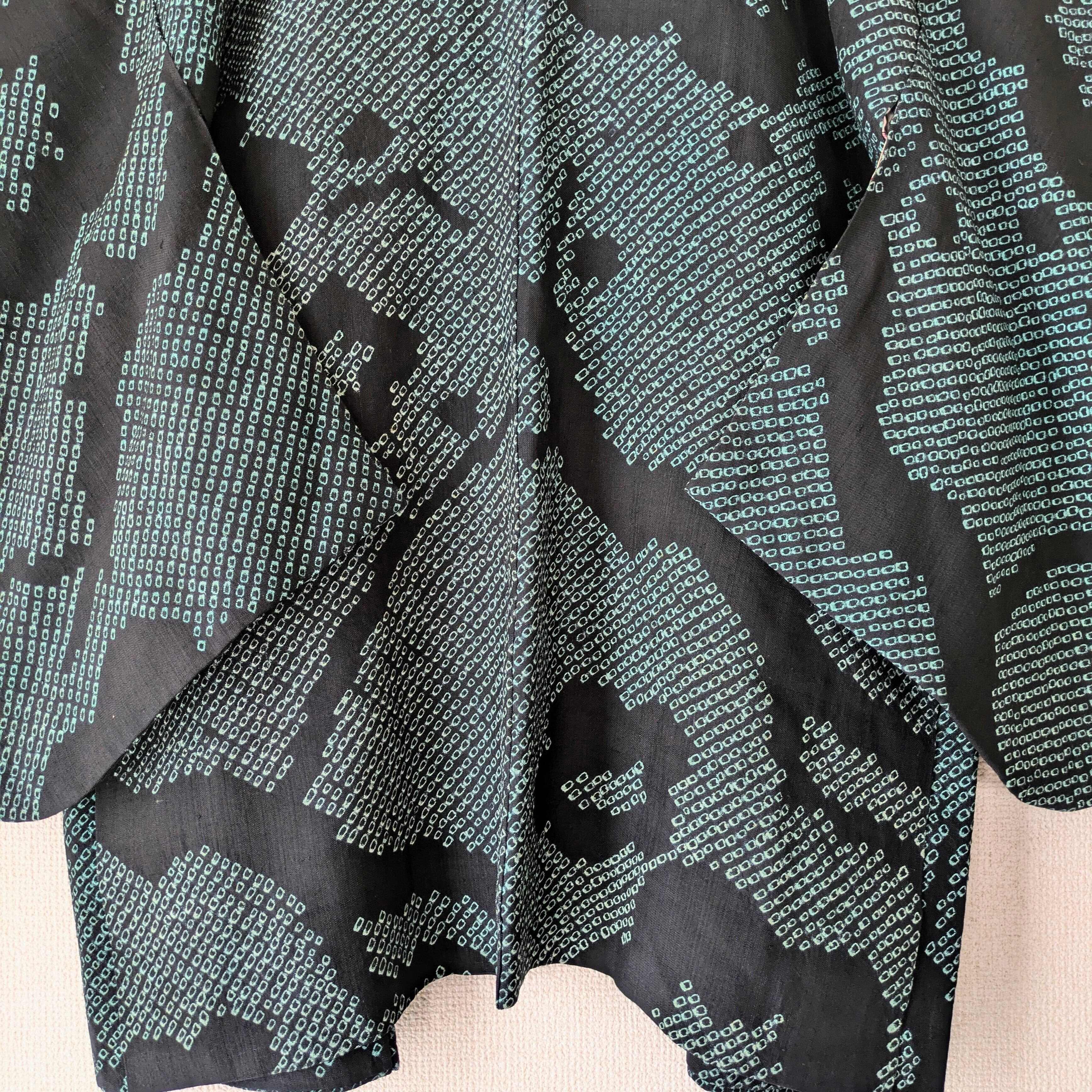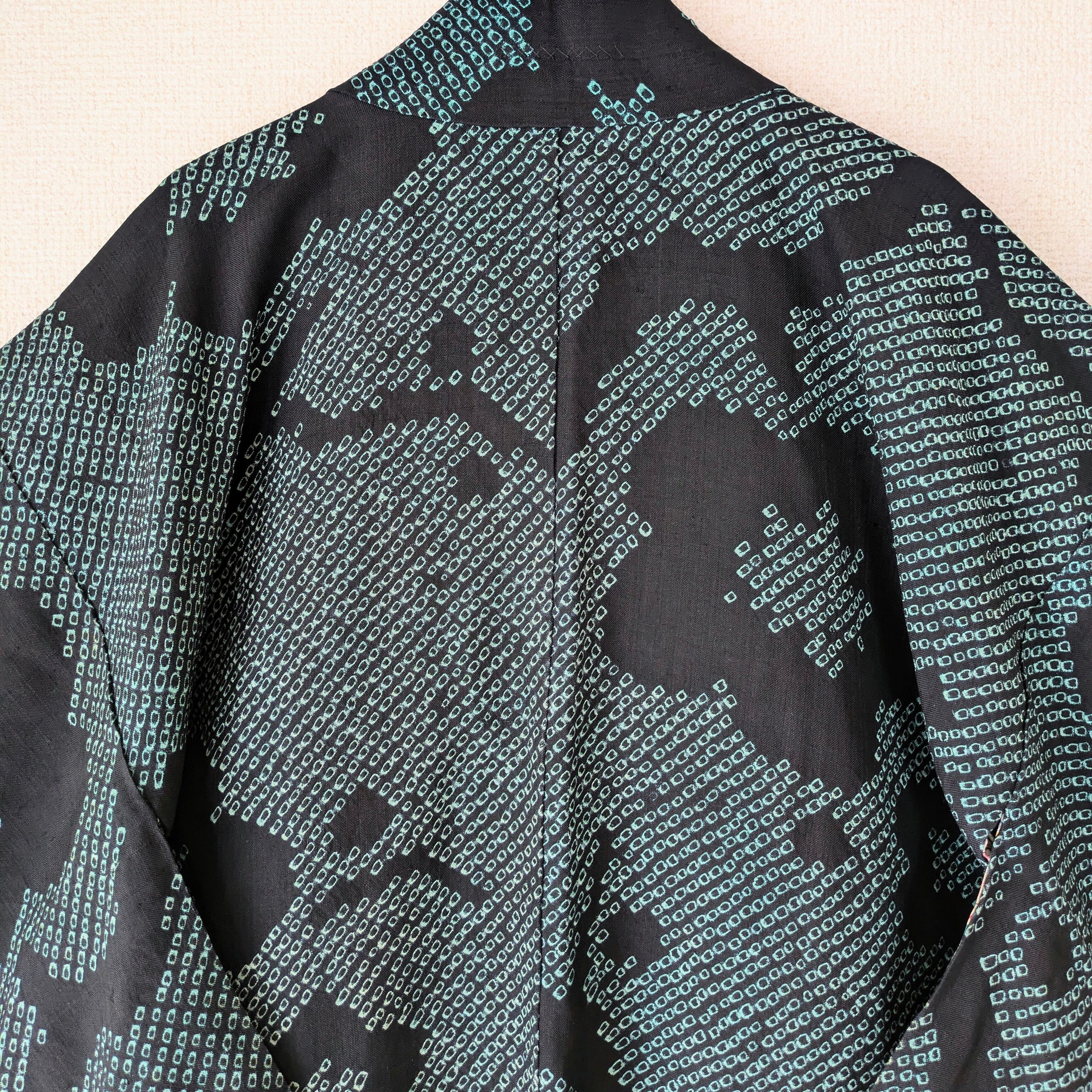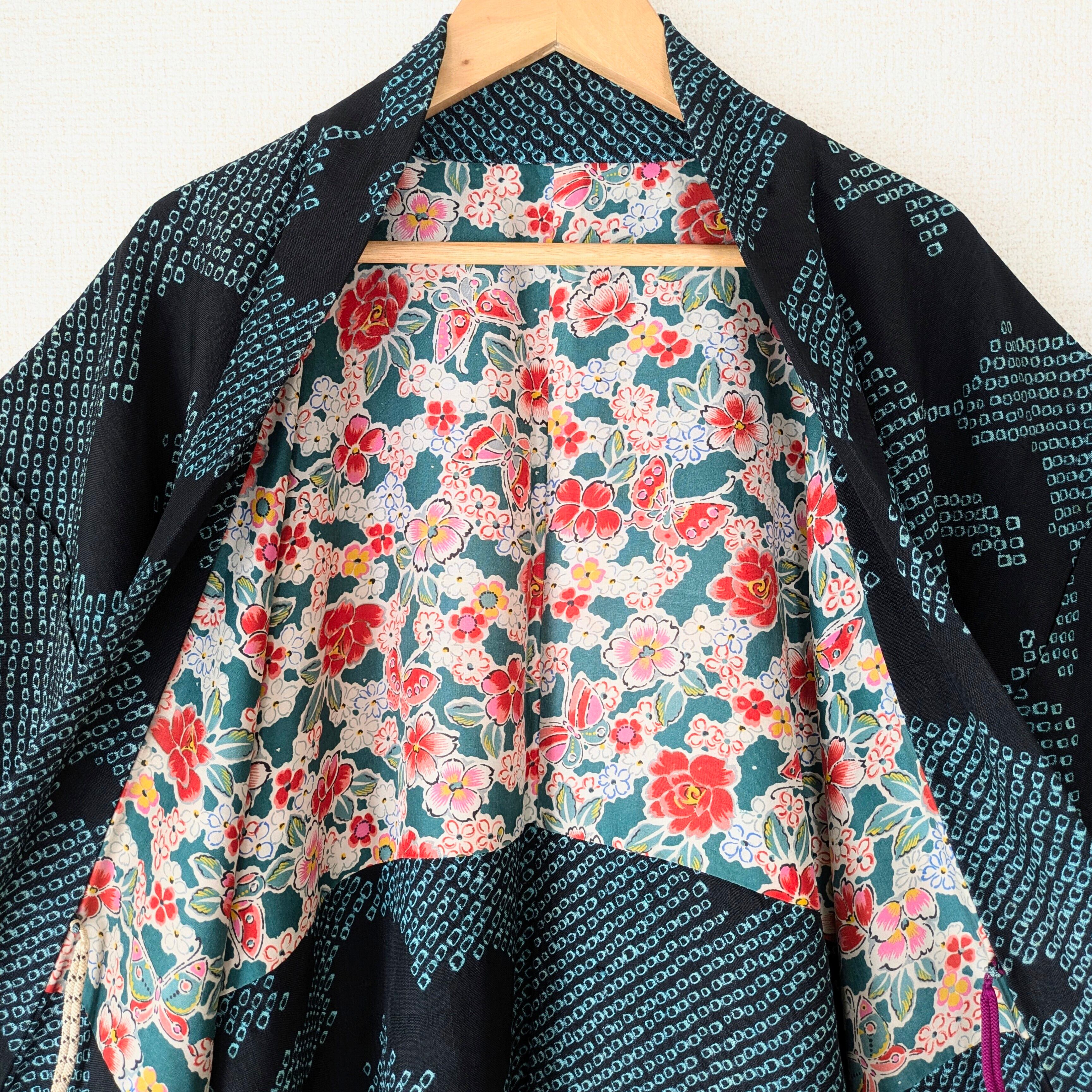 黒と緑の鹿の子絞りで表現された梅の木が羽織全体にデザインされた縮緬の長羽織です。表地の渋い色味に羽裏の華やかさが引き立ちます。特筆すべきダメージもなく良好な逸品です。
