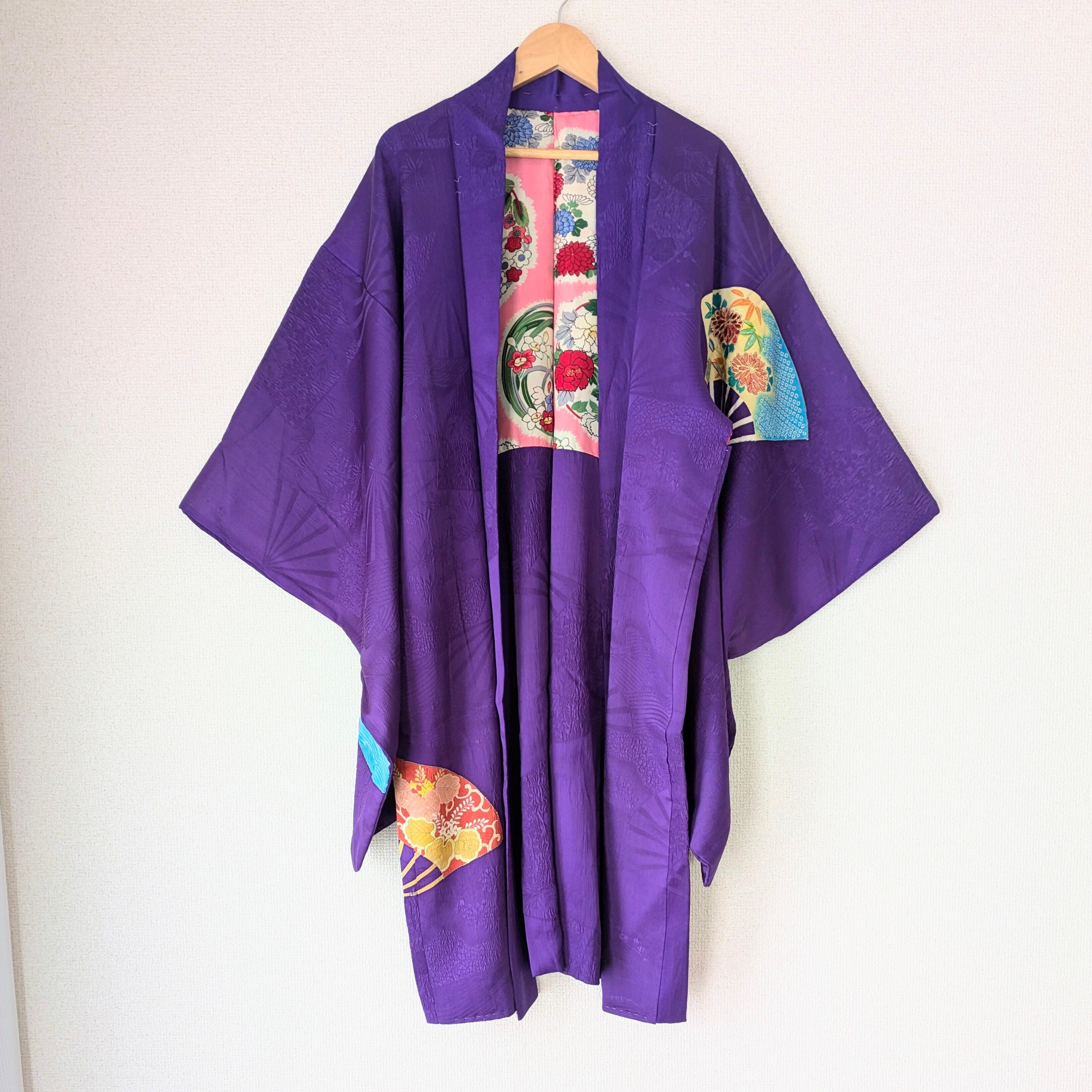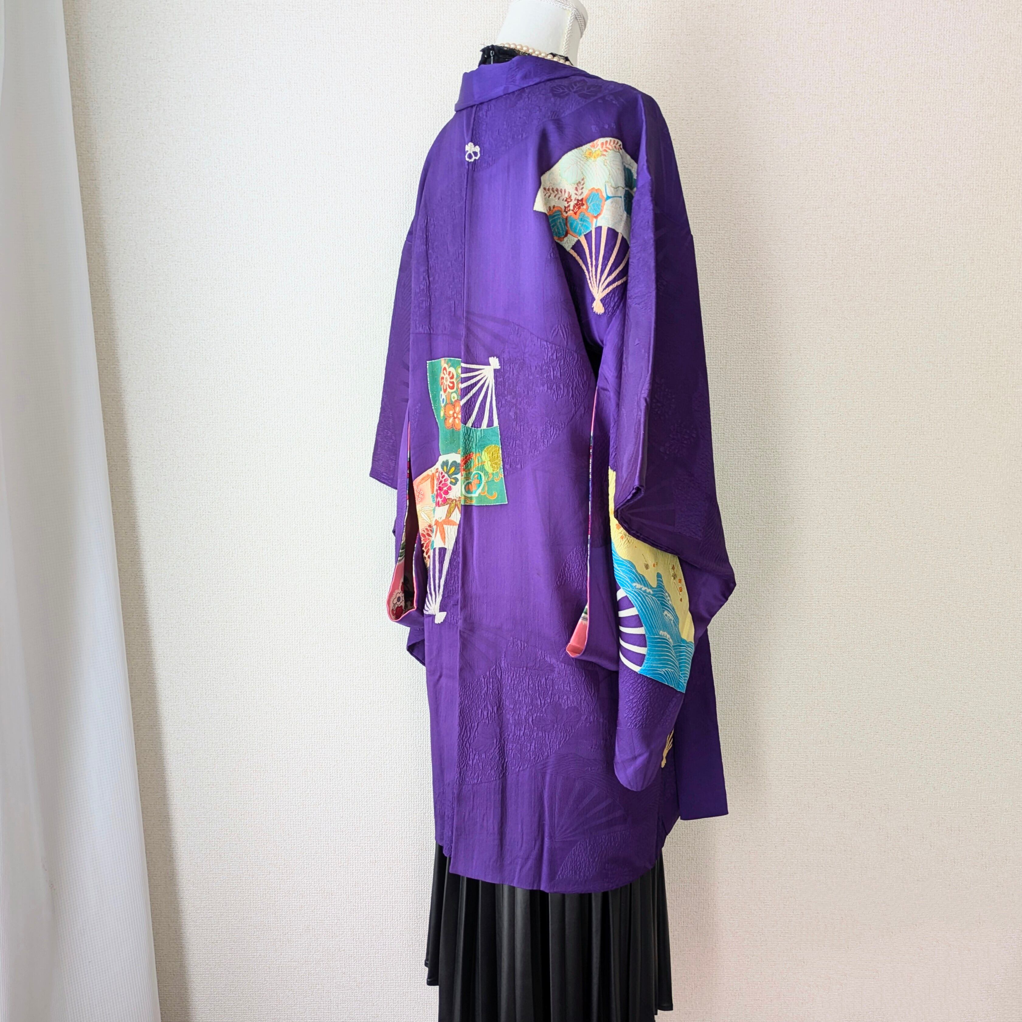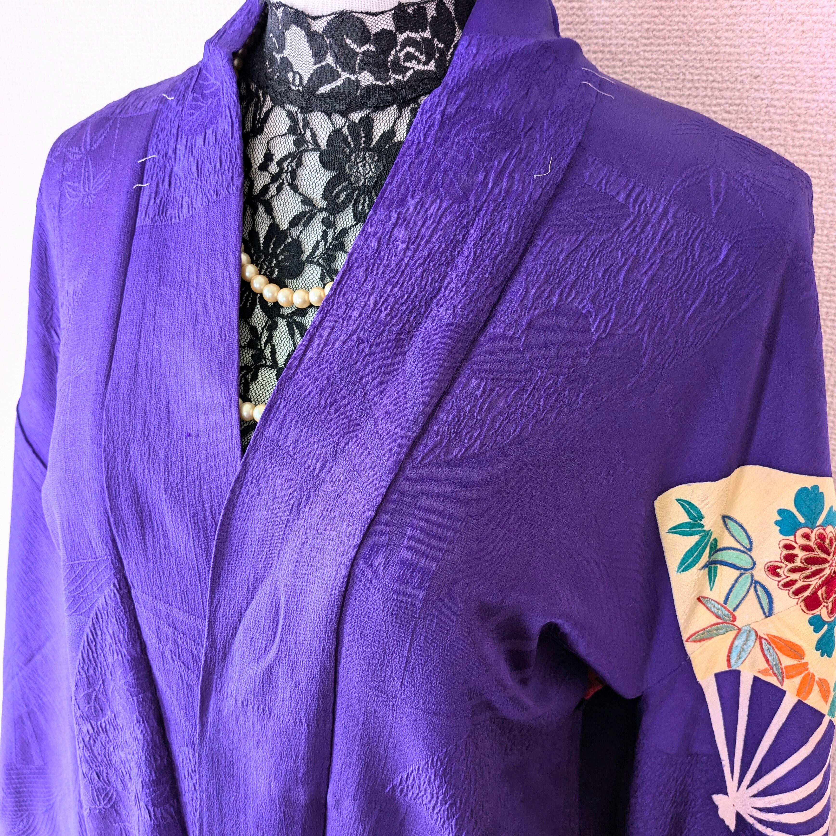 【Vintage】HAORI 長羽織 羽織 正絹 縮緬 江戸紫 舞扇 手刺繍 大正浪漫 古布 時代布 和洋折衷