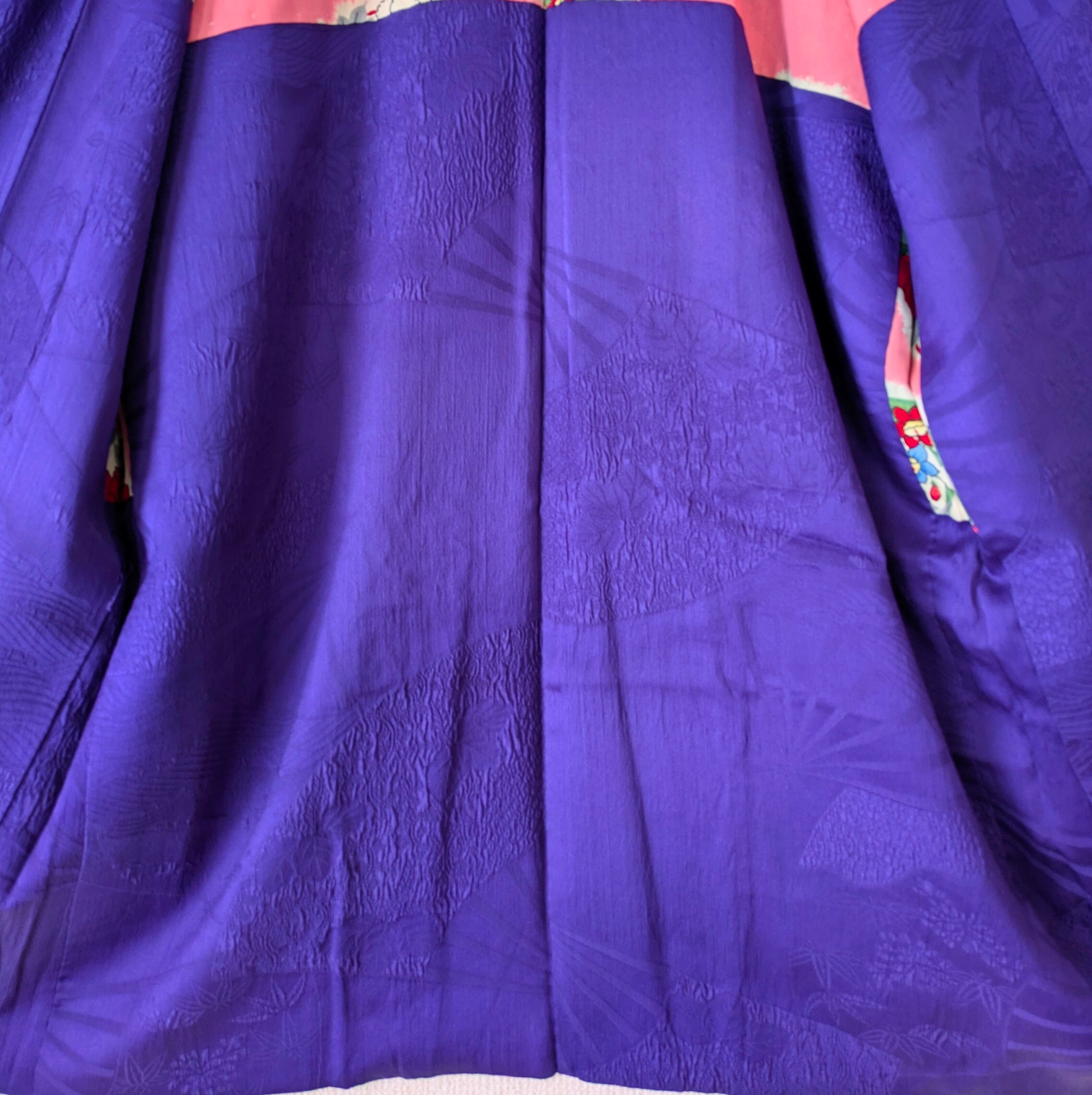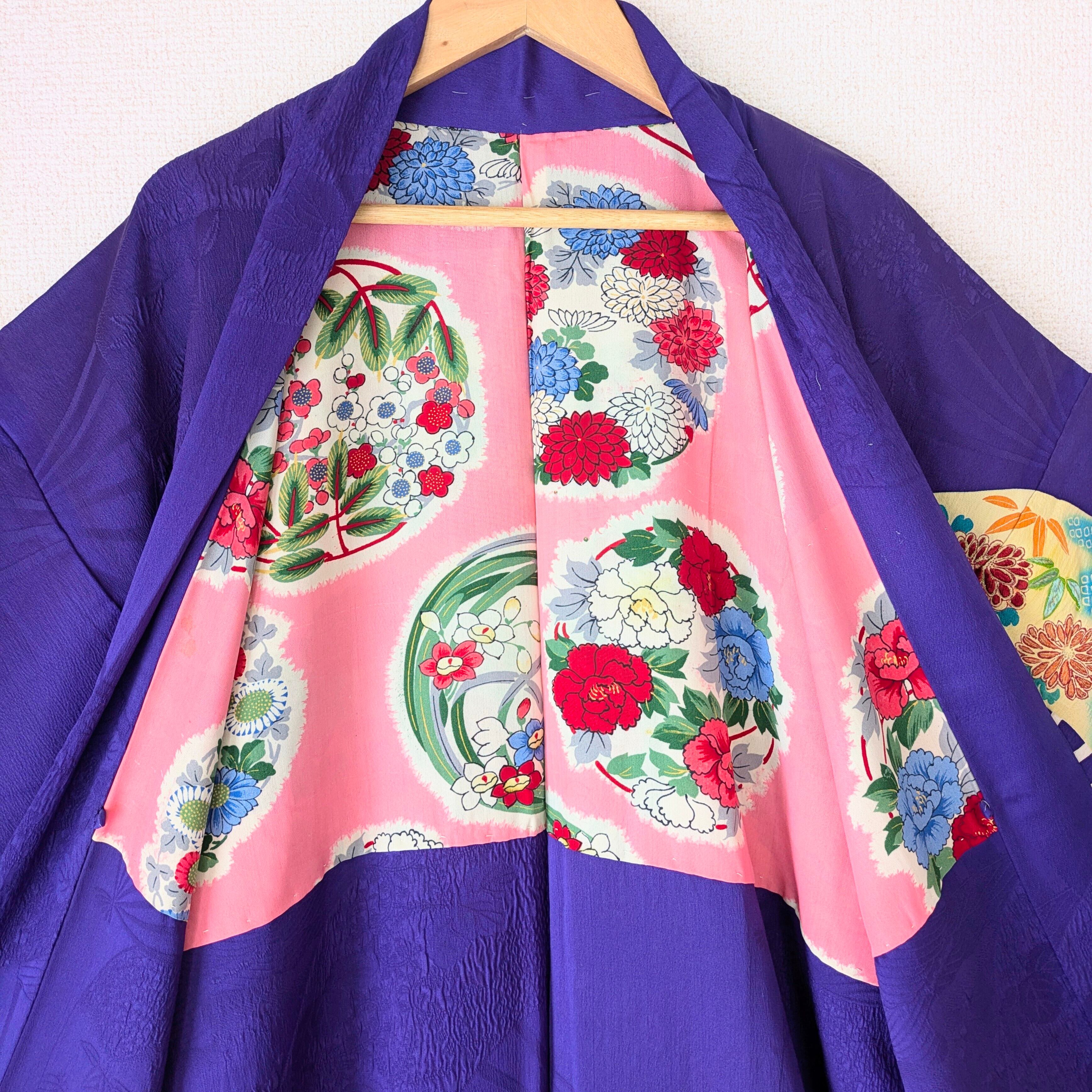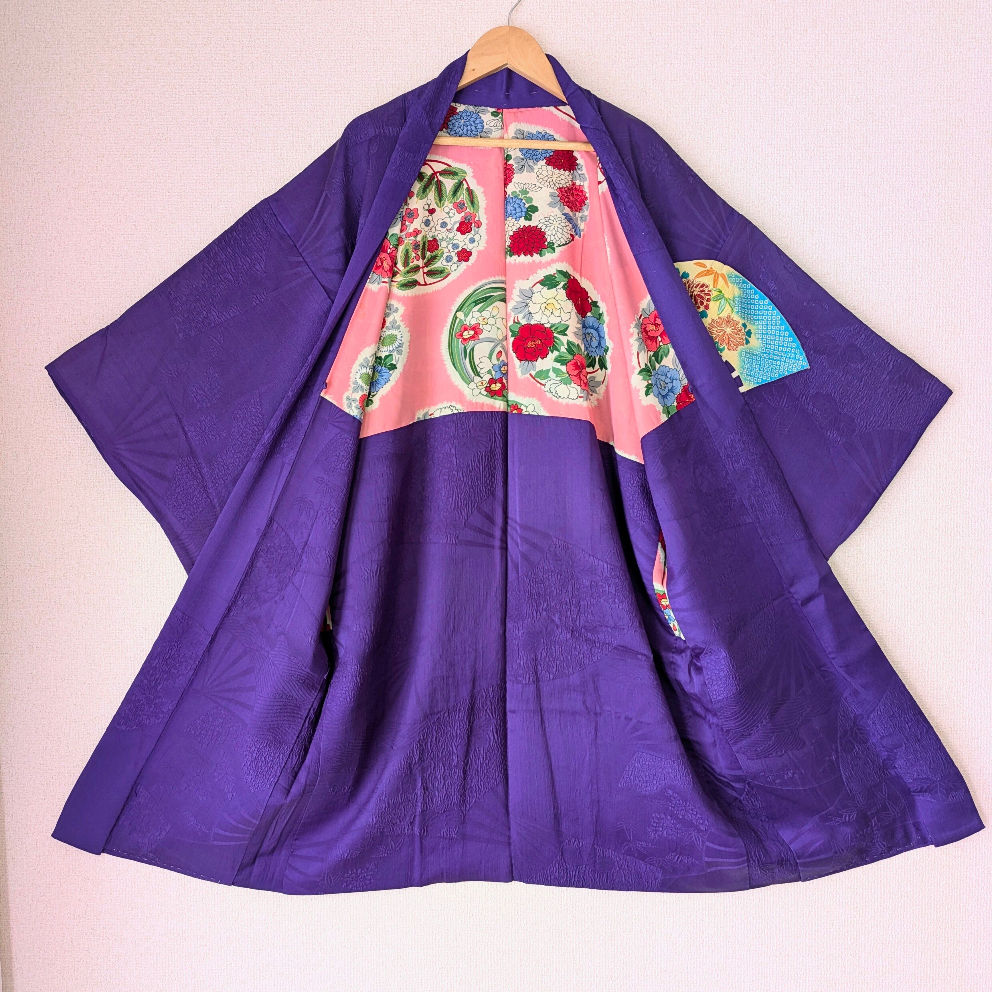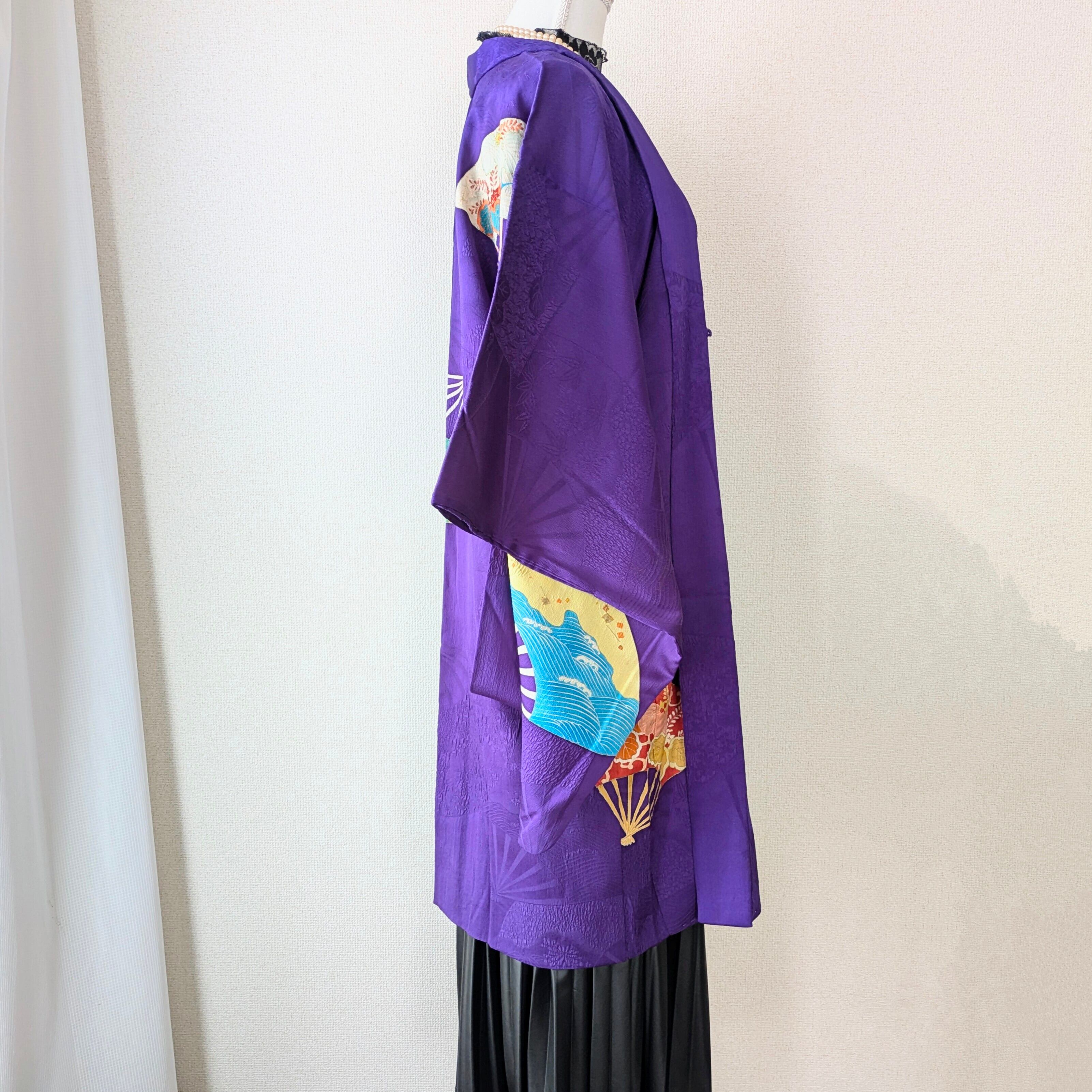 【Vintage】HAORI 長羽織 羽織 正絹 縮緬 江戸紫 舞扇 手刺繍 大正浪漫 古布 時代布 和洋折衷