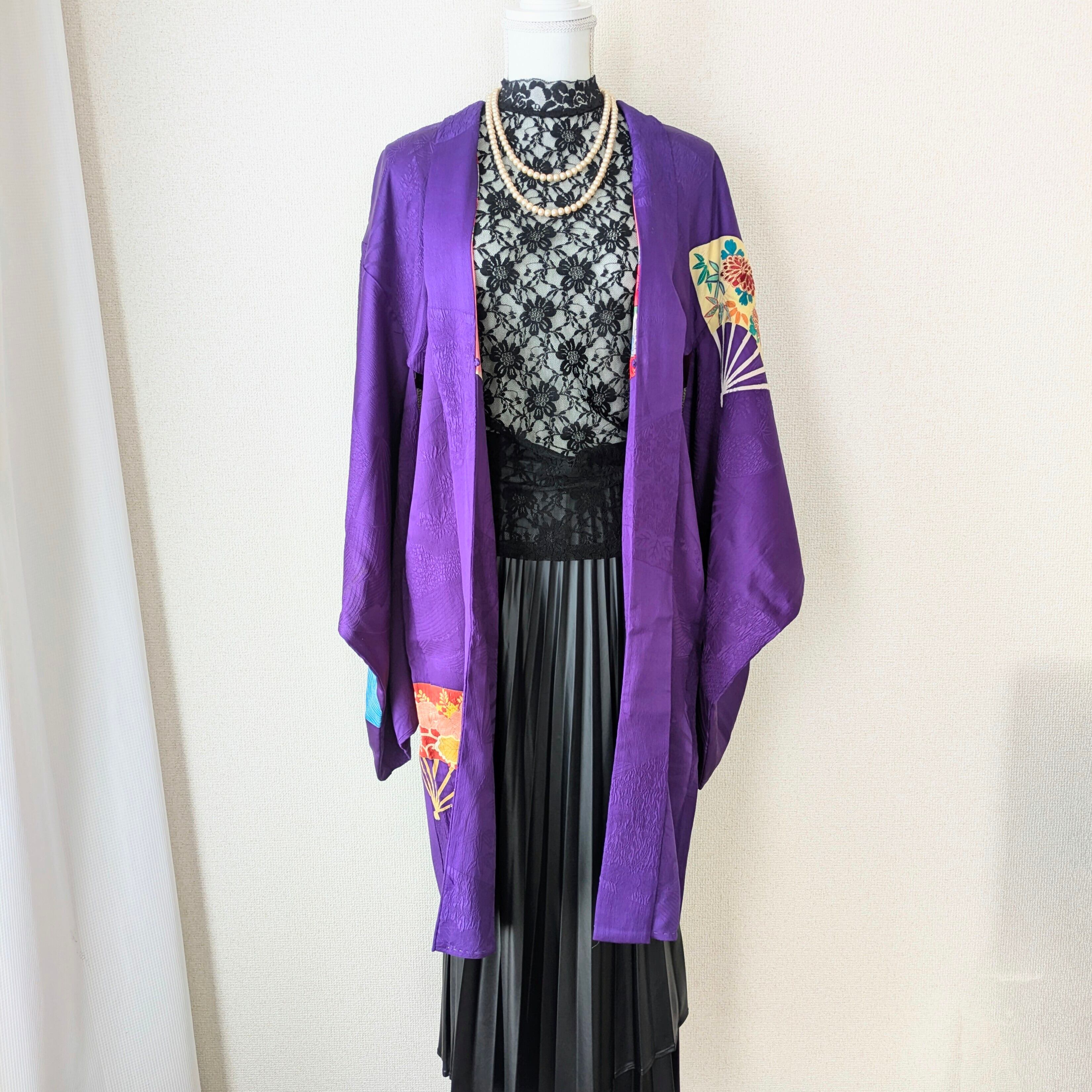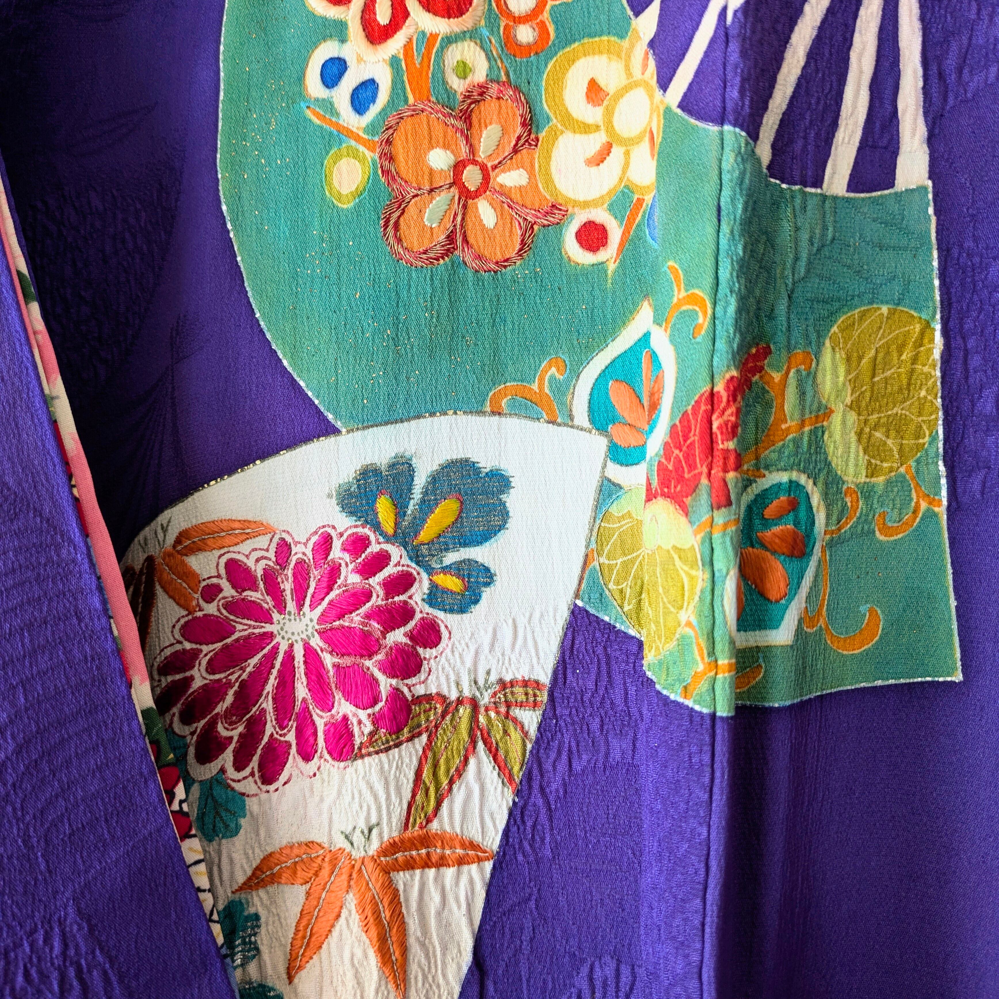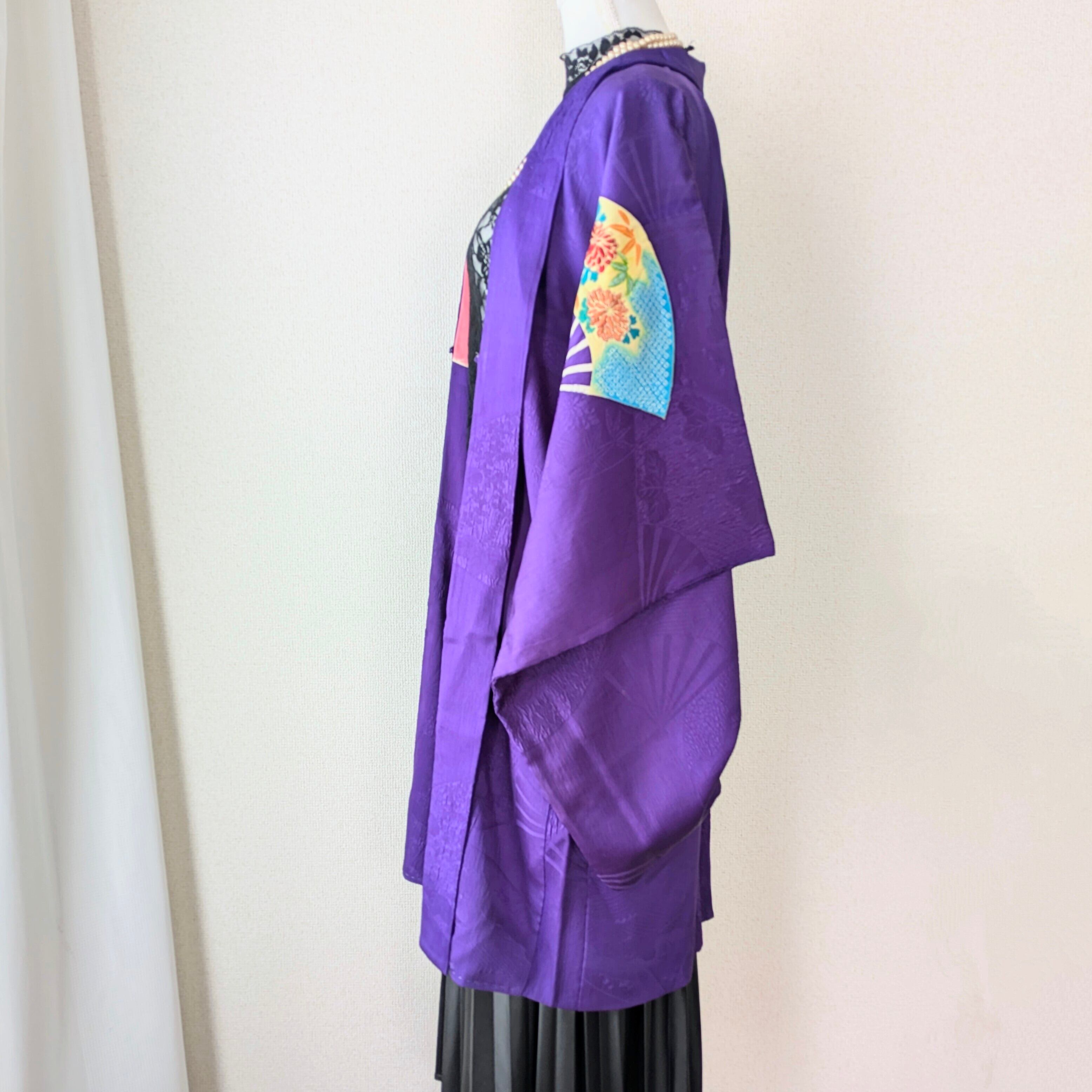 手描きの花扇柄の上に細やかな手刺繍が施されており、地紋にも扇柄の入った江戸紫色の長羽織です。
