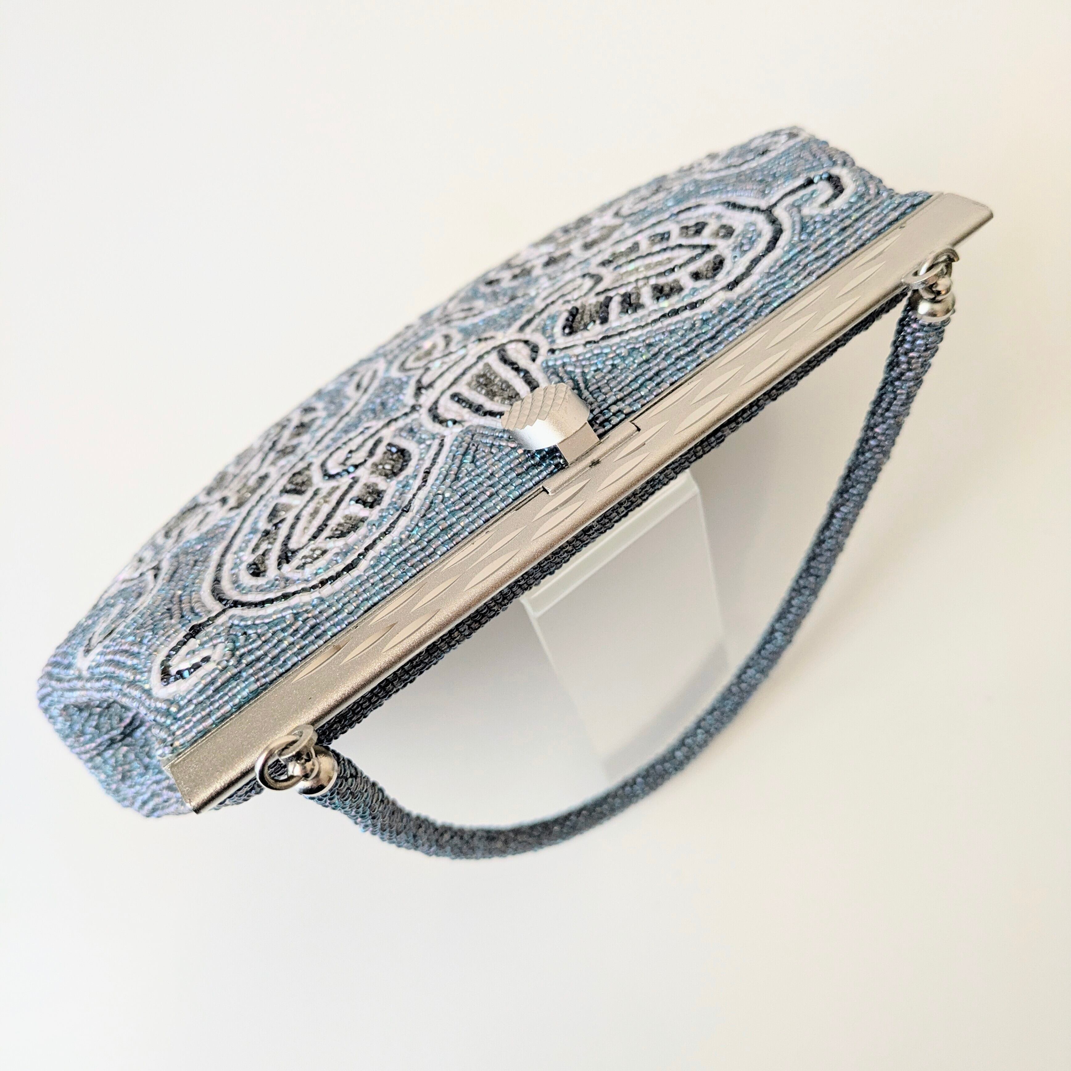 規則的に織り込まれた美しい幾何学模様のビーズバッグです。