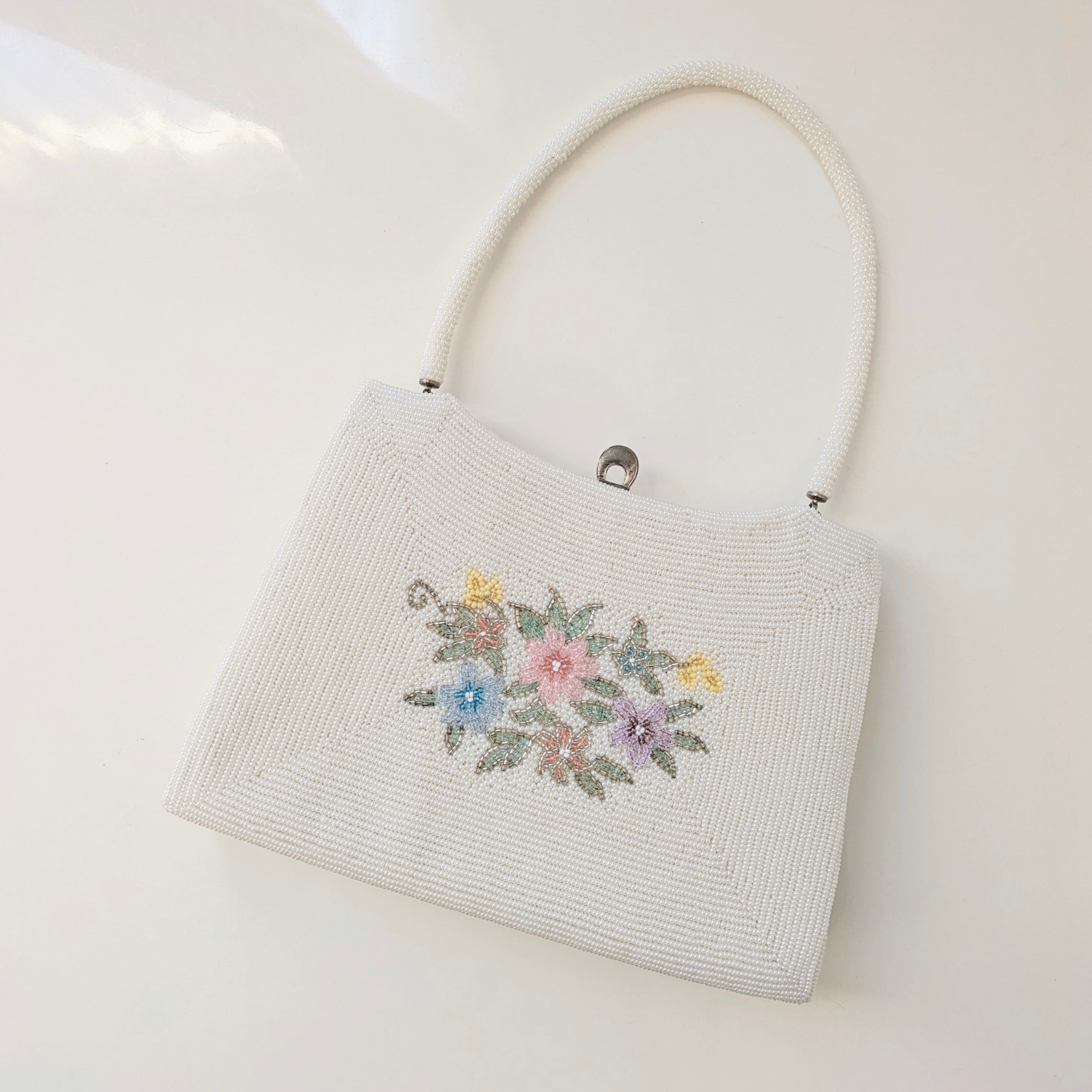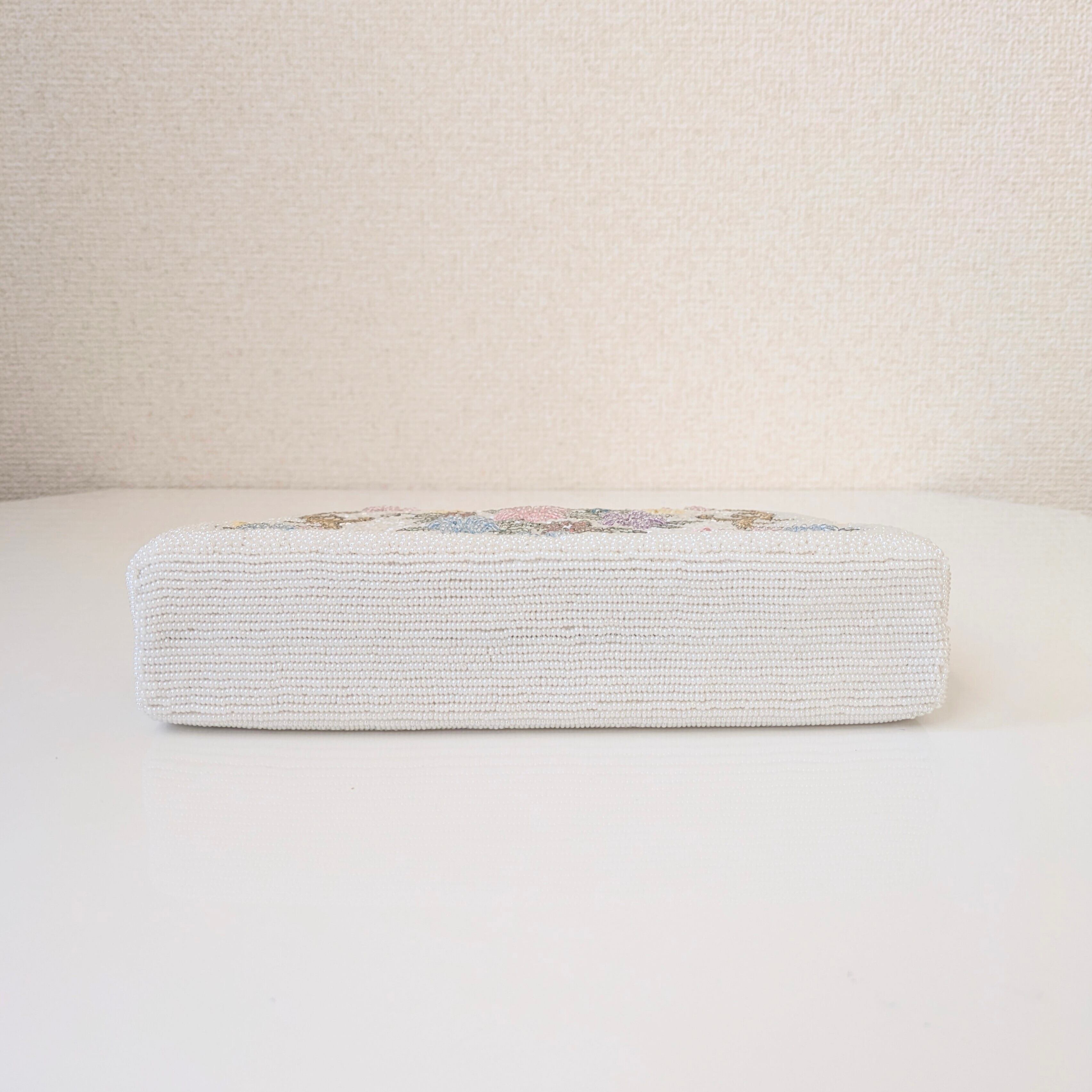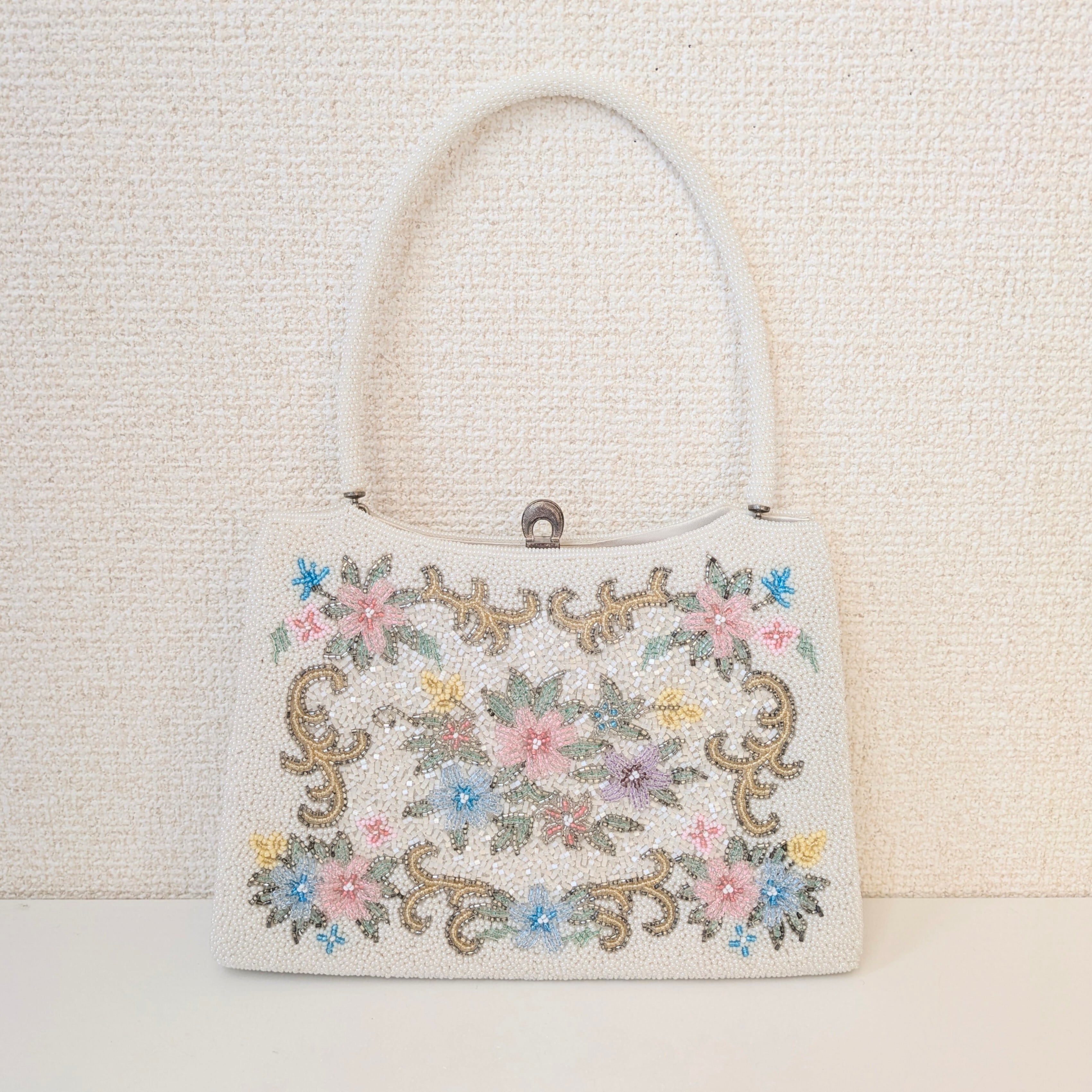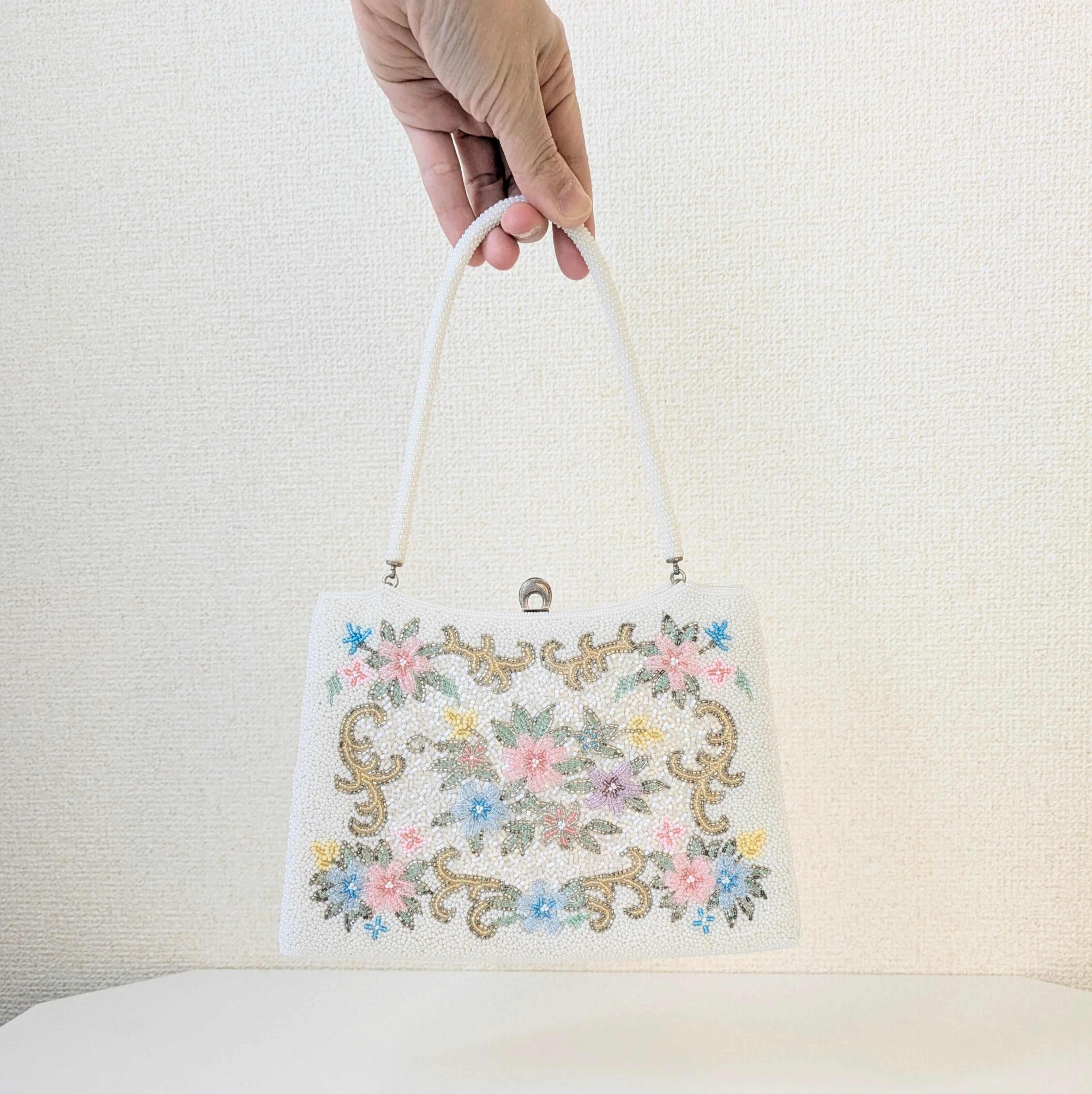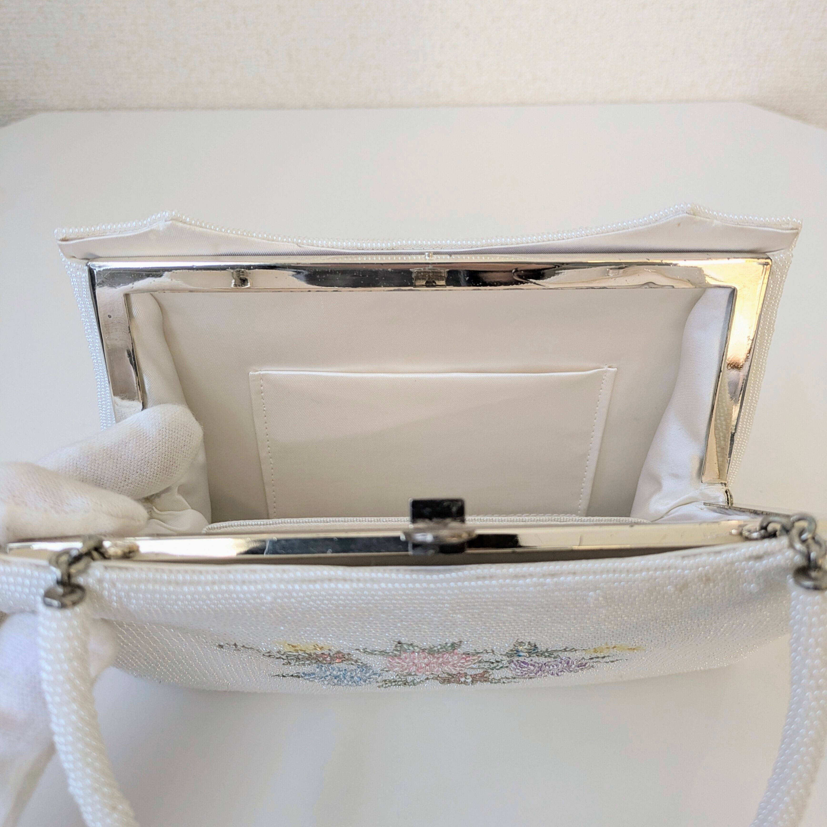 【Vintage】ビーズ刺繍バッグ 白 花柄 豪華 Princess TOKYO パーティーバッグ 昭和レトロ 大正浪漫 フォーマルバッグ
