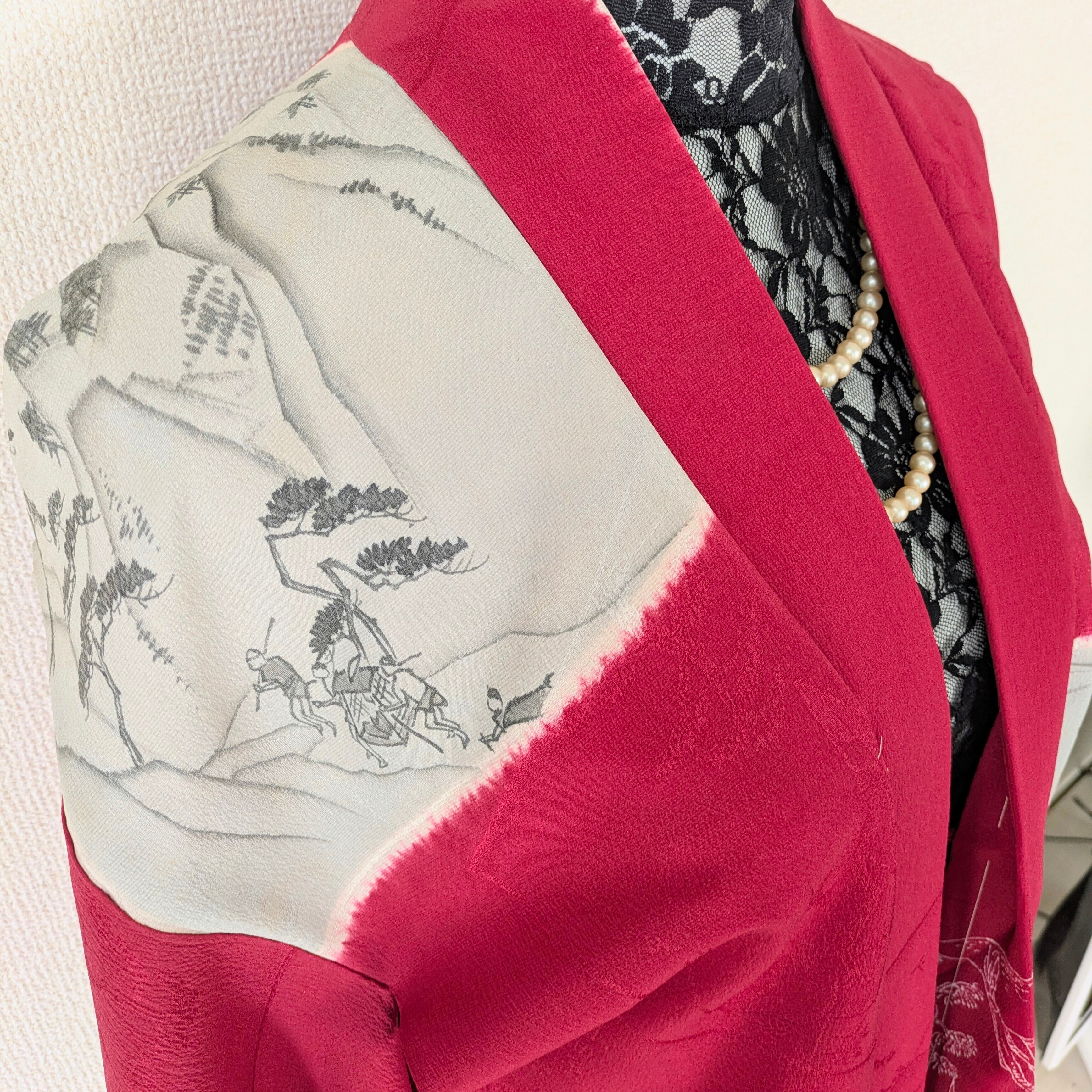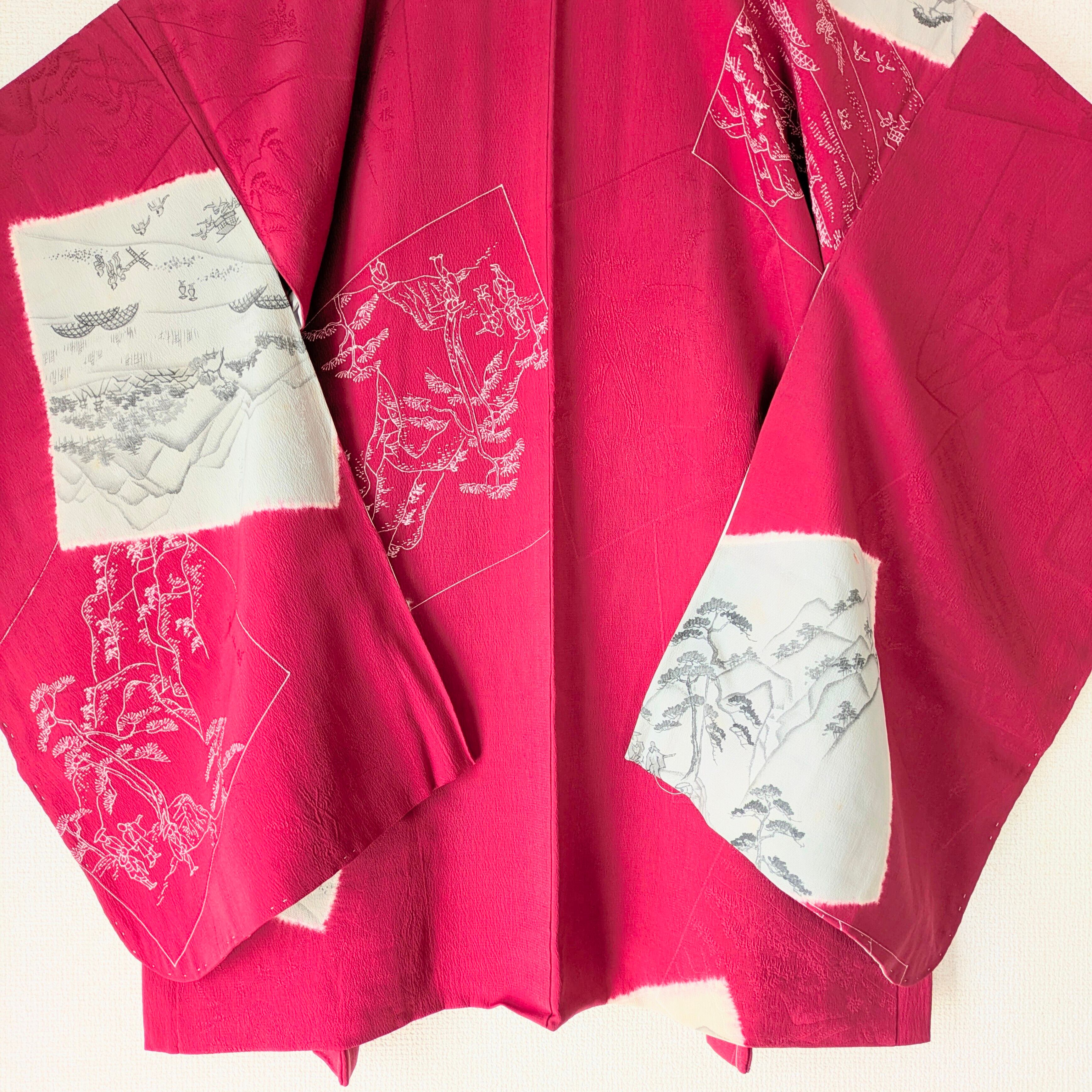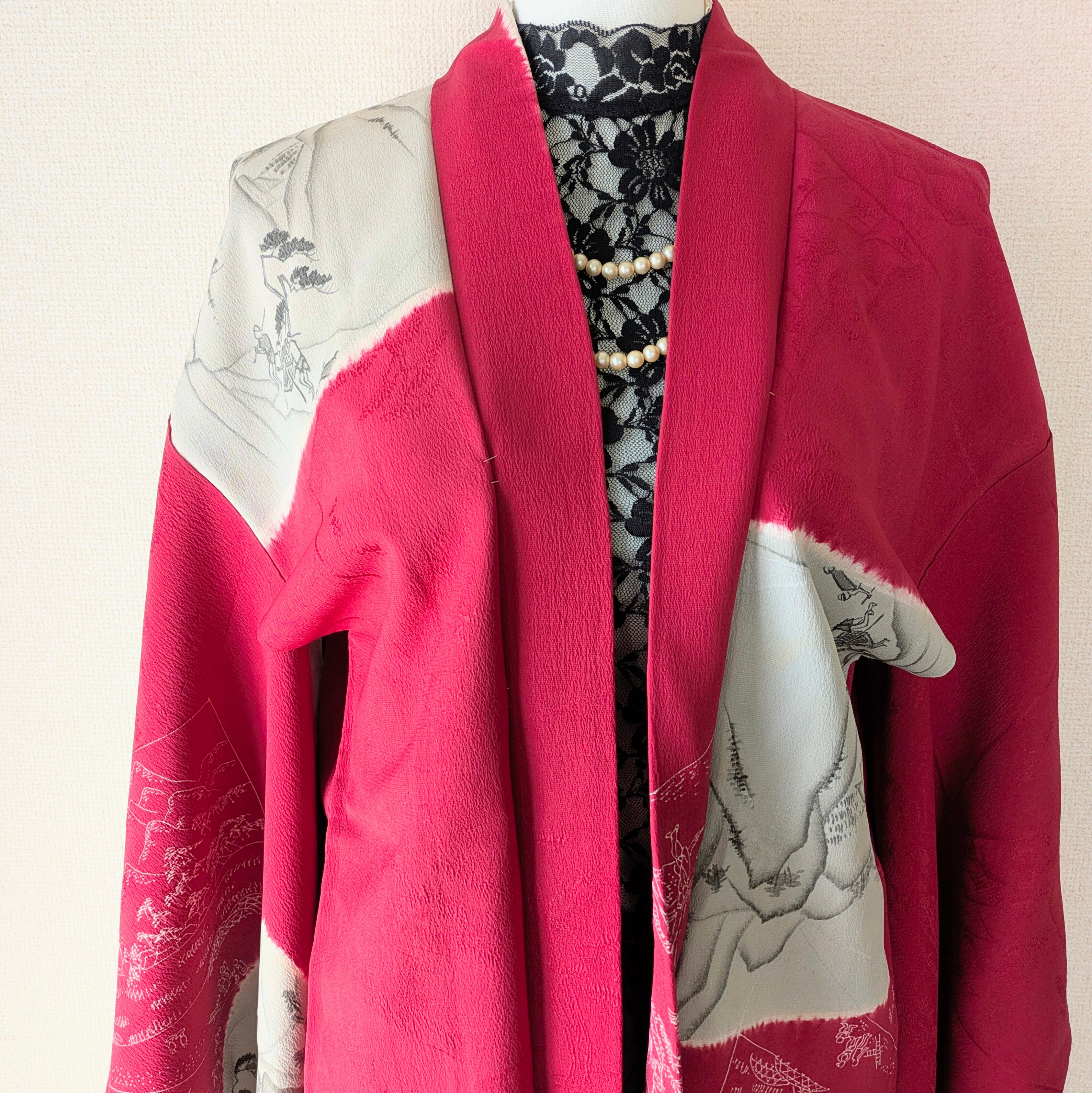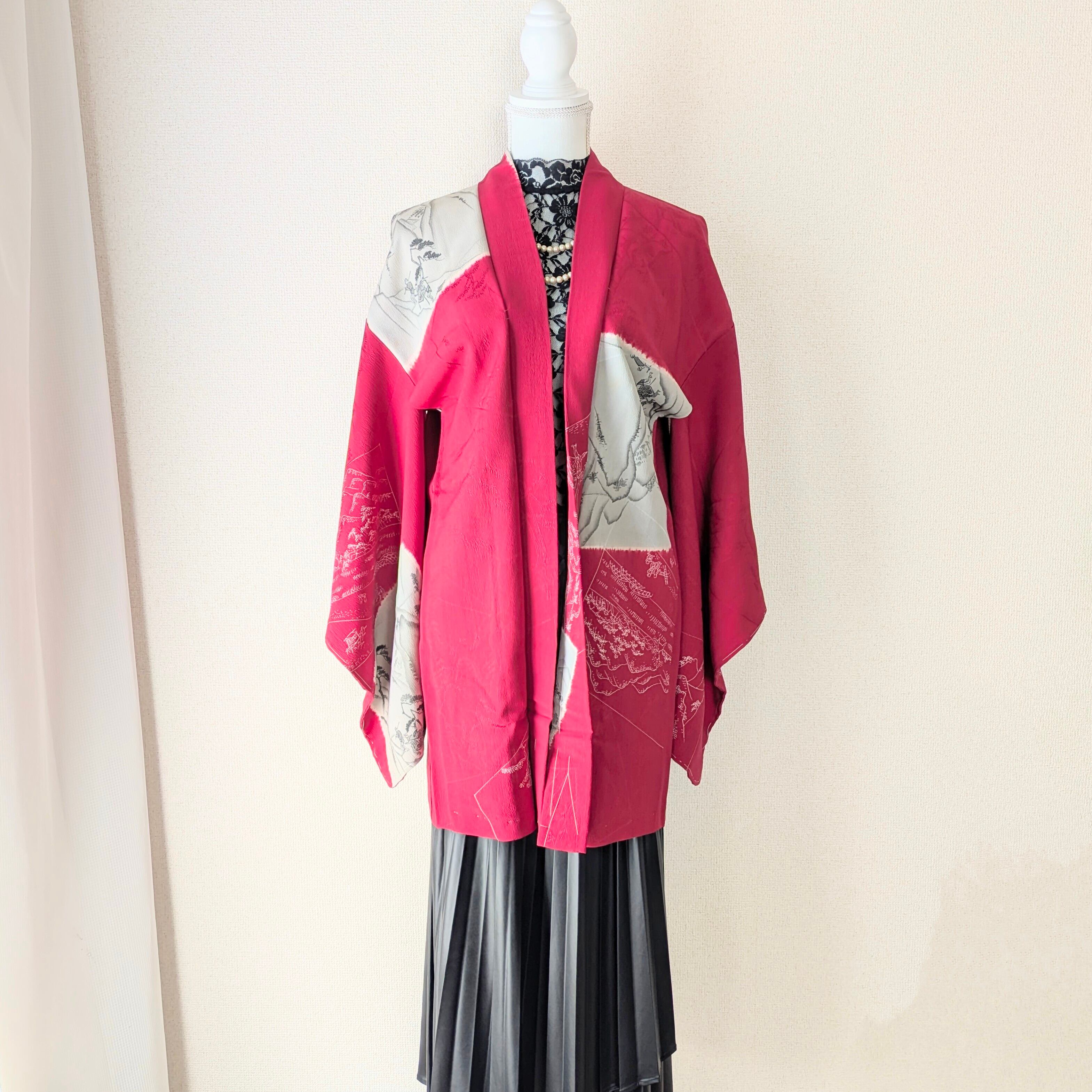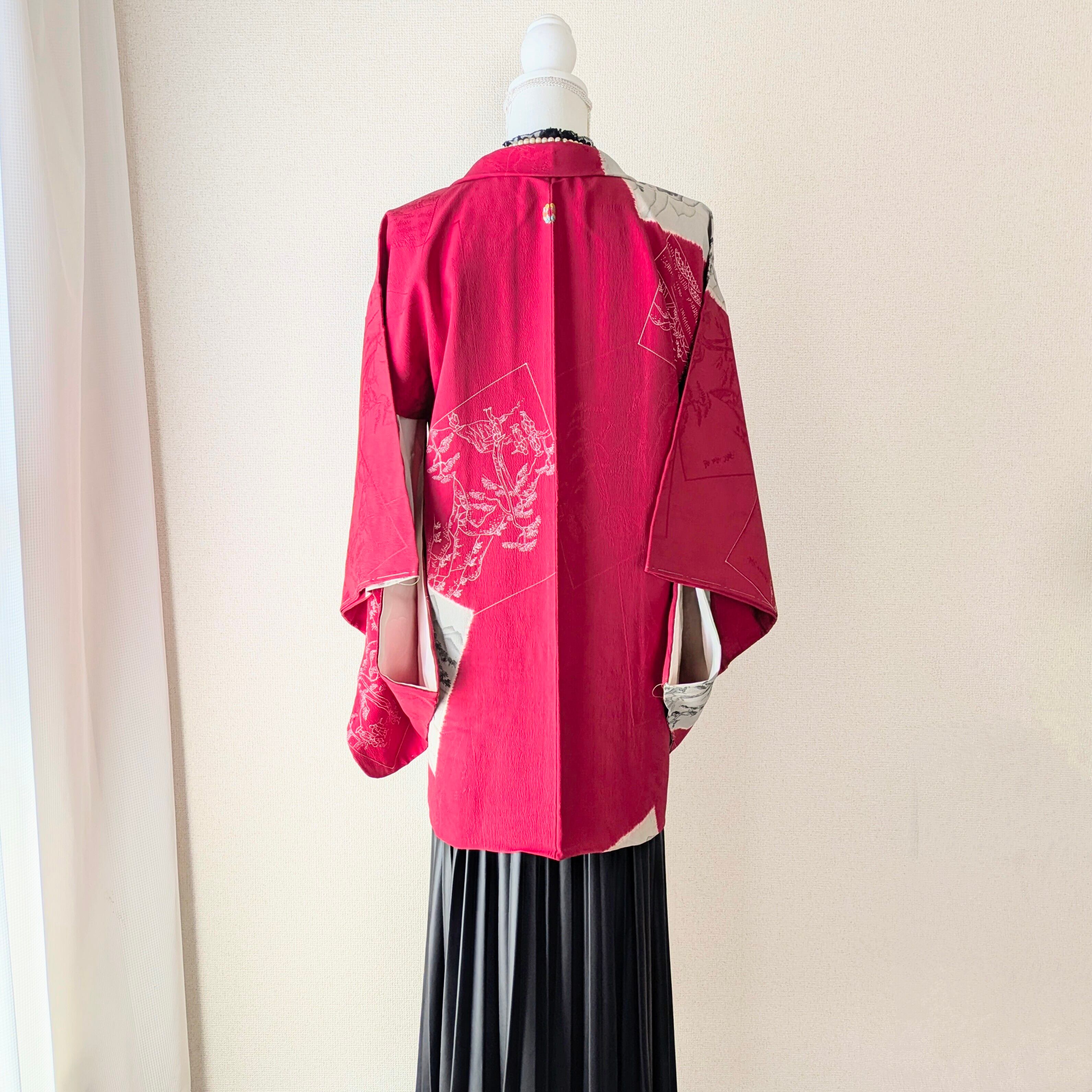 大胆な構図の染めの色紙紋が入った赤色の長羽織です。色紙の柄はネガポジ反転のような風景画の凝ったデザイン。刺繍の紋もカラフルで素敵です。
