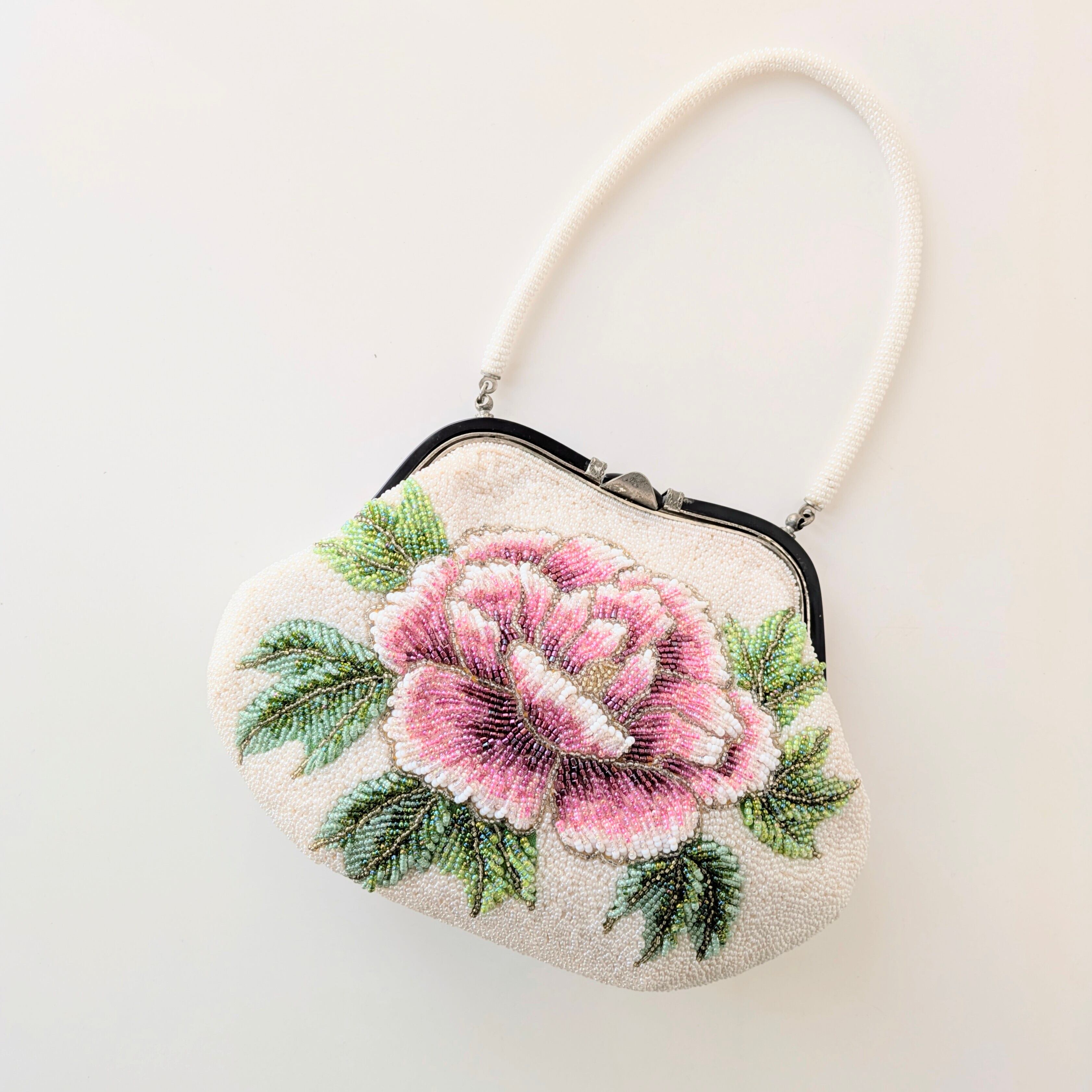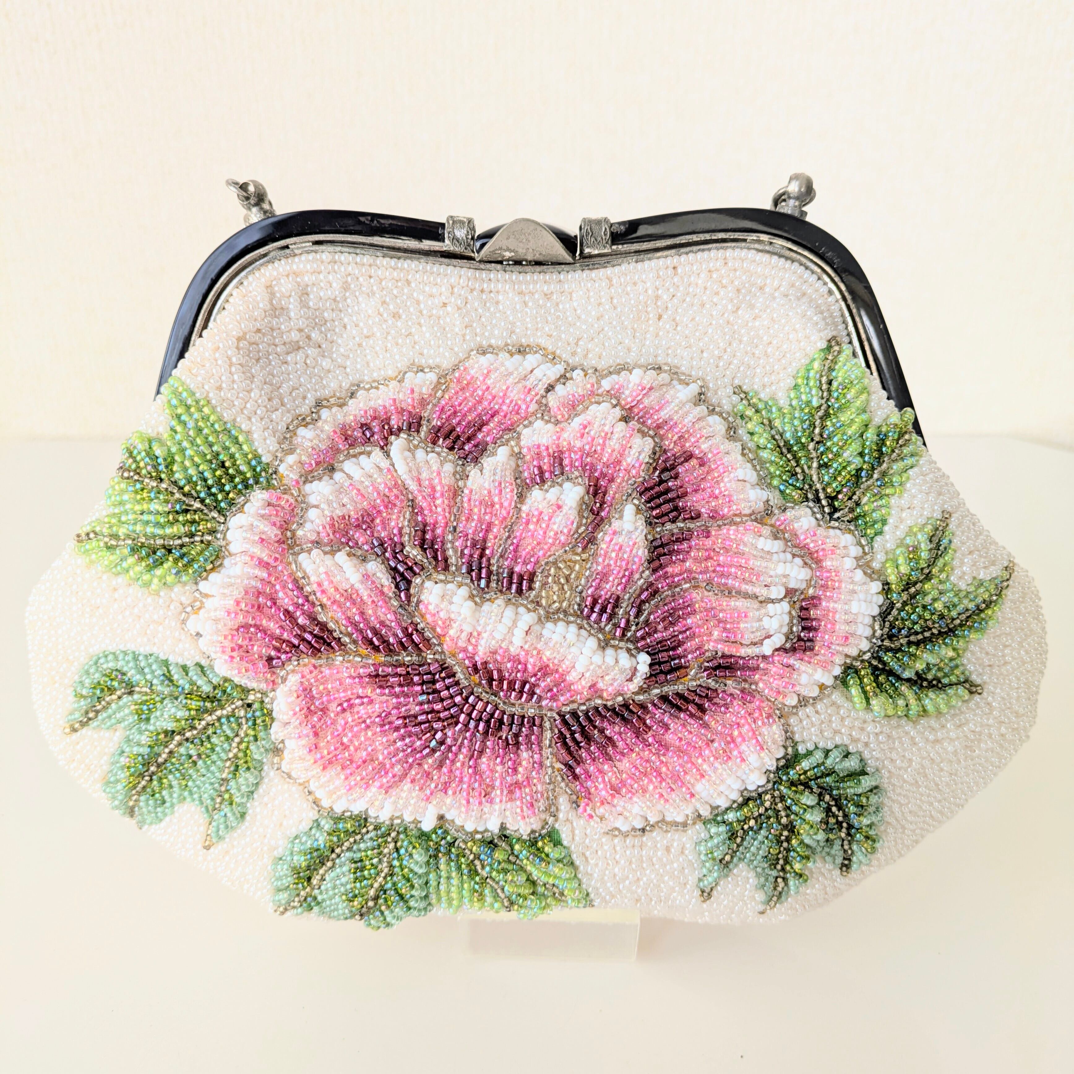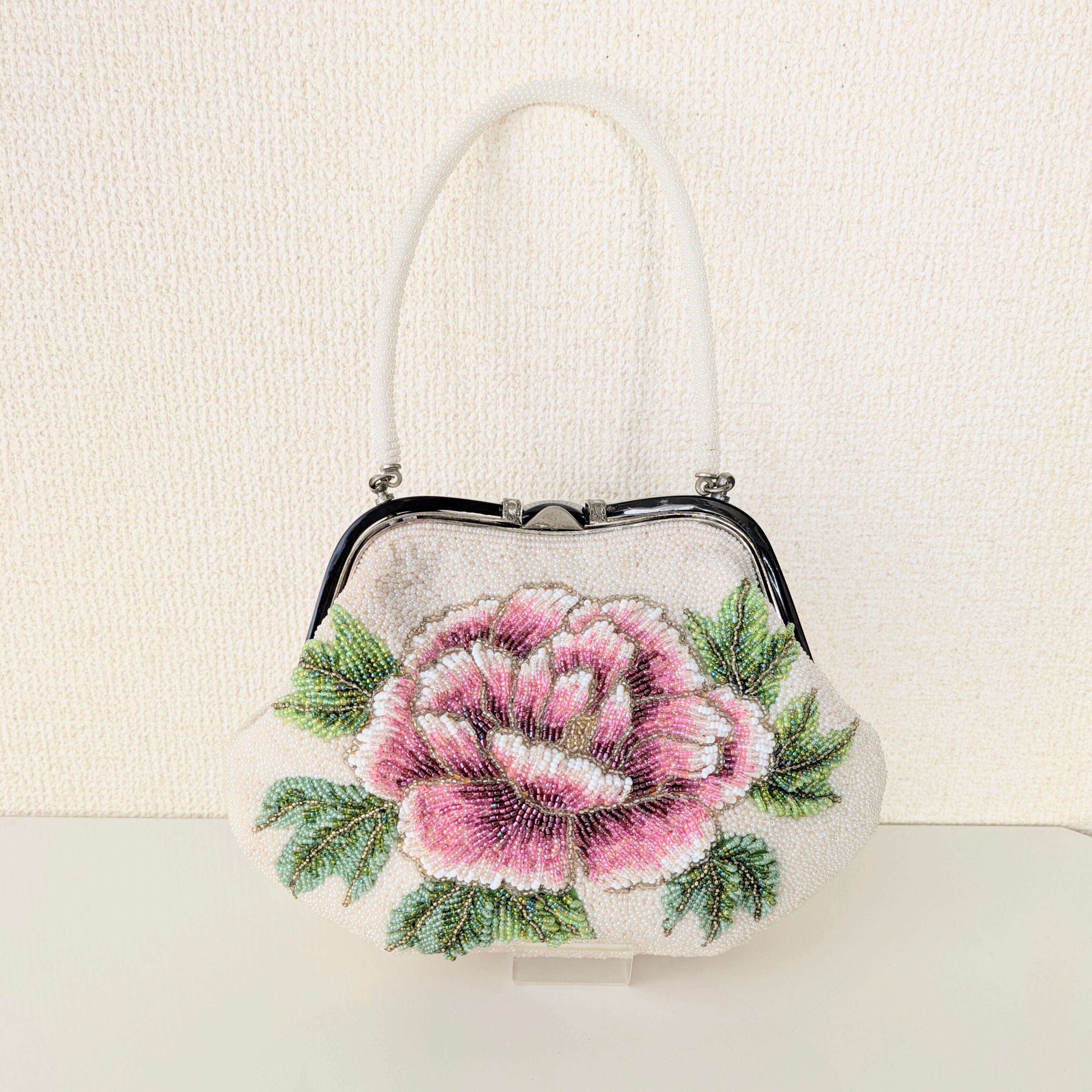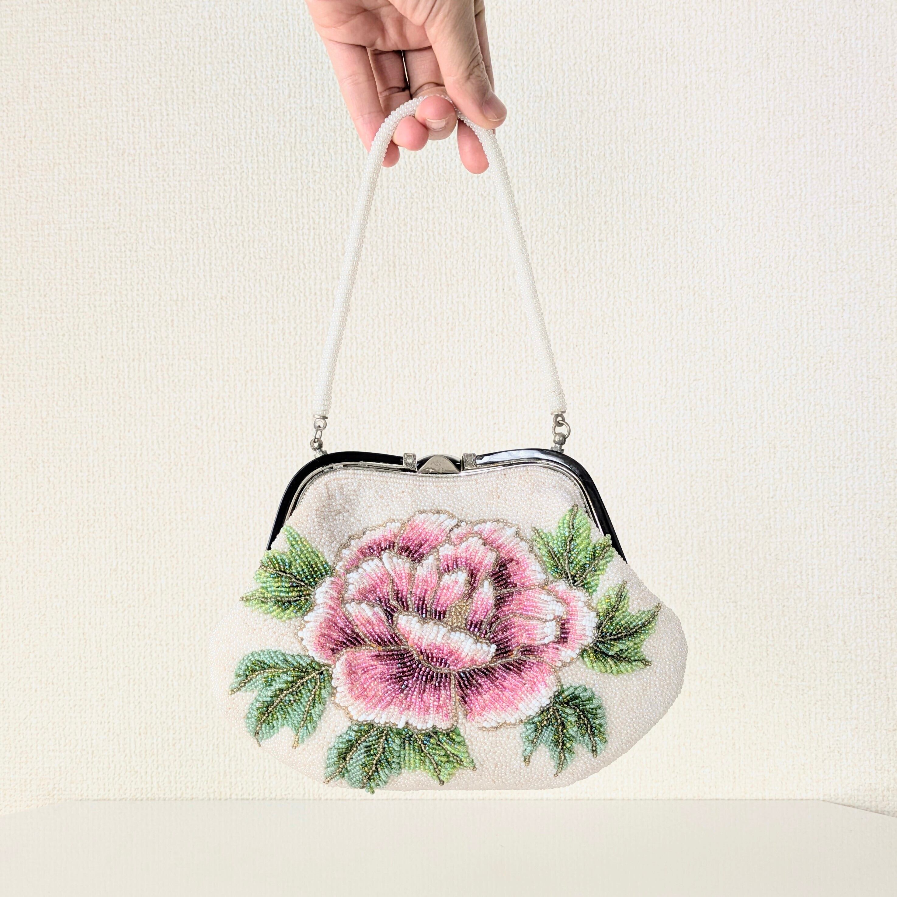 白いパールビーズに大きな牡丹の模様が刺繍されたビーズバッグ。
