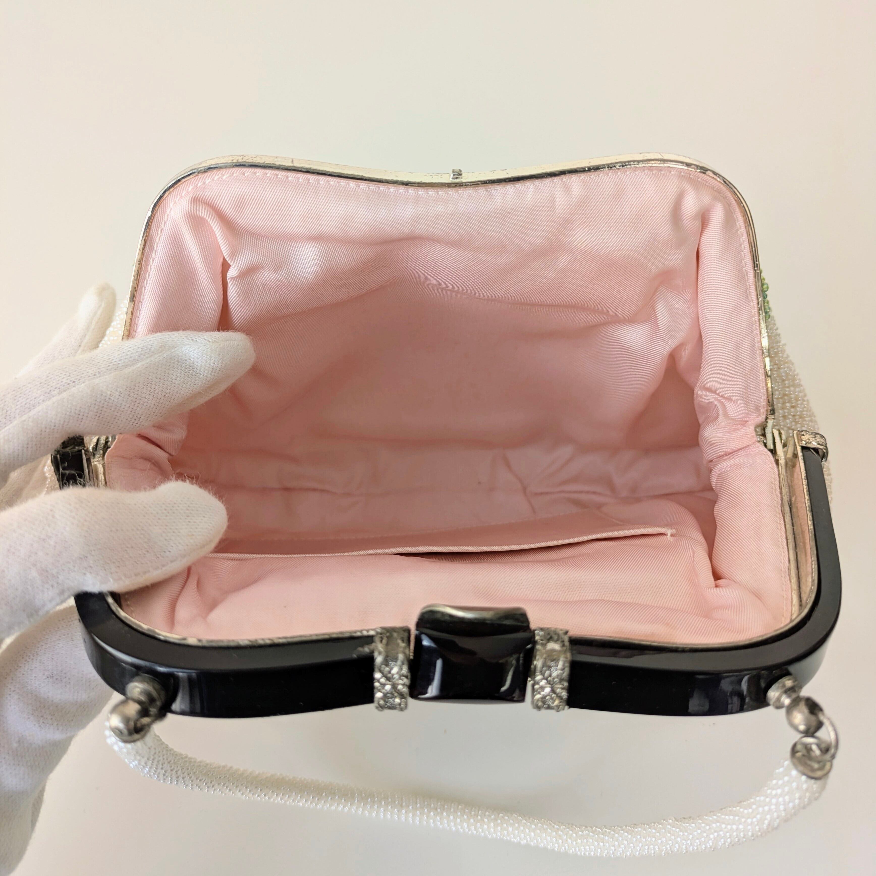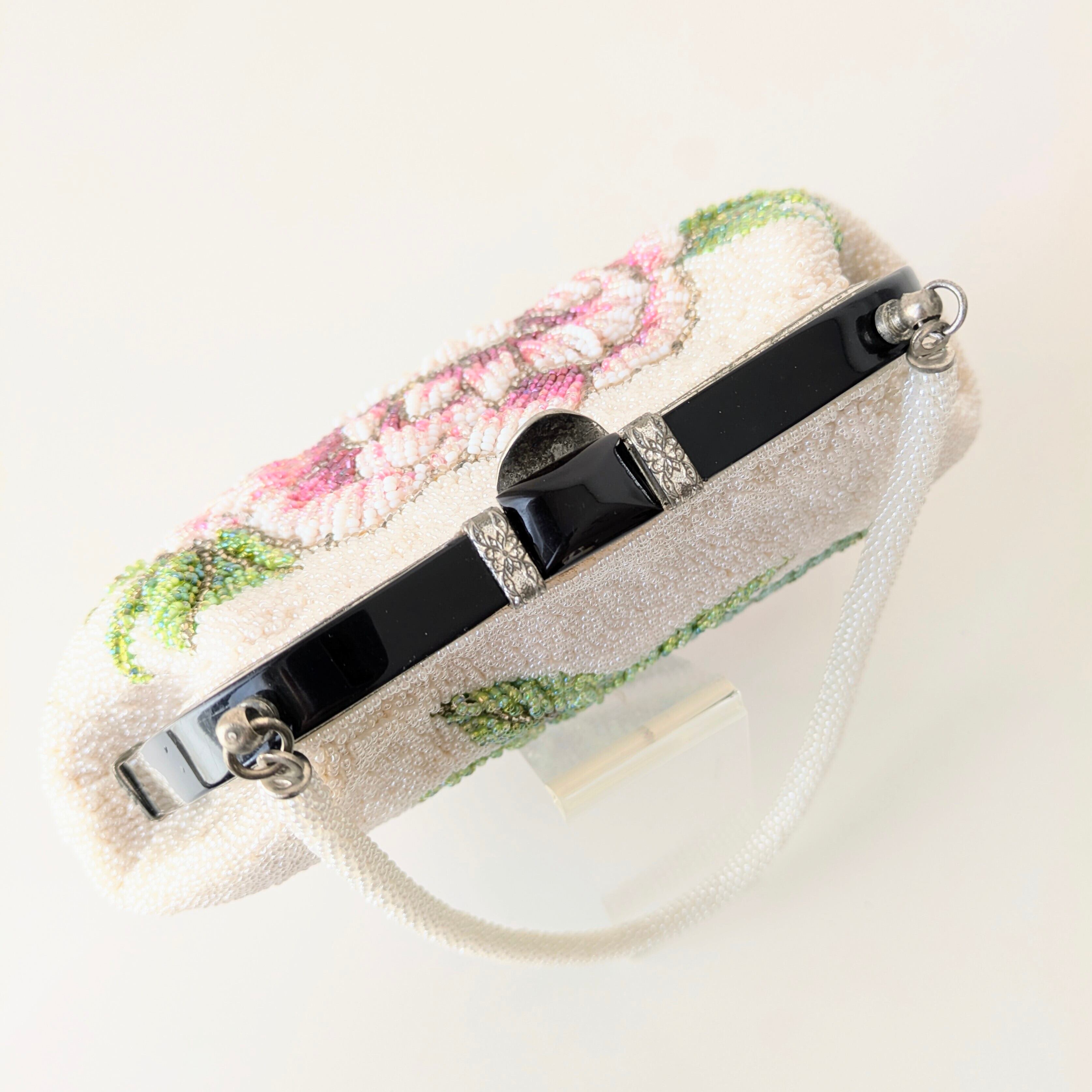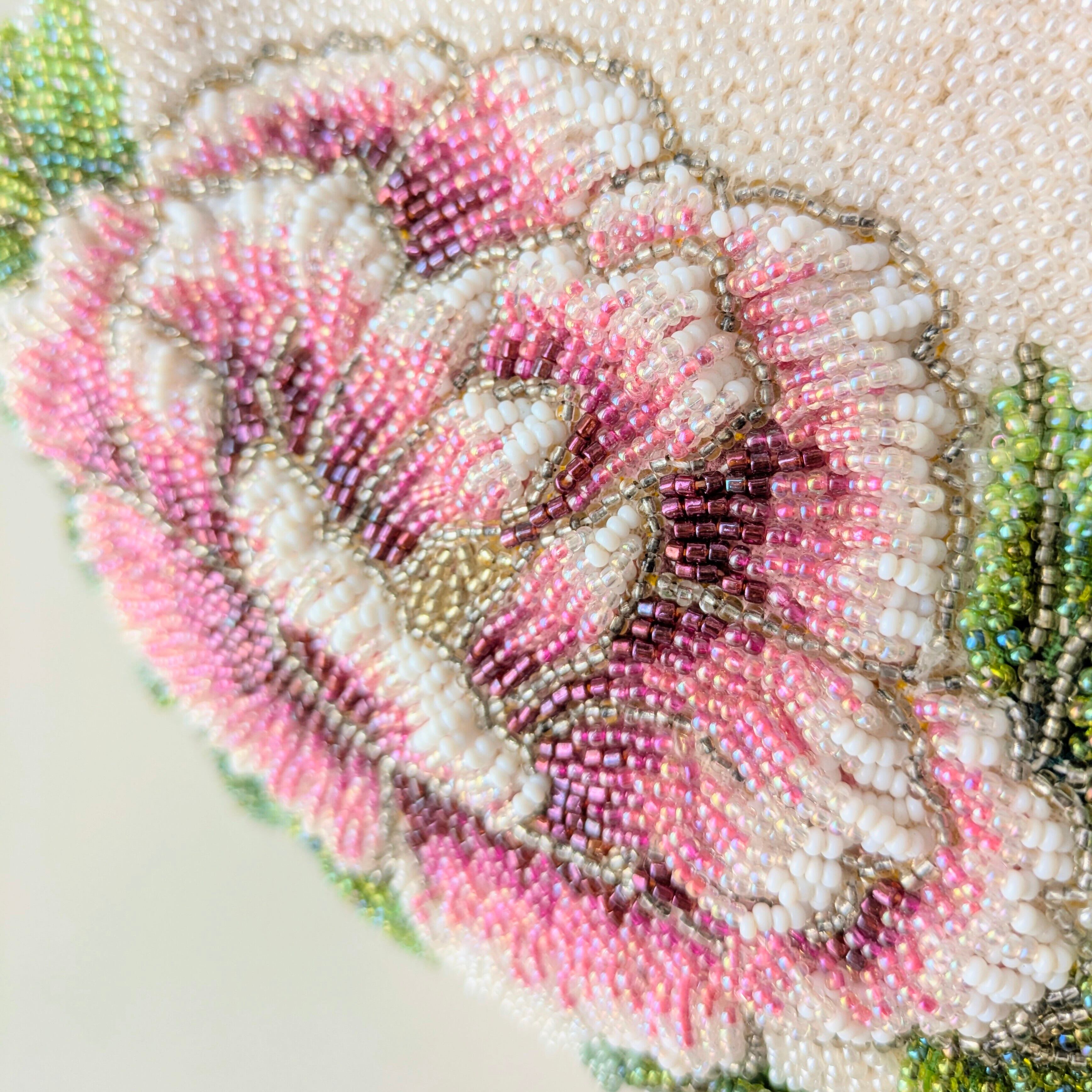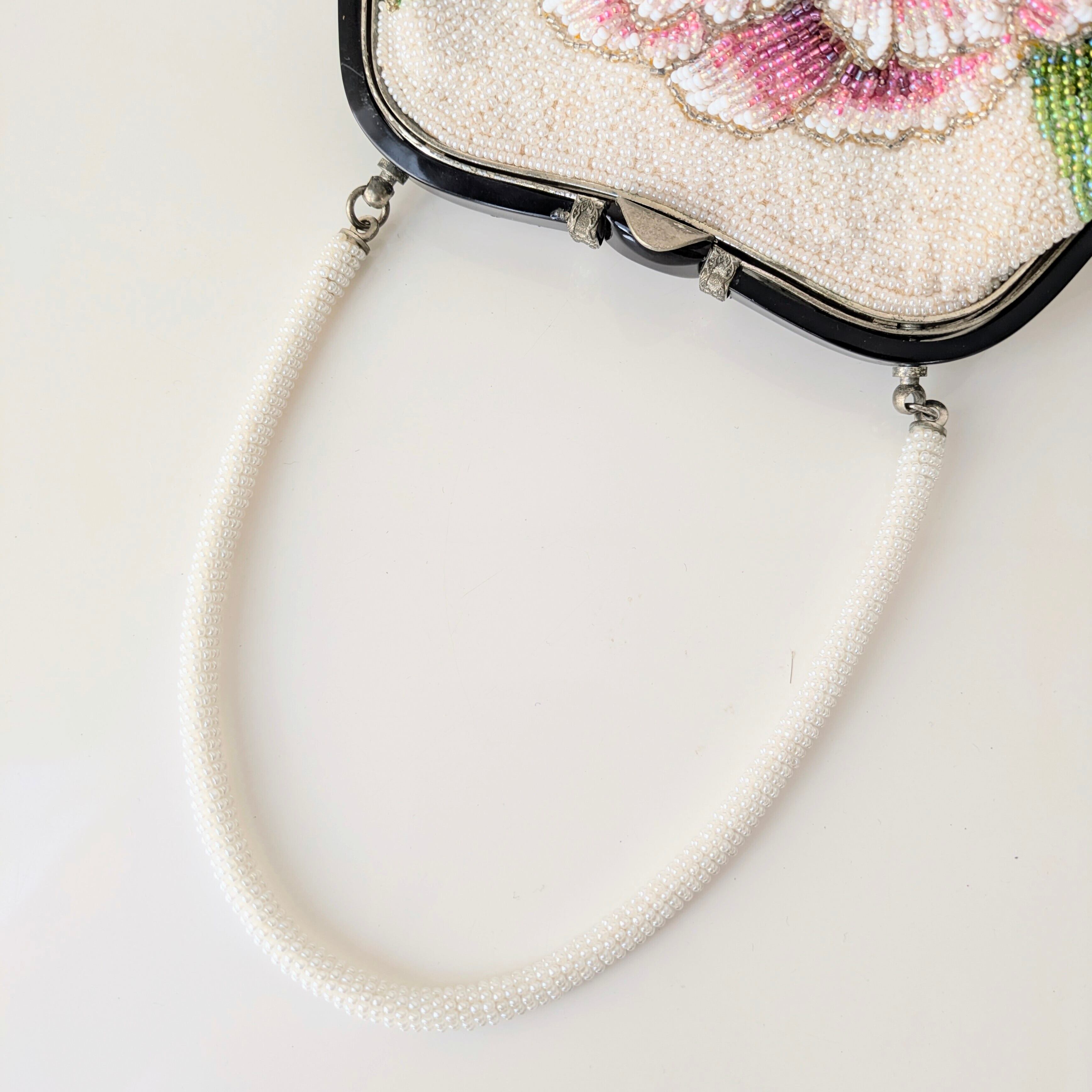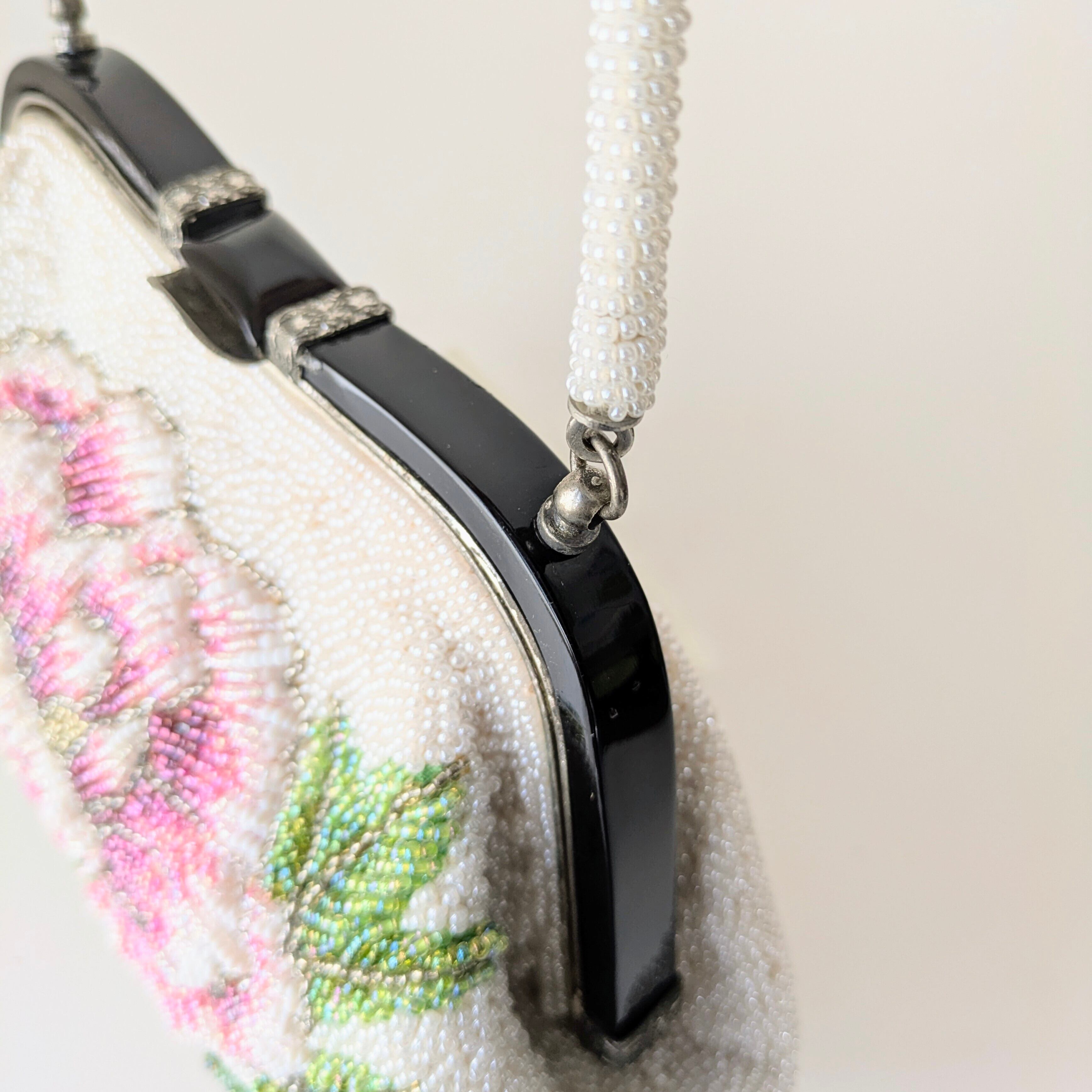 白いパールビーズに大きな牡丹の模様が刺繍されたビーズバッグ。