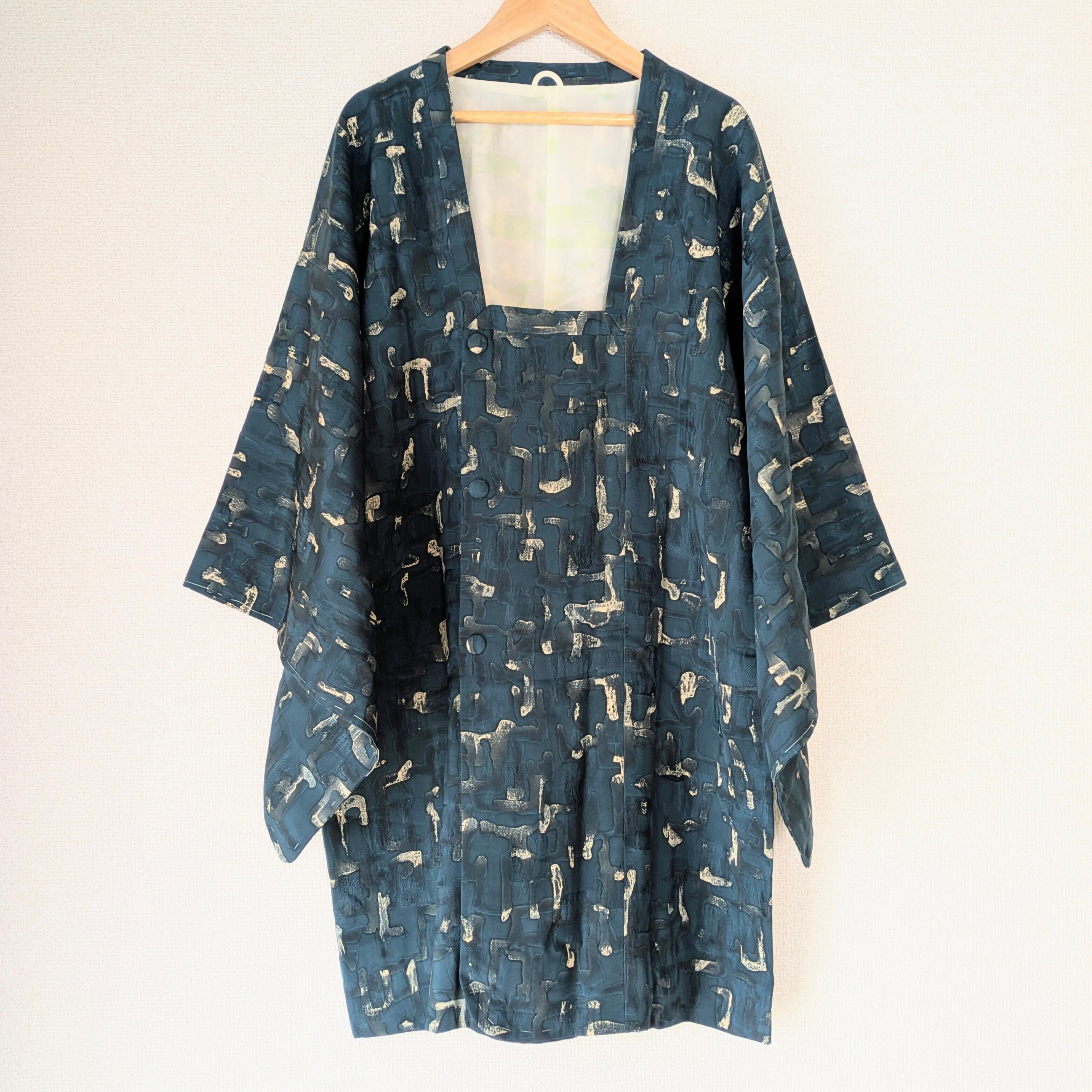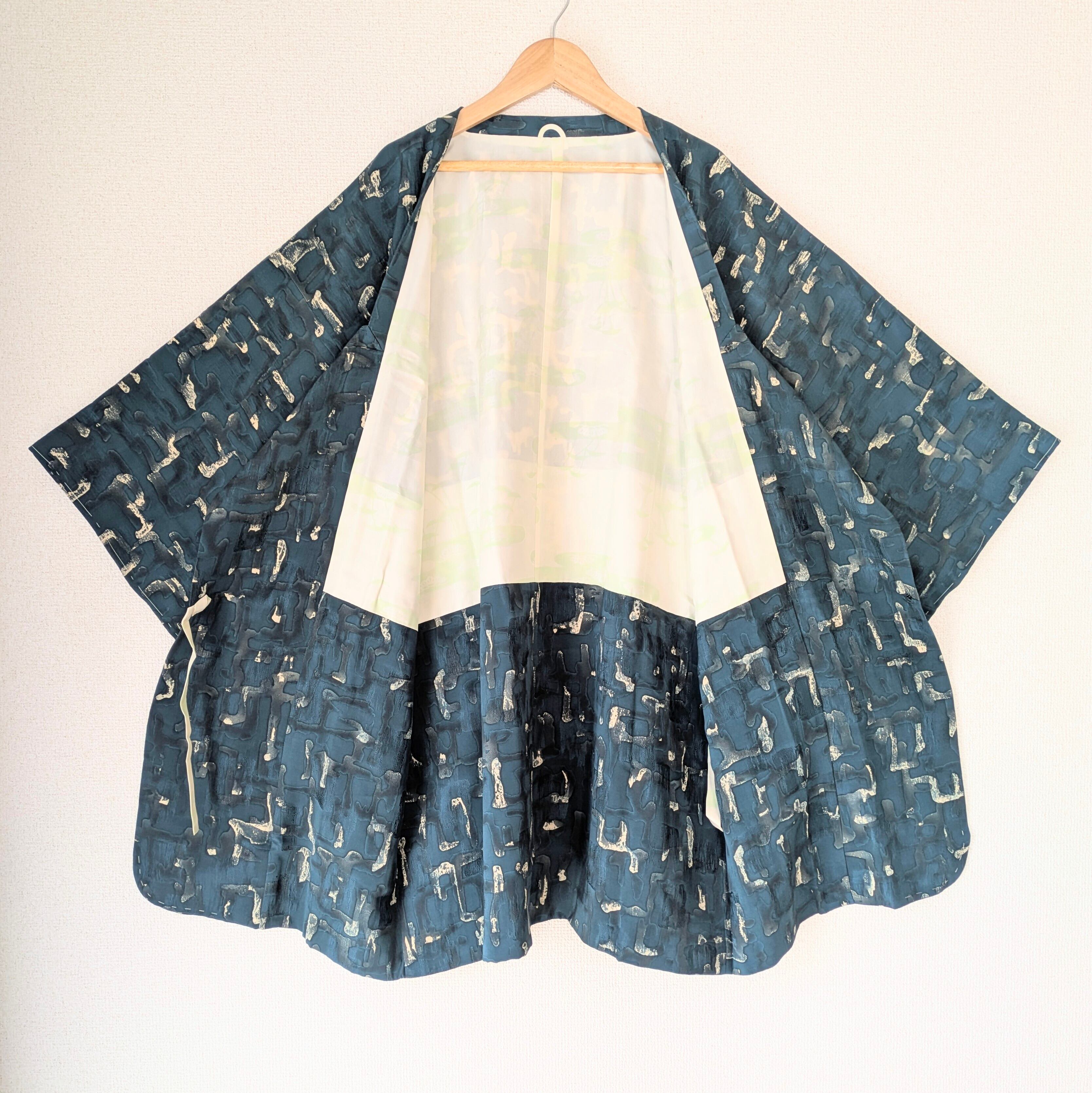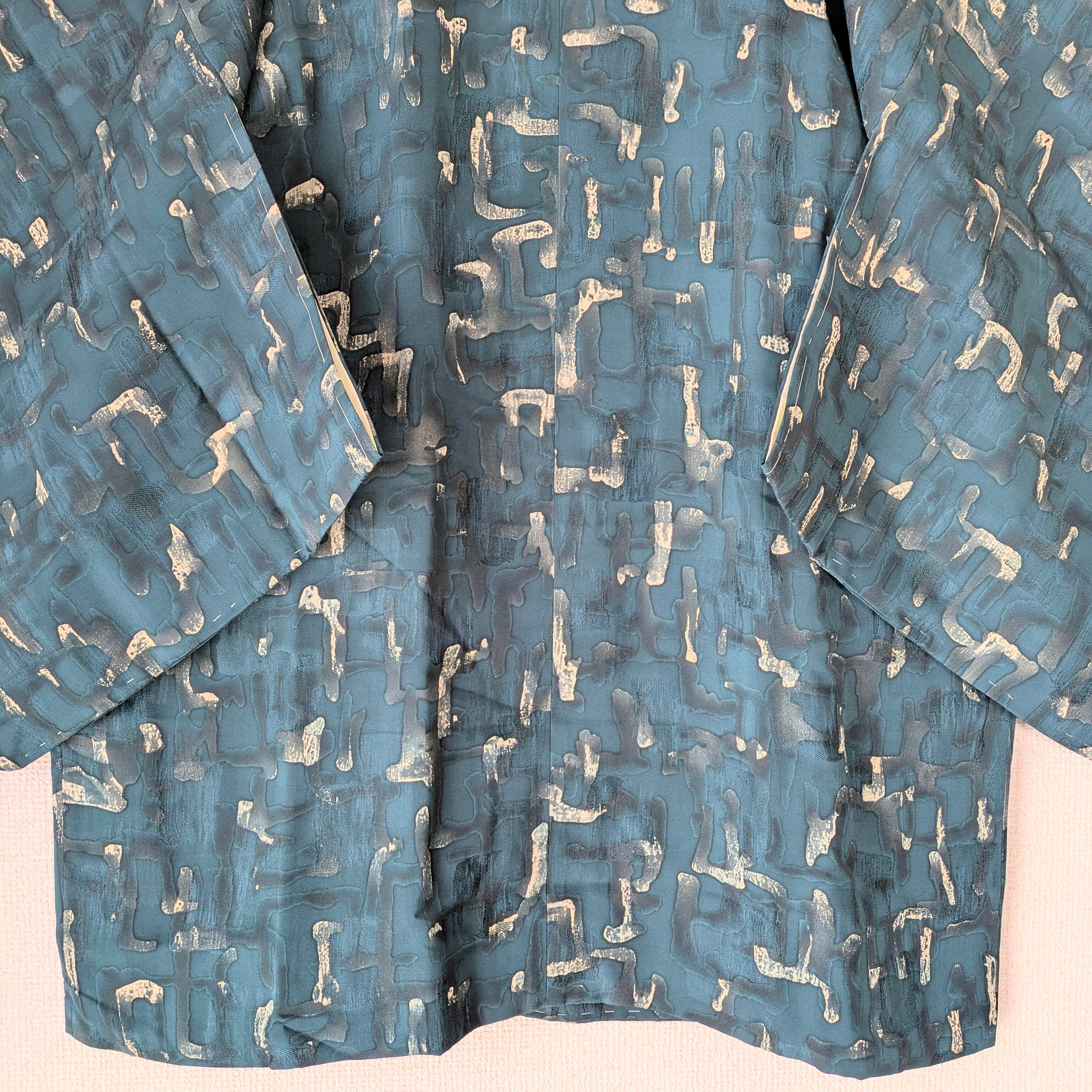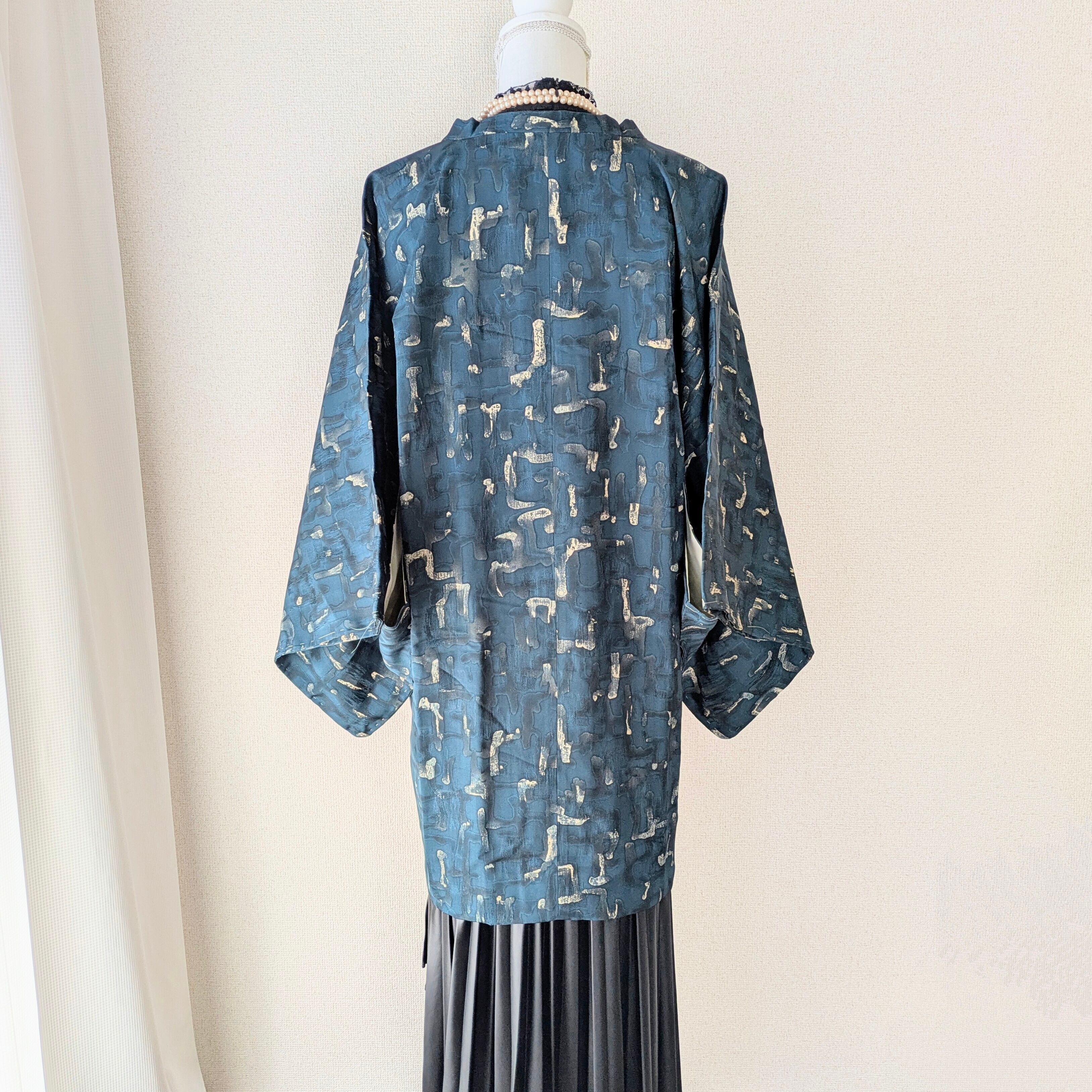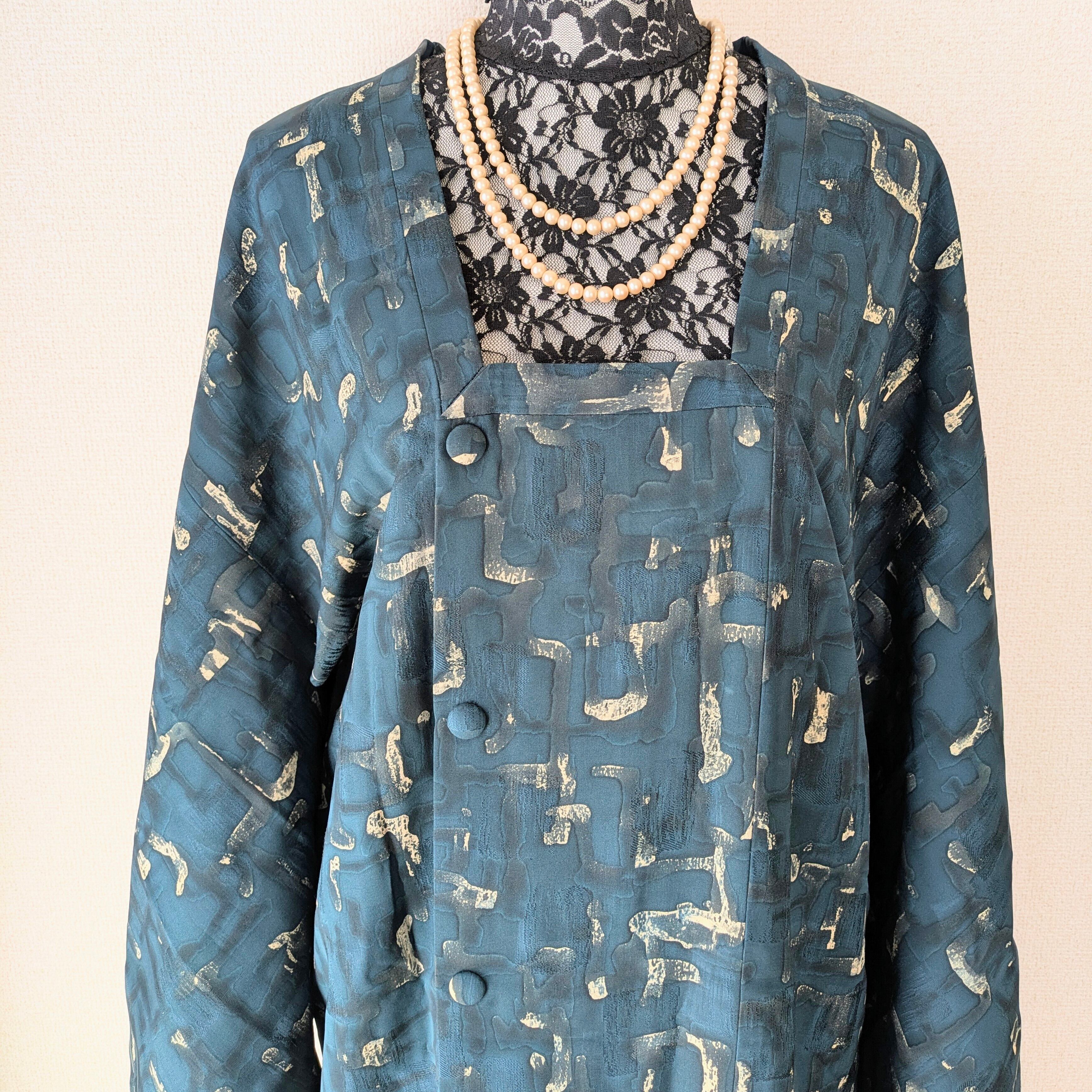 青と緑の中間色といった色合いに暈し染めの柄の入った道行コート(雨コート)です。