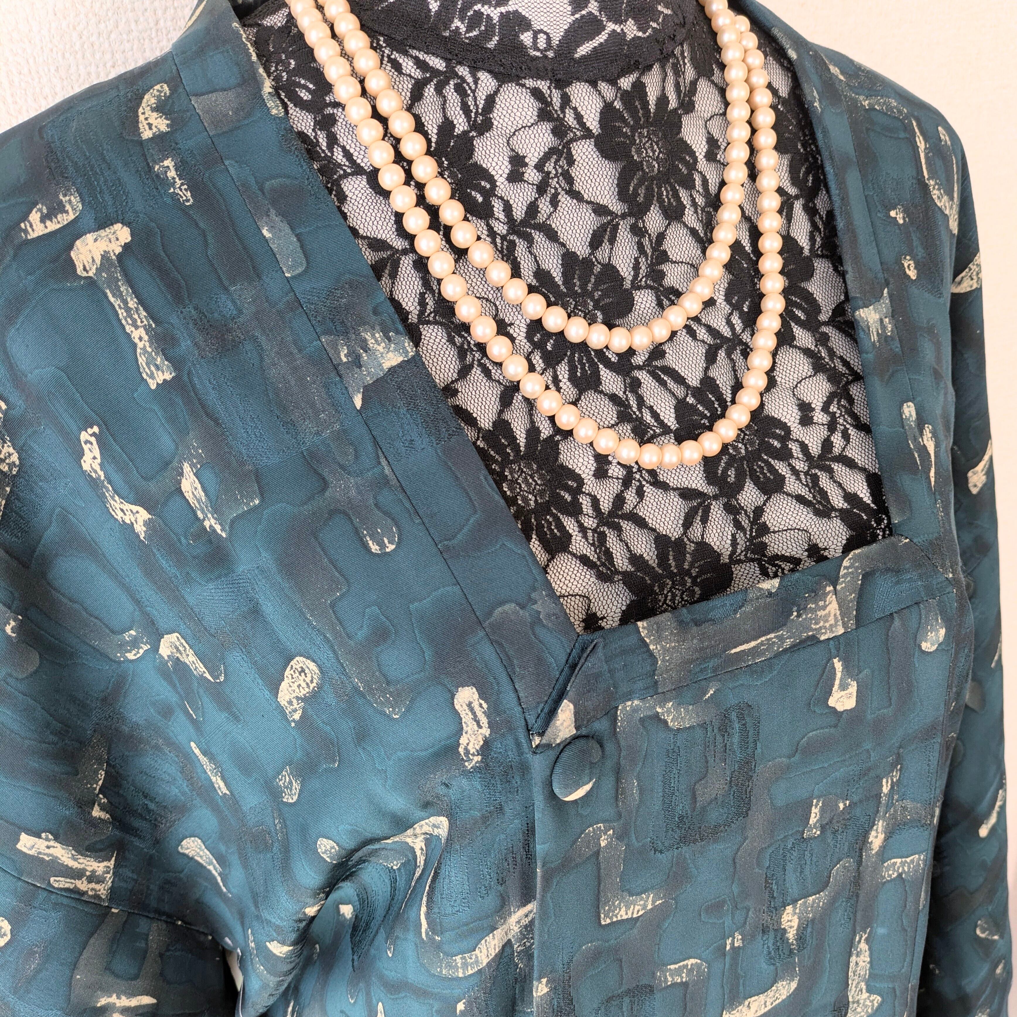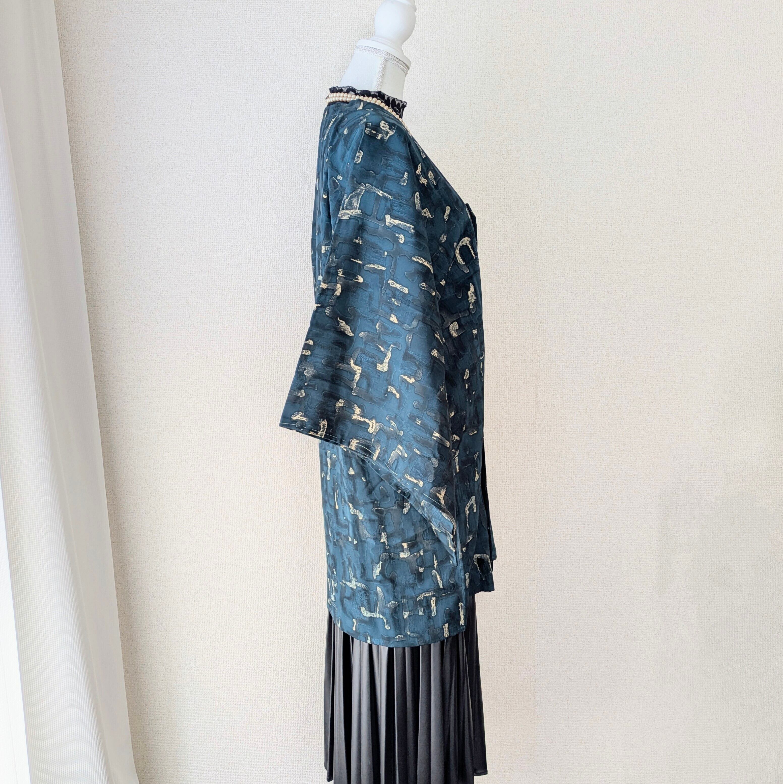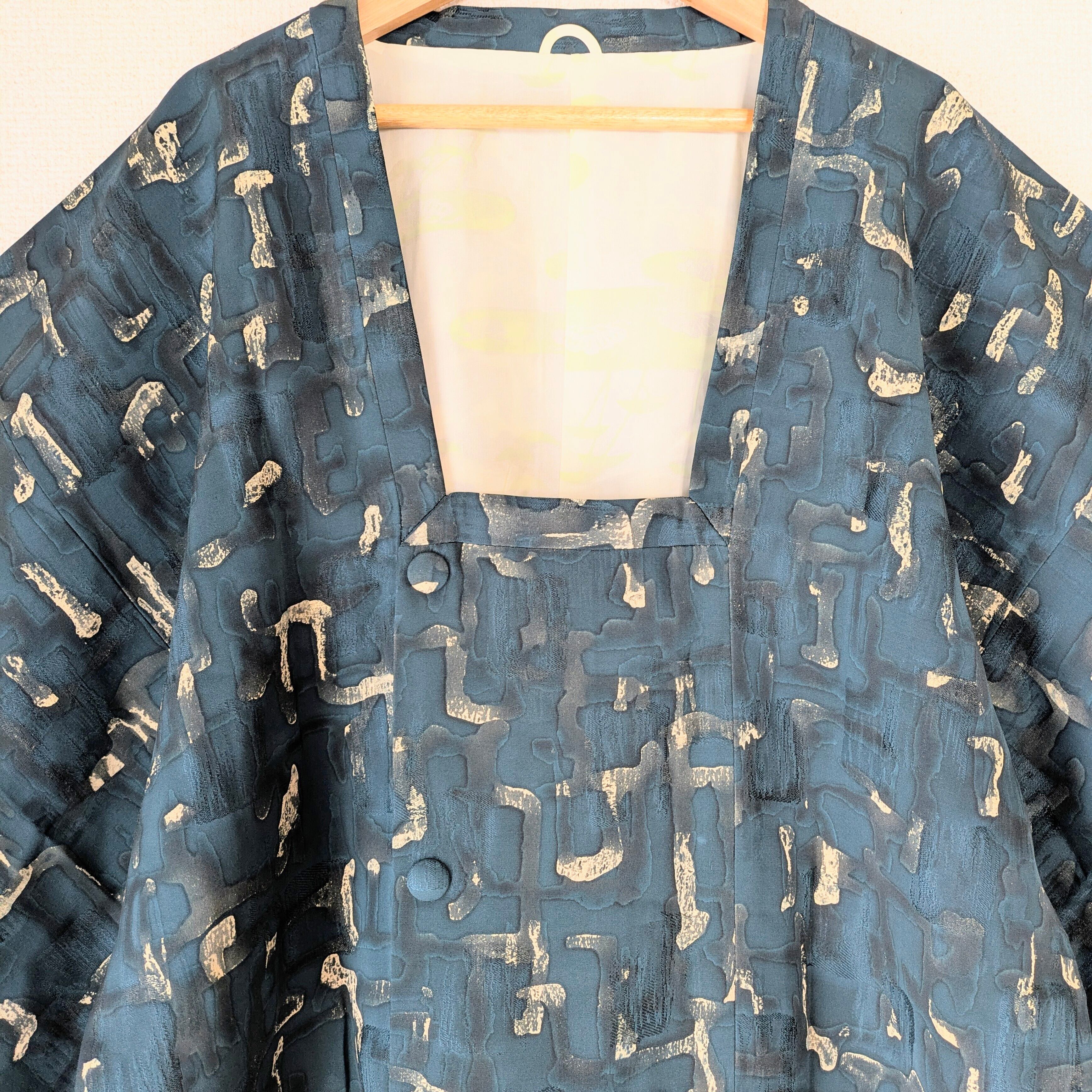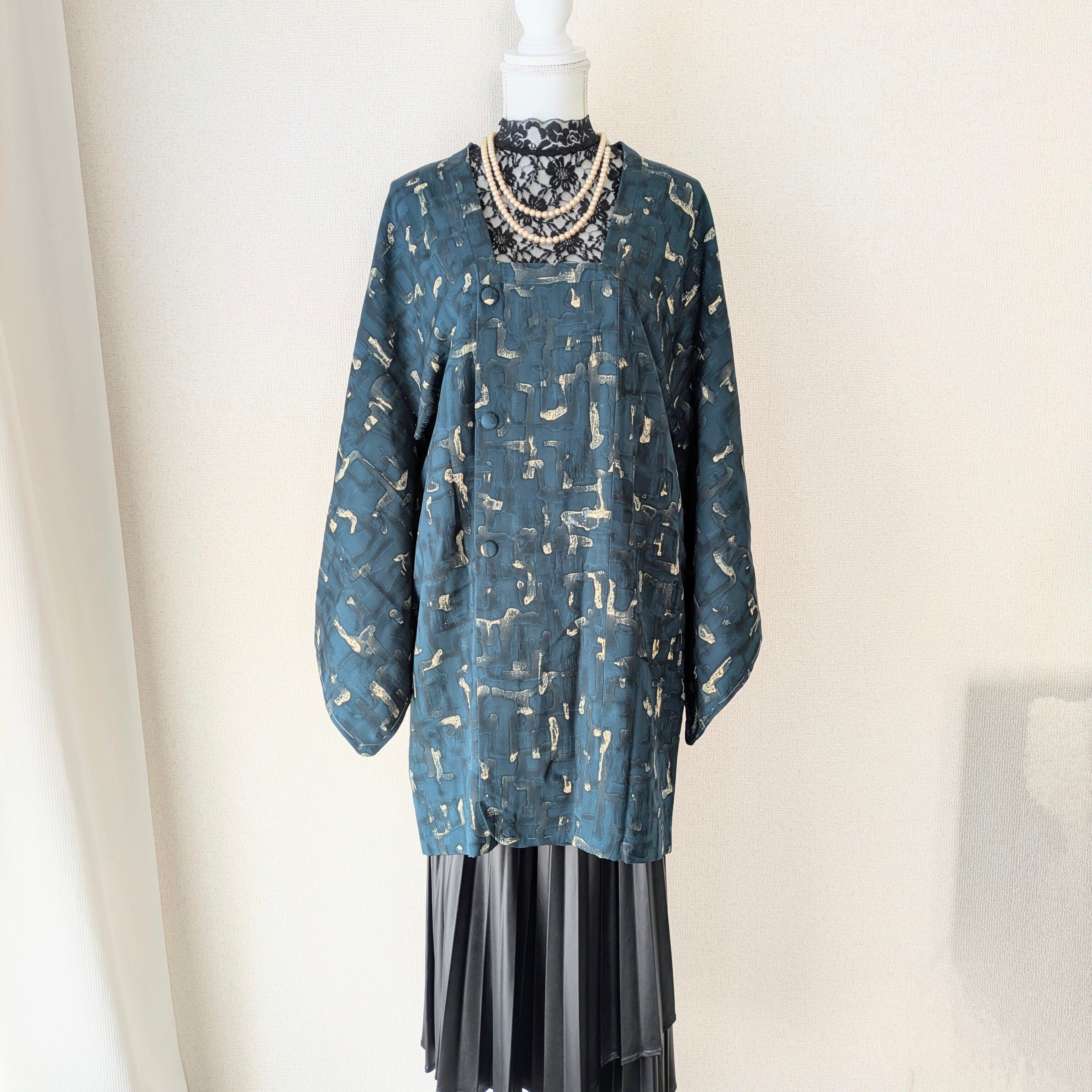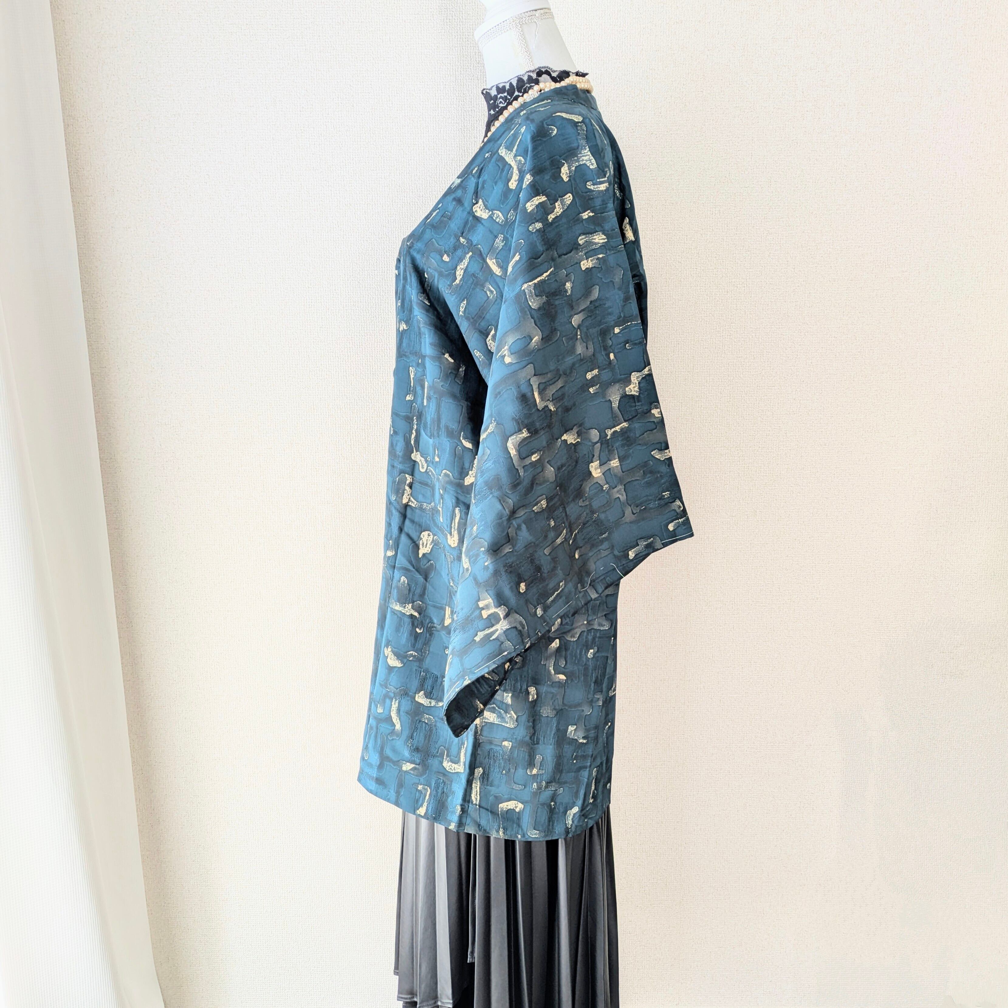 青と緑の中間色といった色合いに暈し染めの柄の入った道行コート(雨コート)です。