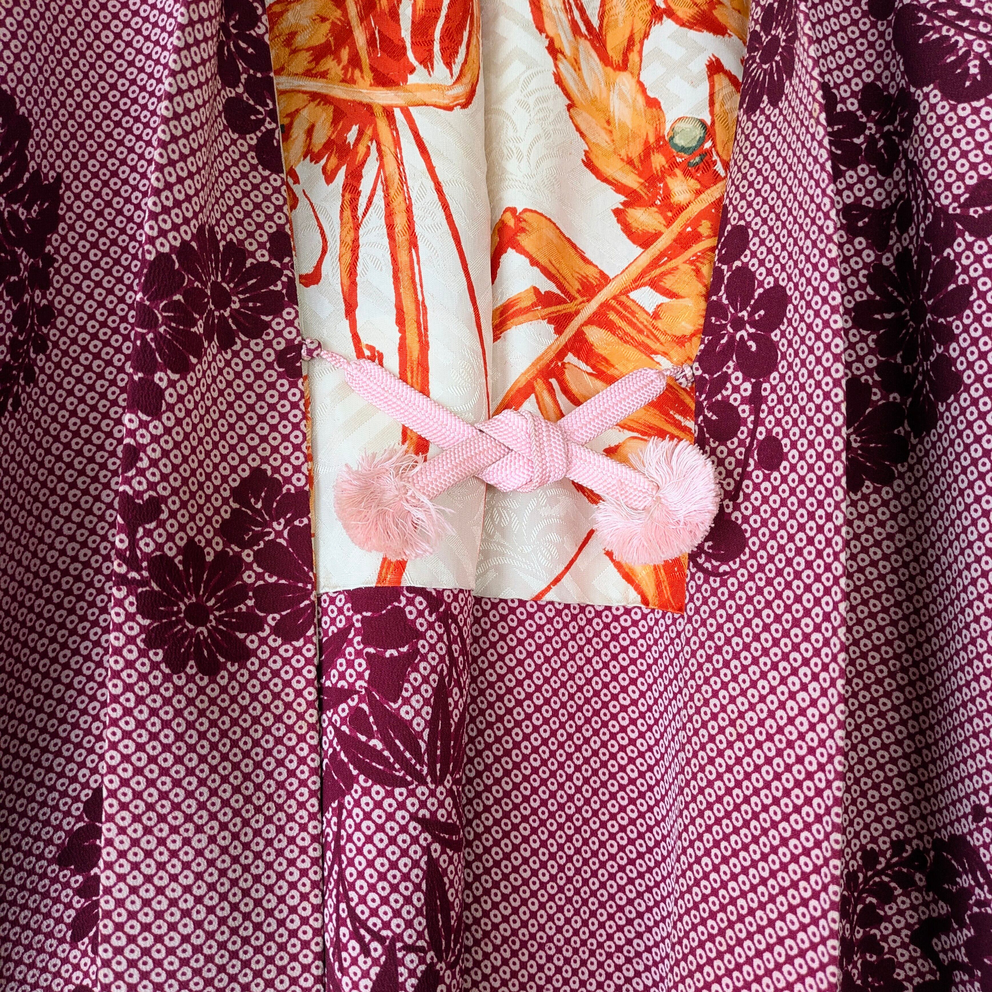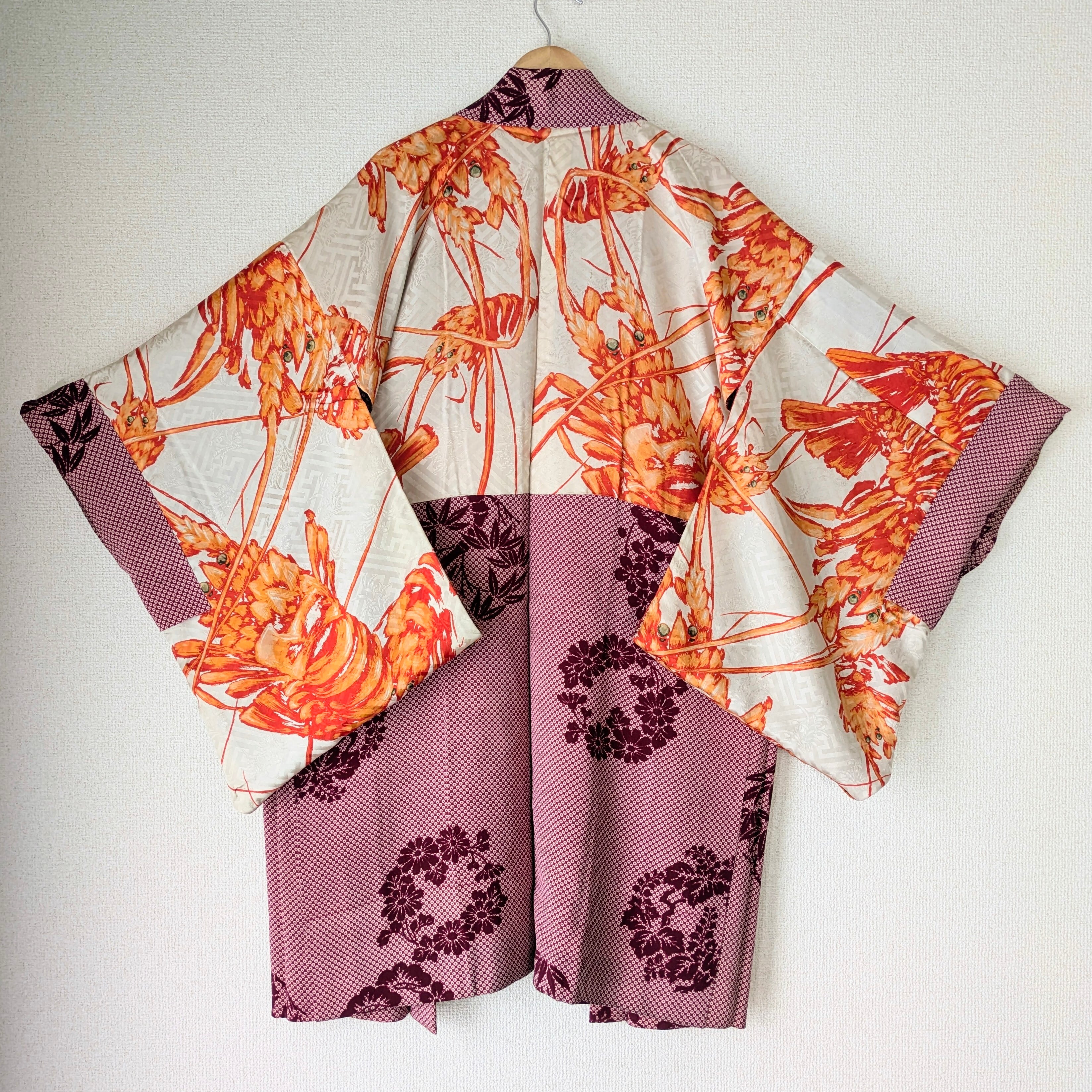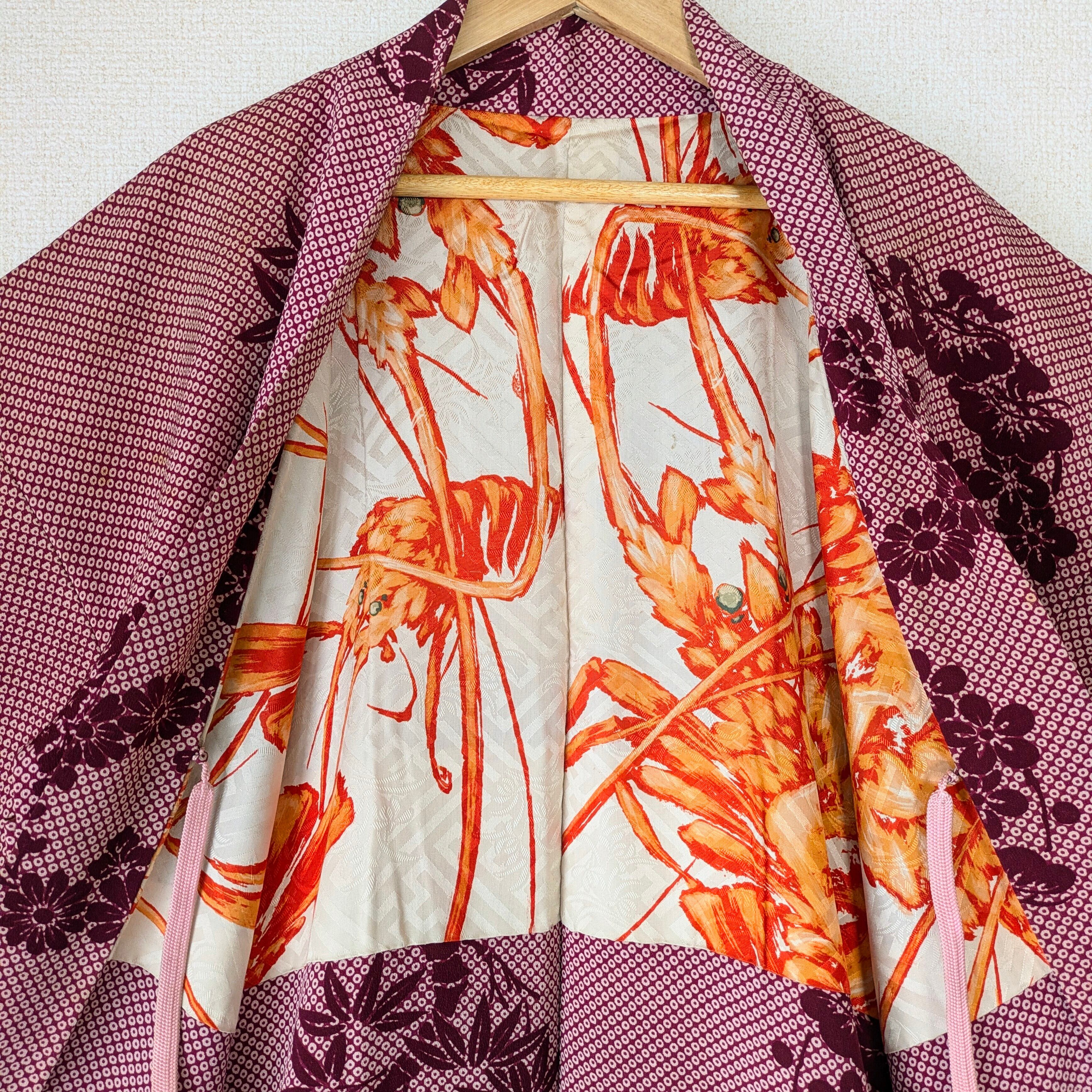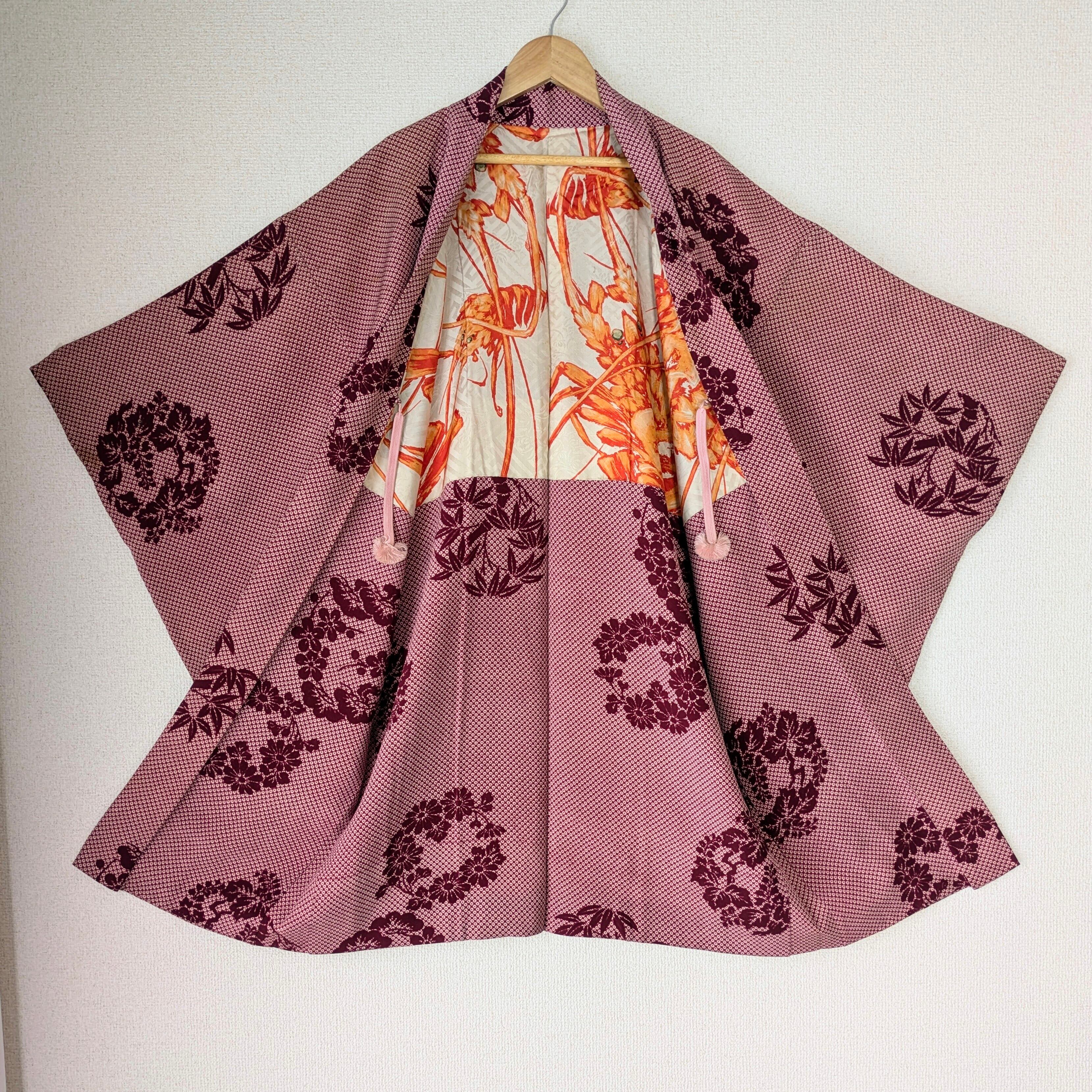 鹿の子柄に花丸文様をあしらった縮緬の長羽織です。こちらの羽織の注目ポイントは、伊勢海老が縦横無尽に埋め尽くす、その個性的な羽裏です。