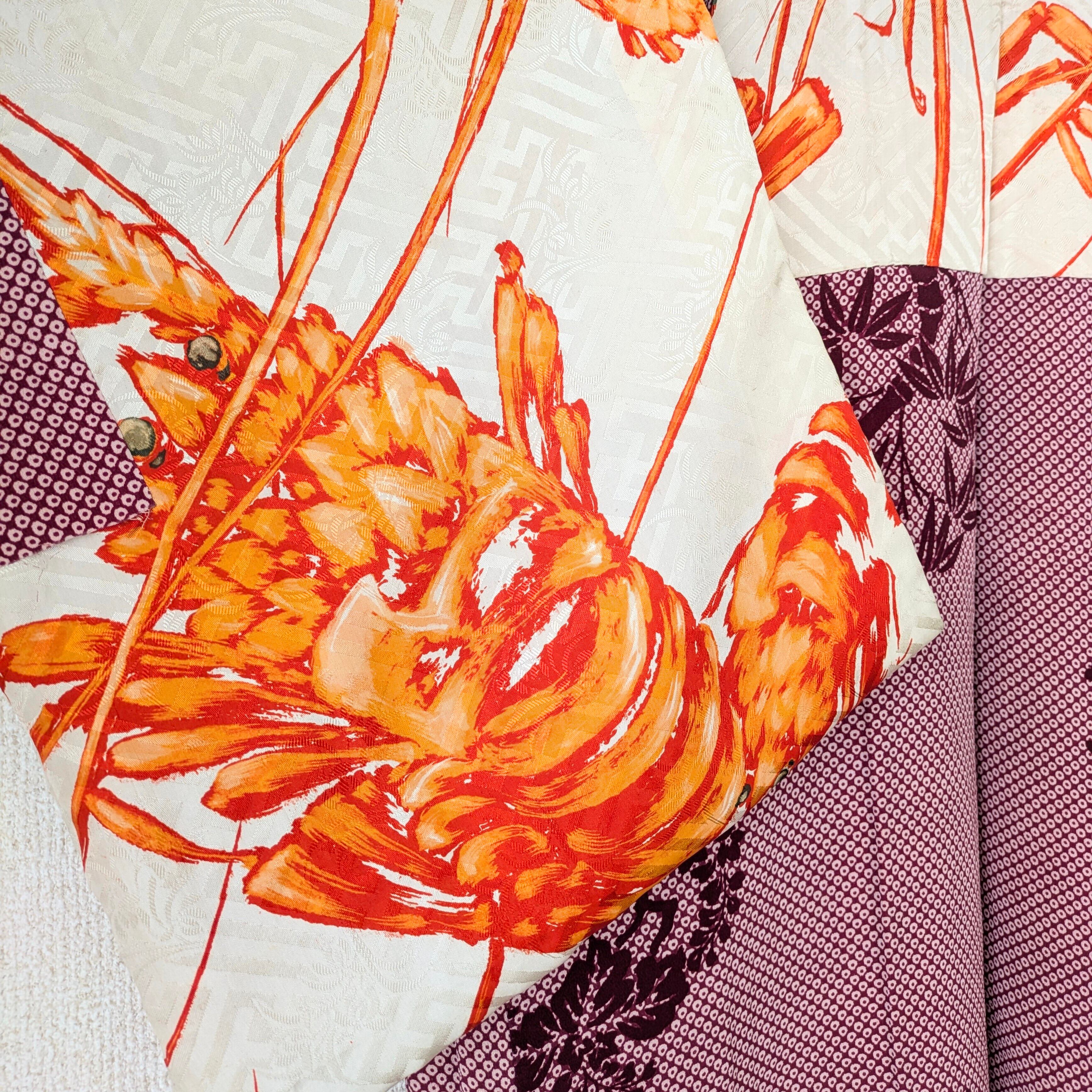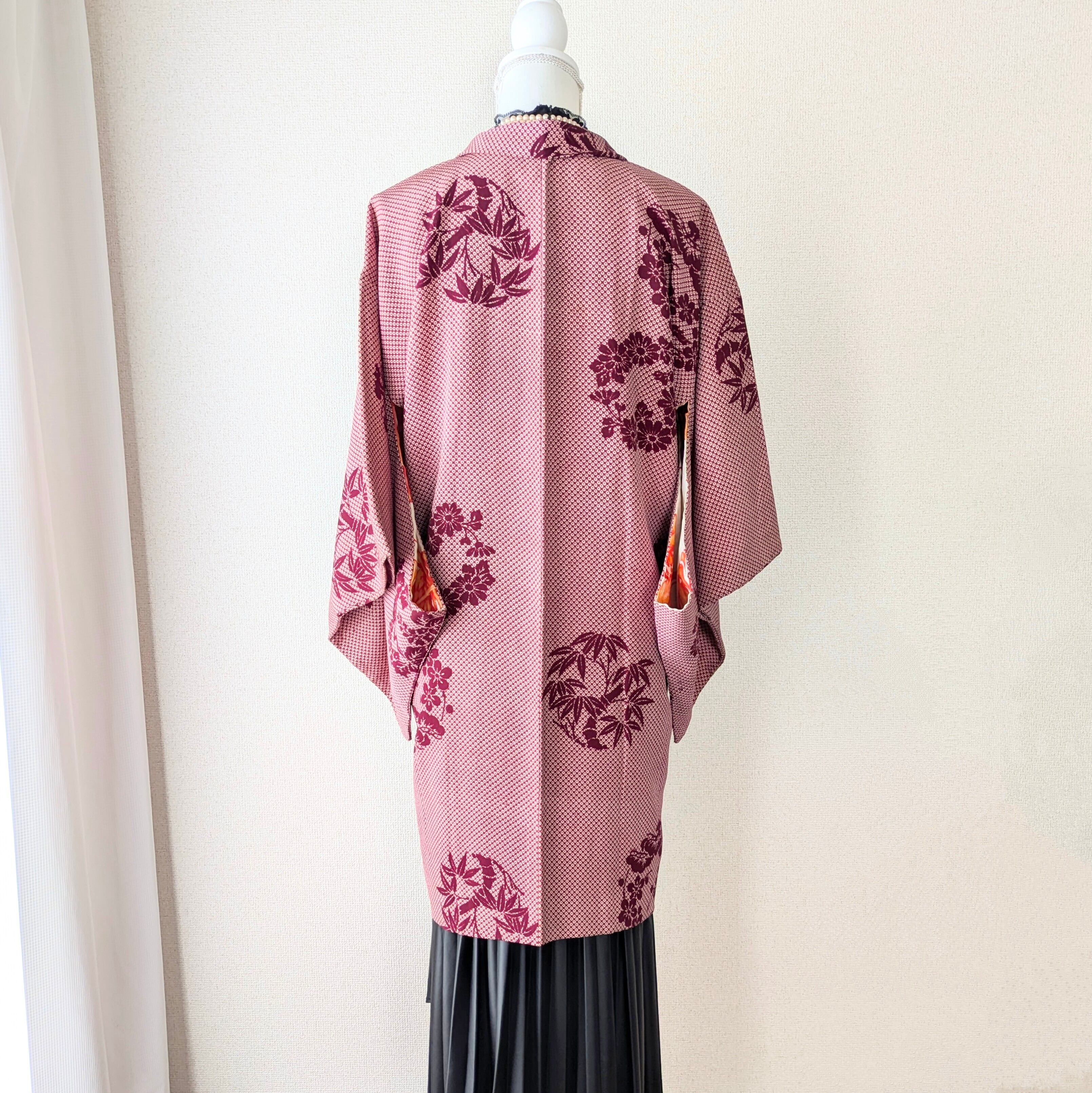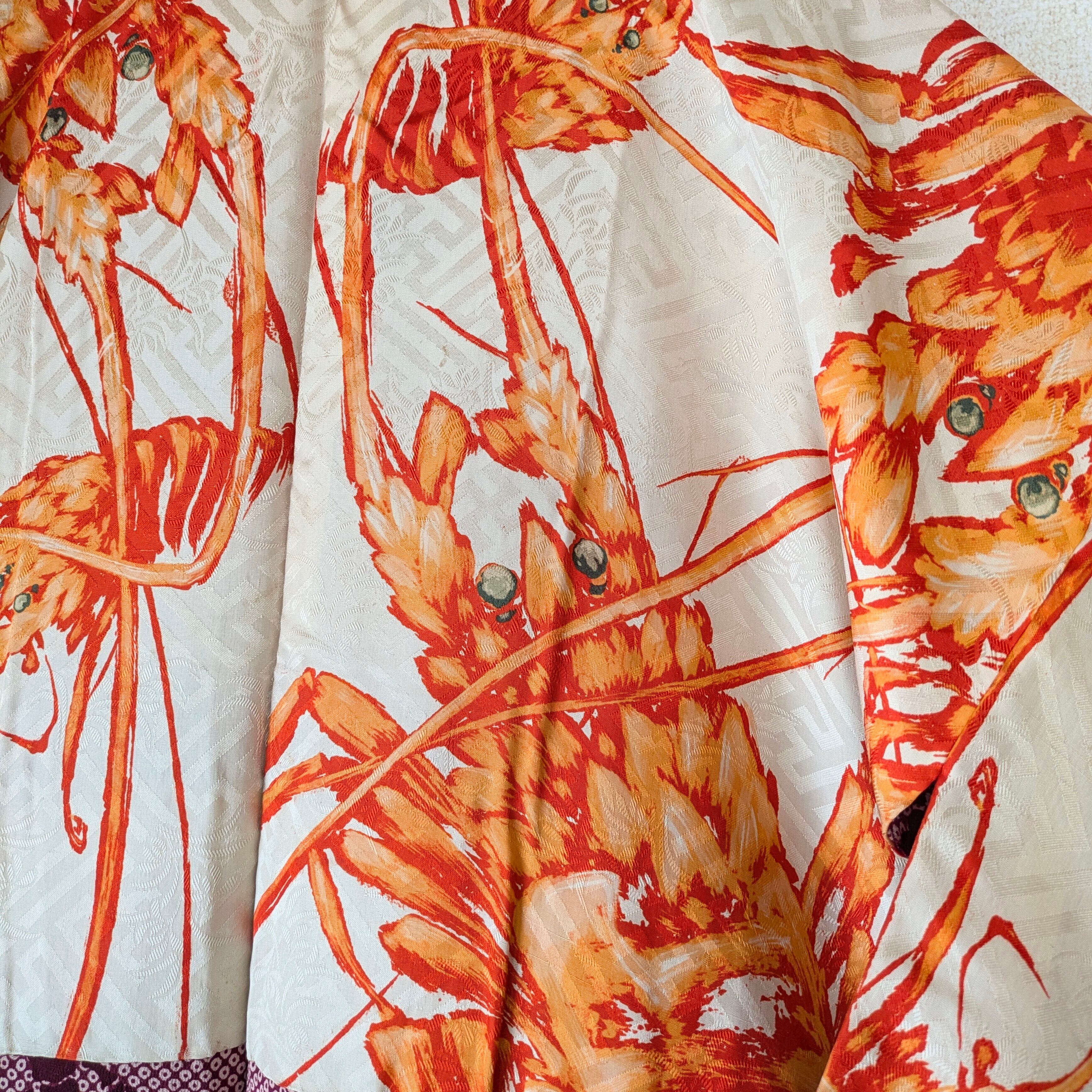 鹿の子柄に花丸文様をあしらった縮緬の長羽織です。こちらの羽織の注目ポイントは、伊勢海老が縦横無尽に埋め尽くす、その個性的な羽裏です。