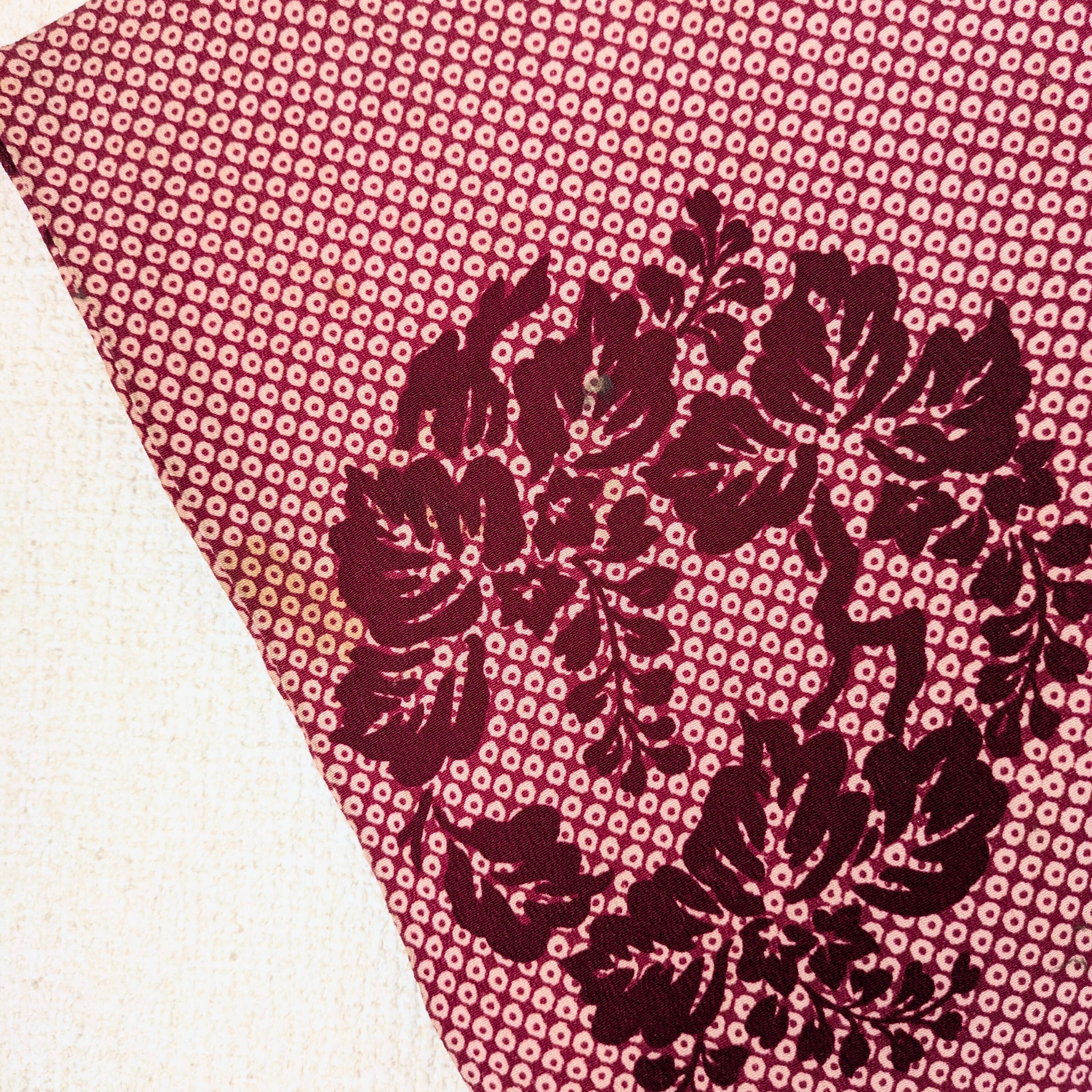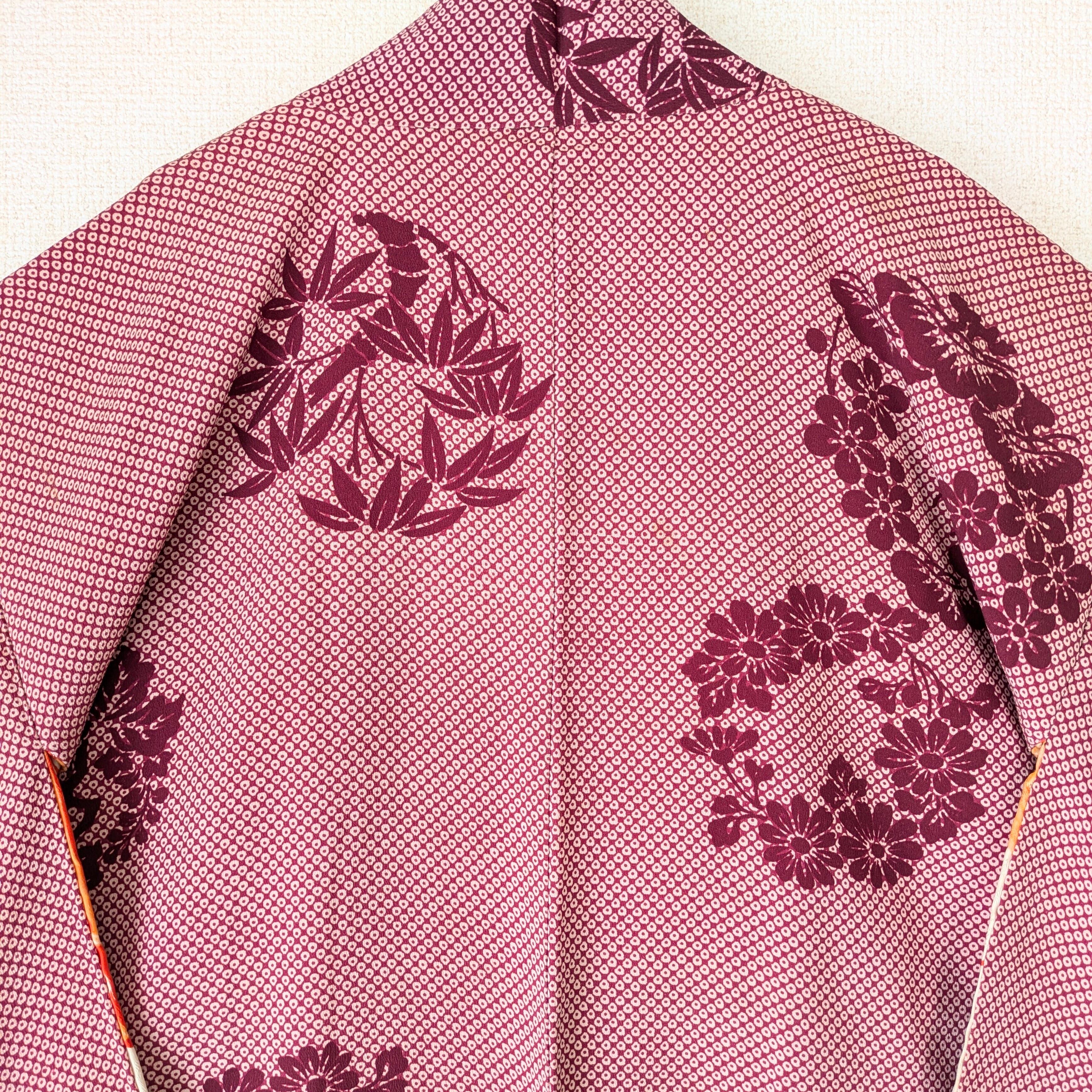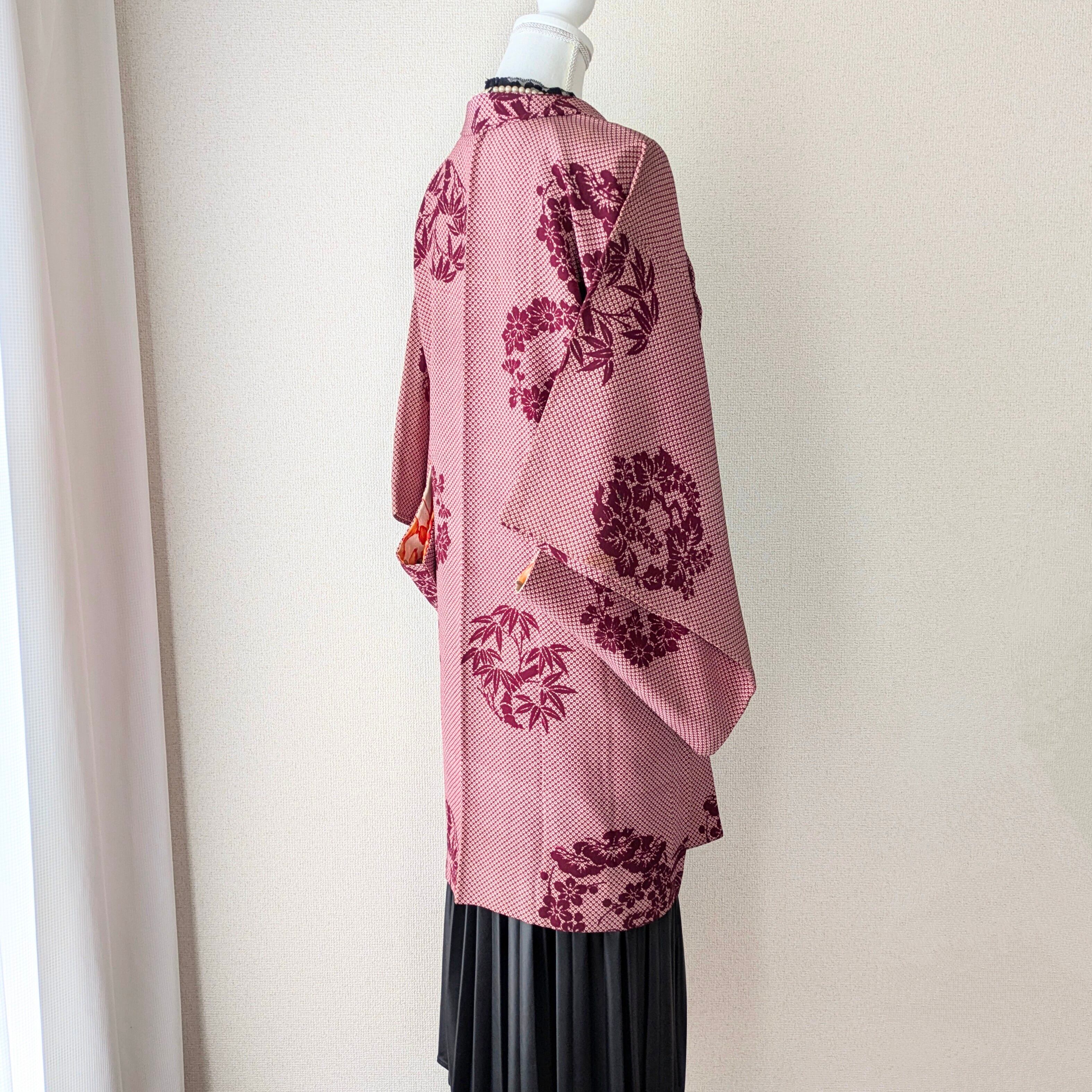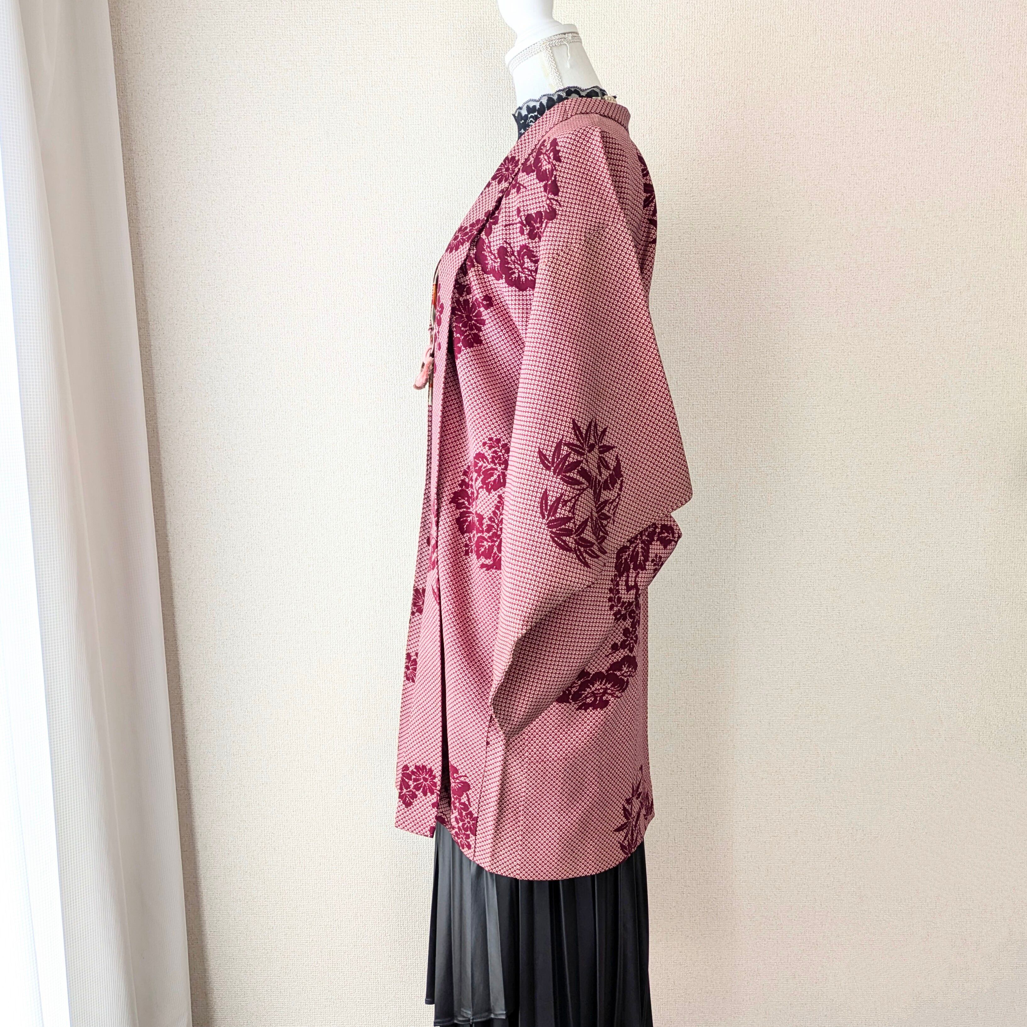 鹿の子柄に花丸文様をあしらった縮緬の長羽織です。こちらの羽織の注目ポイントは、伊勢海老が縦横無尽に埋め尽くす、その個性的な羽裏です。
