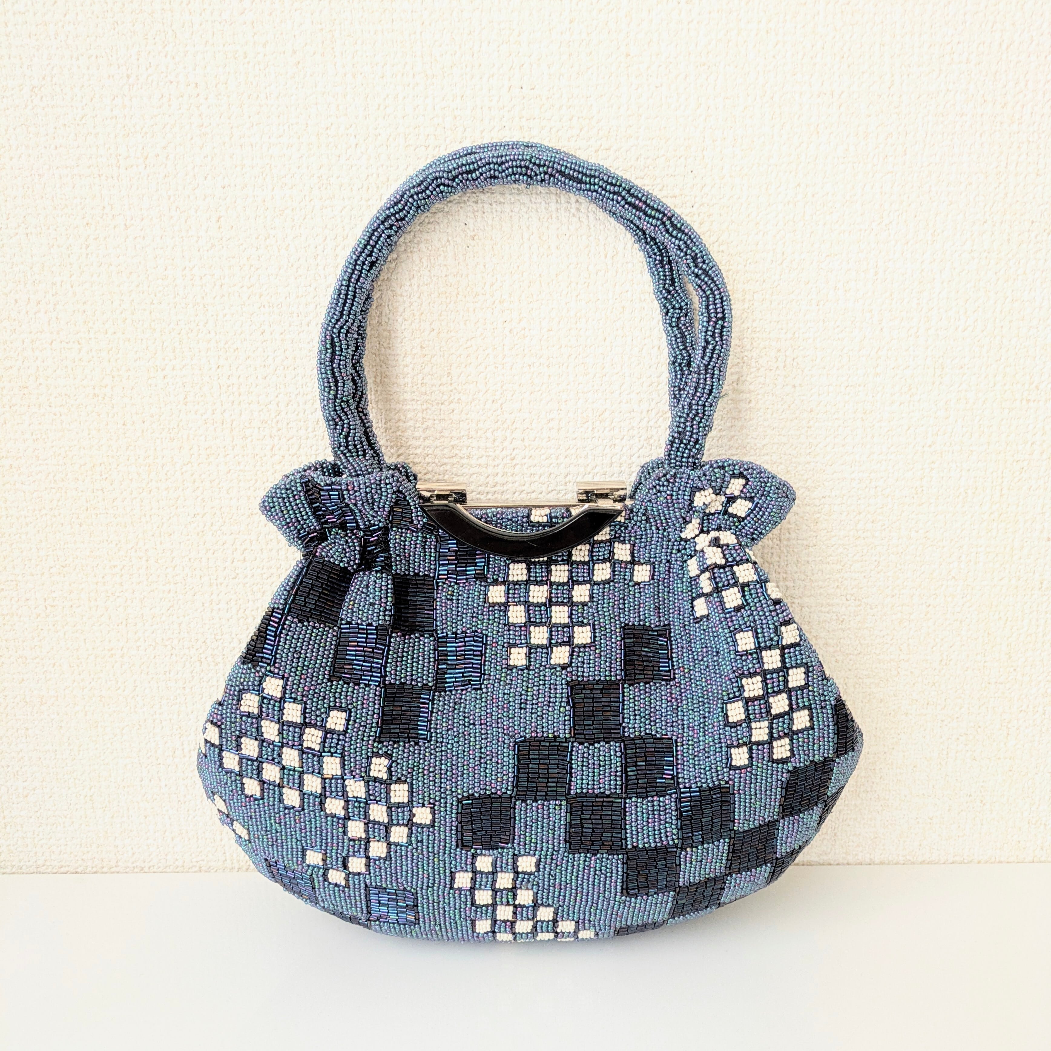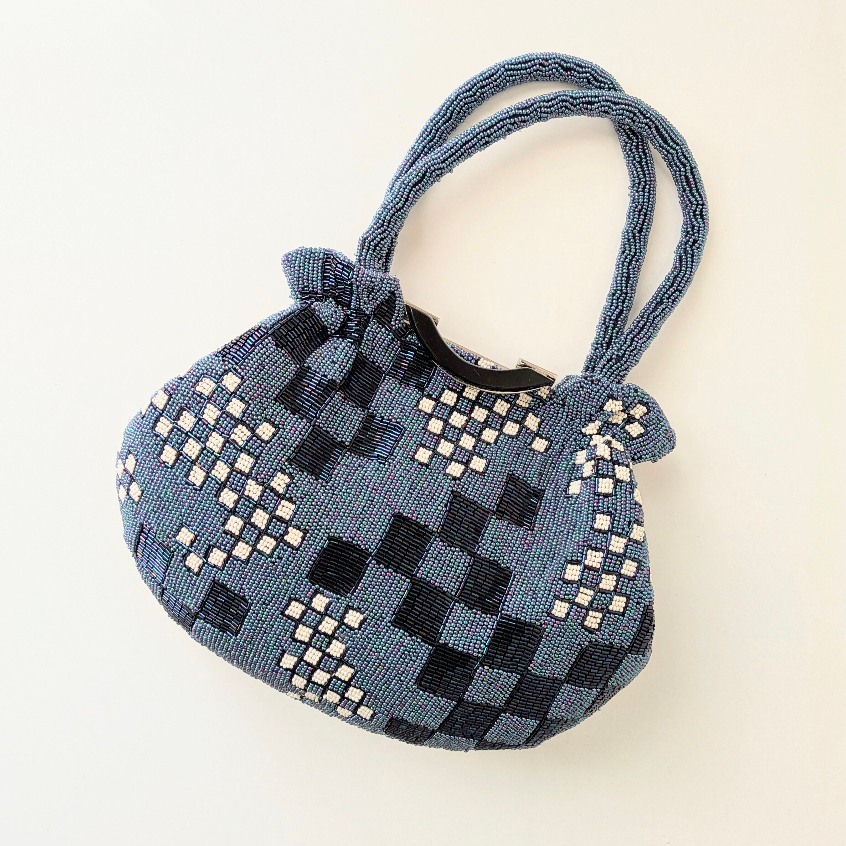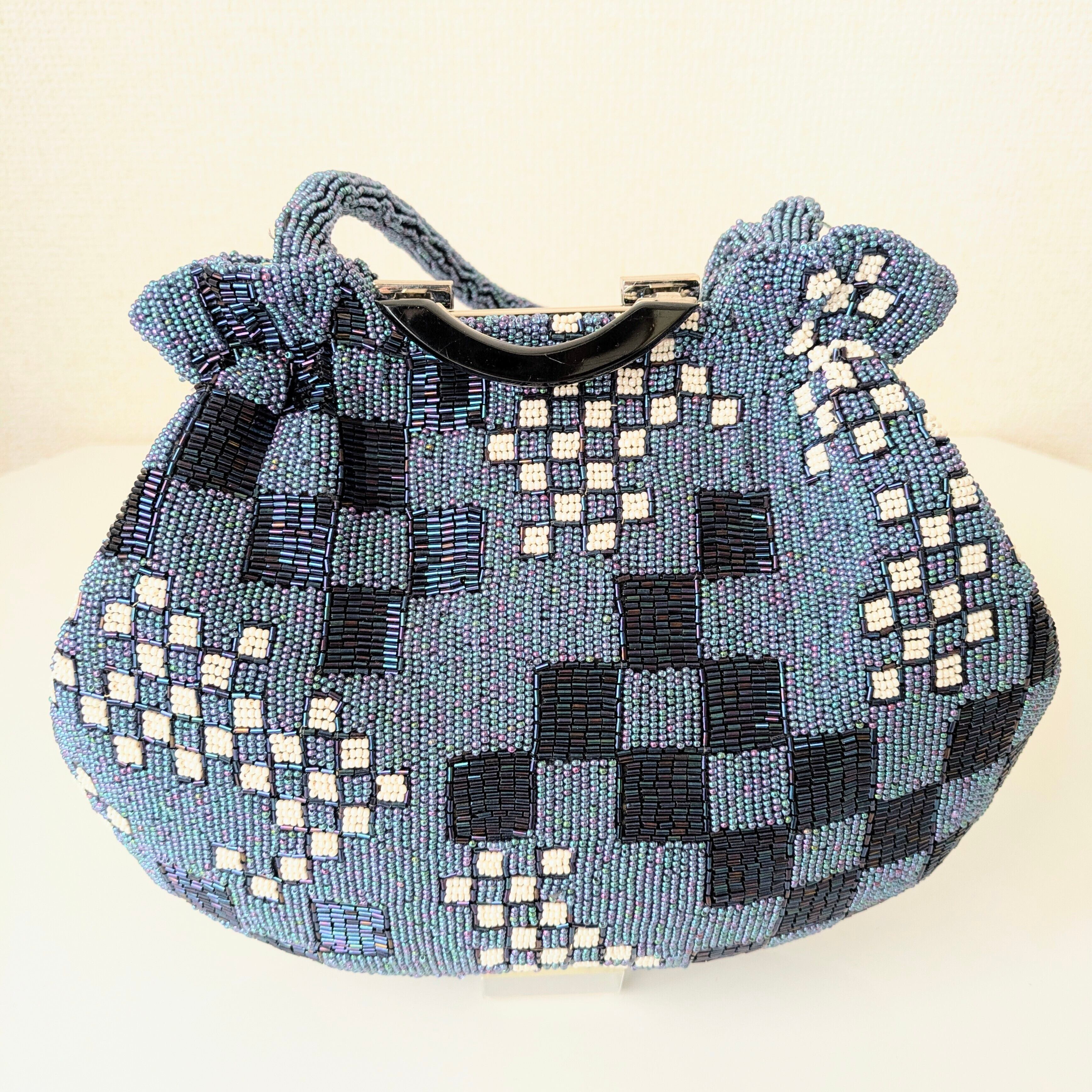 【Vintage】ビーズ刺繍バッグ 青 変わり市松模様 パーティーバッグ 昭和レトロ 大正浪漫 フォーマルバッグ