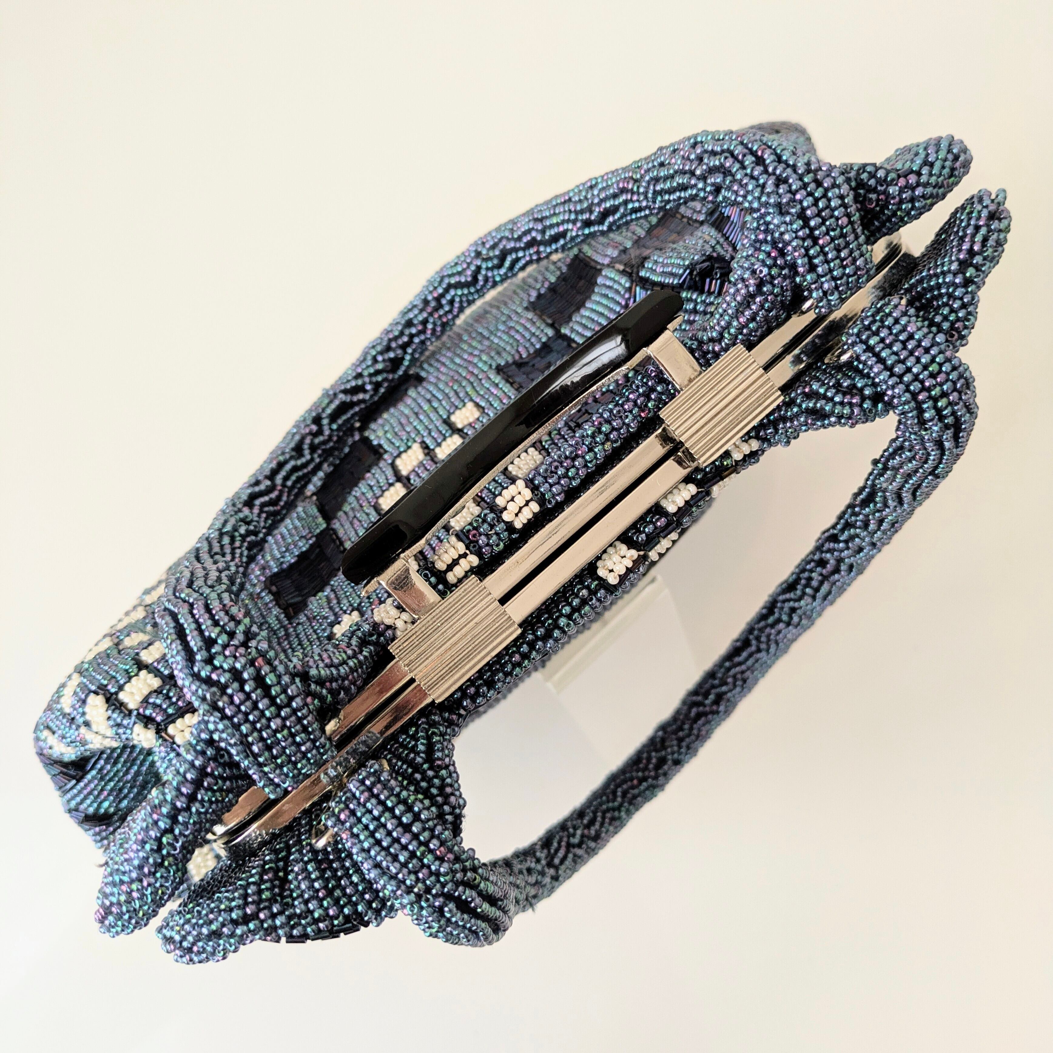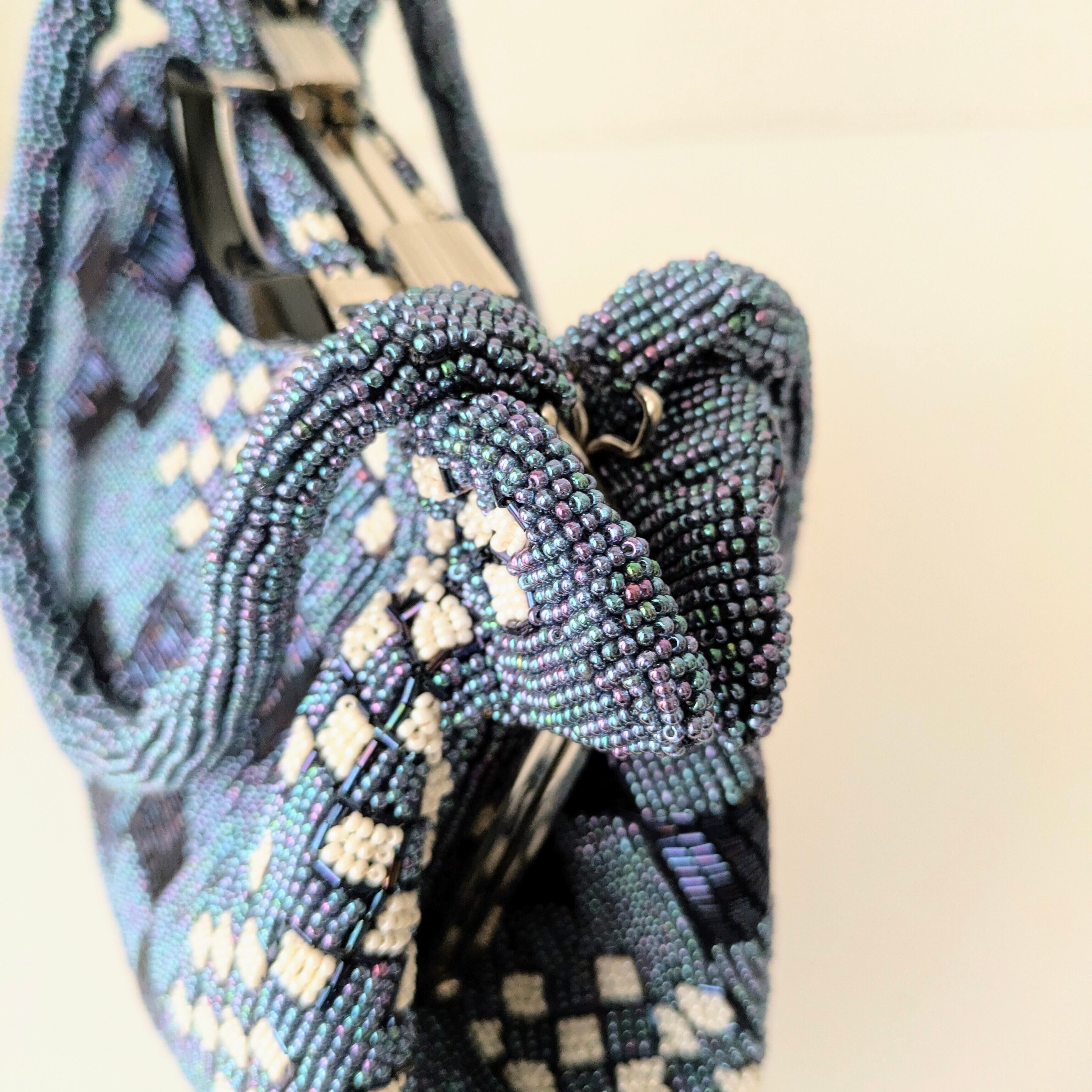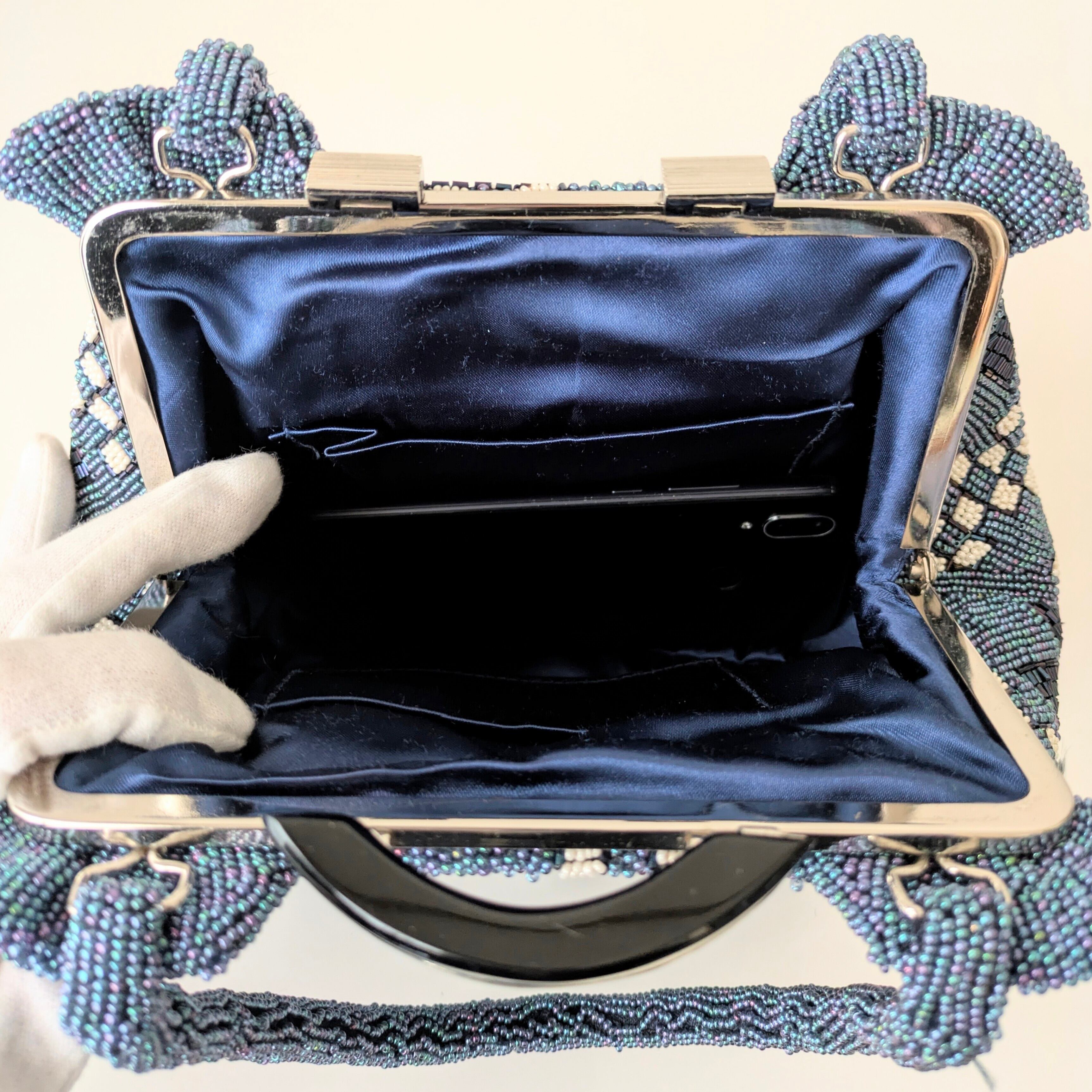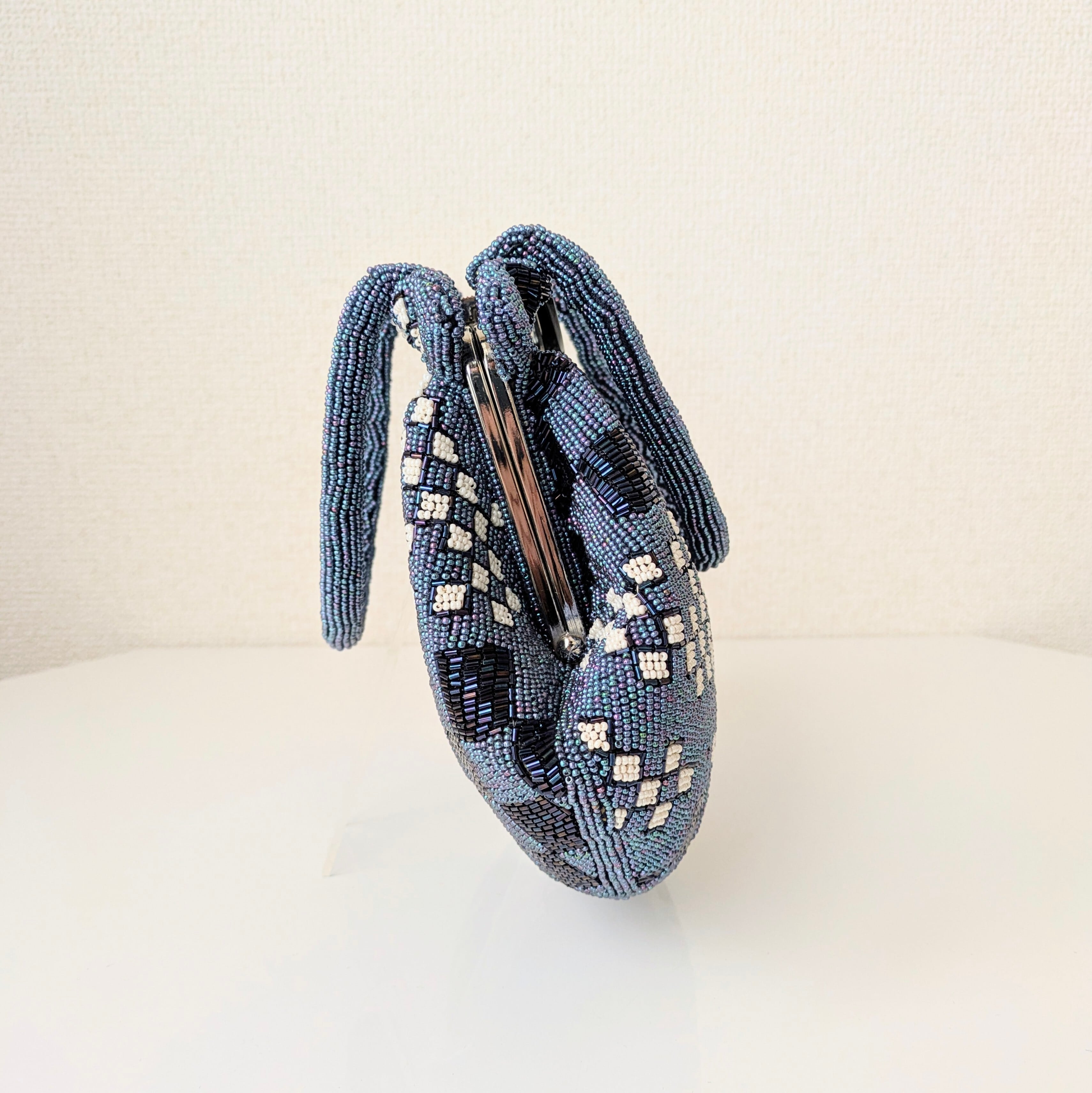【Vintage】ビーズ刺繍バッグ 青 変わり市松模様 パーティーバッグ 昭和レトロ 大正浪漫 フォーマルバッグ