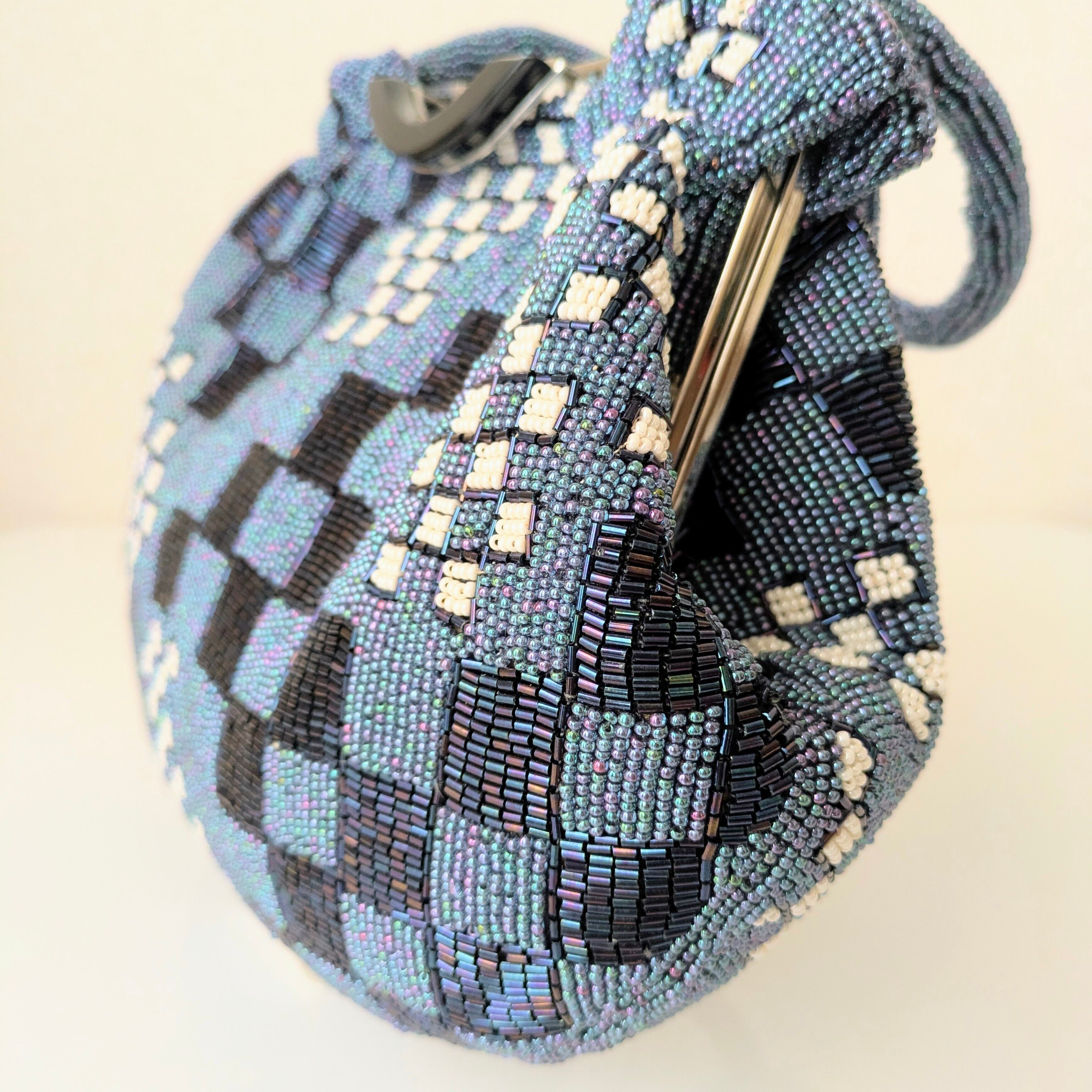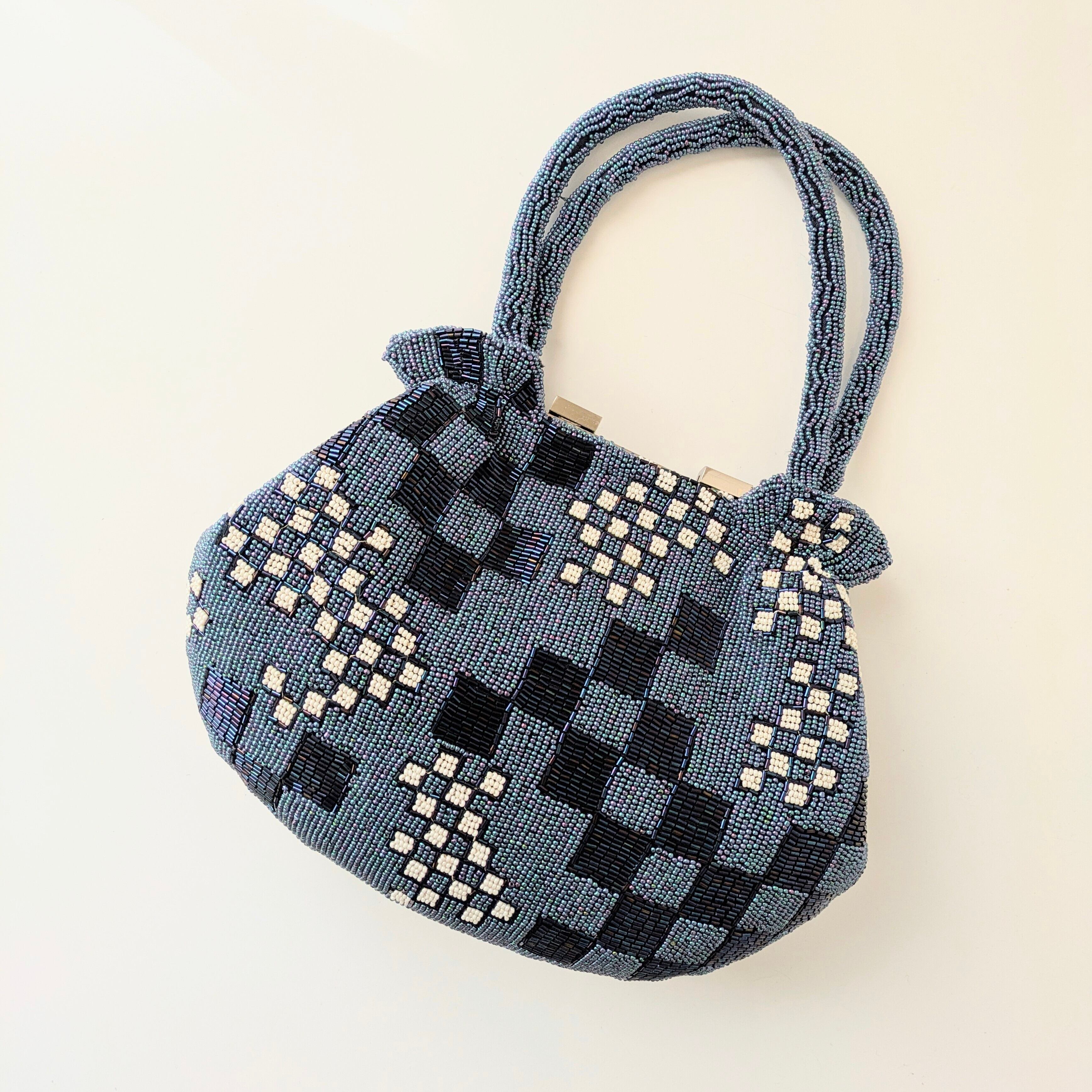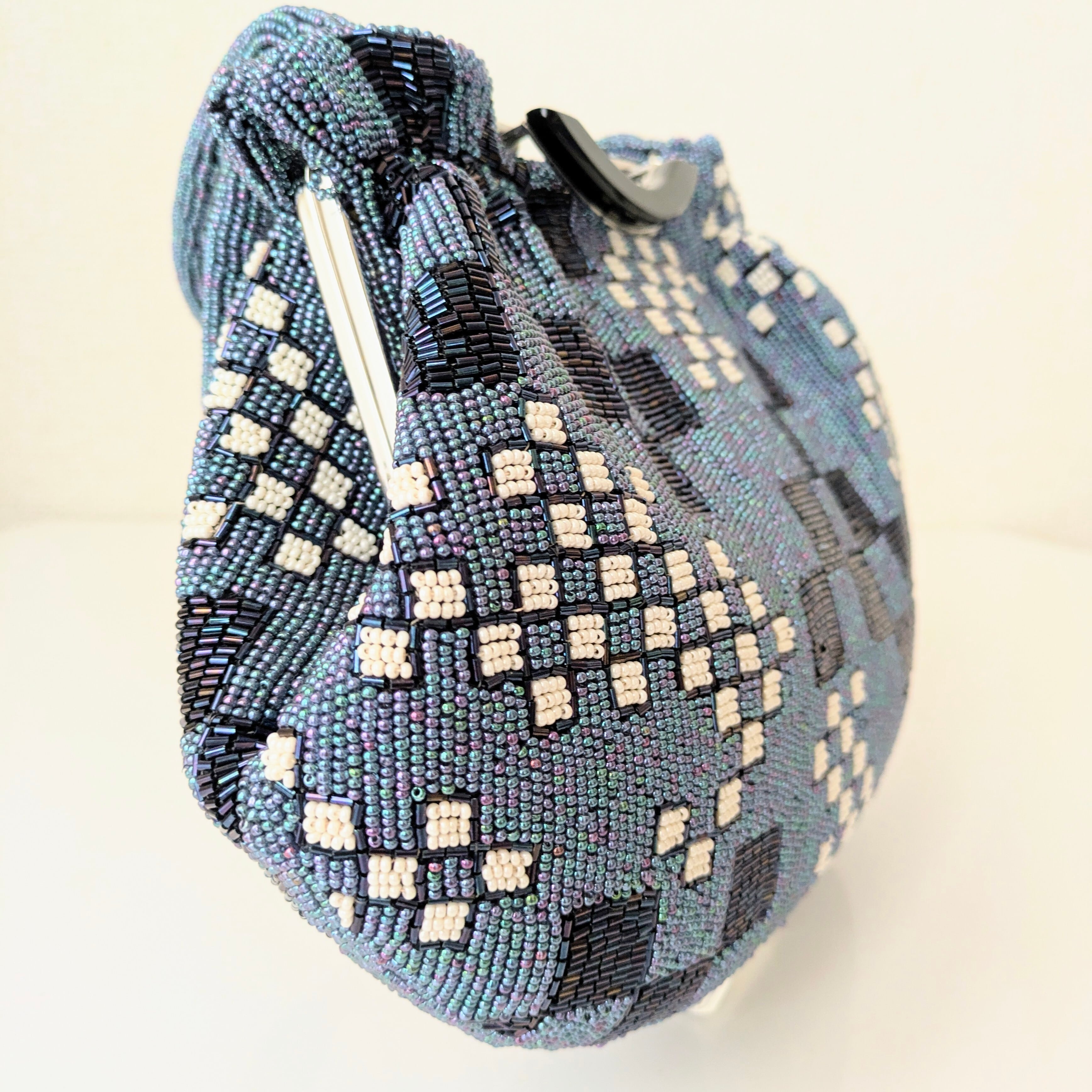 青地に黒と白の市松模様といった、シンプルでクールな柄が目を惹くビーズバッグです。