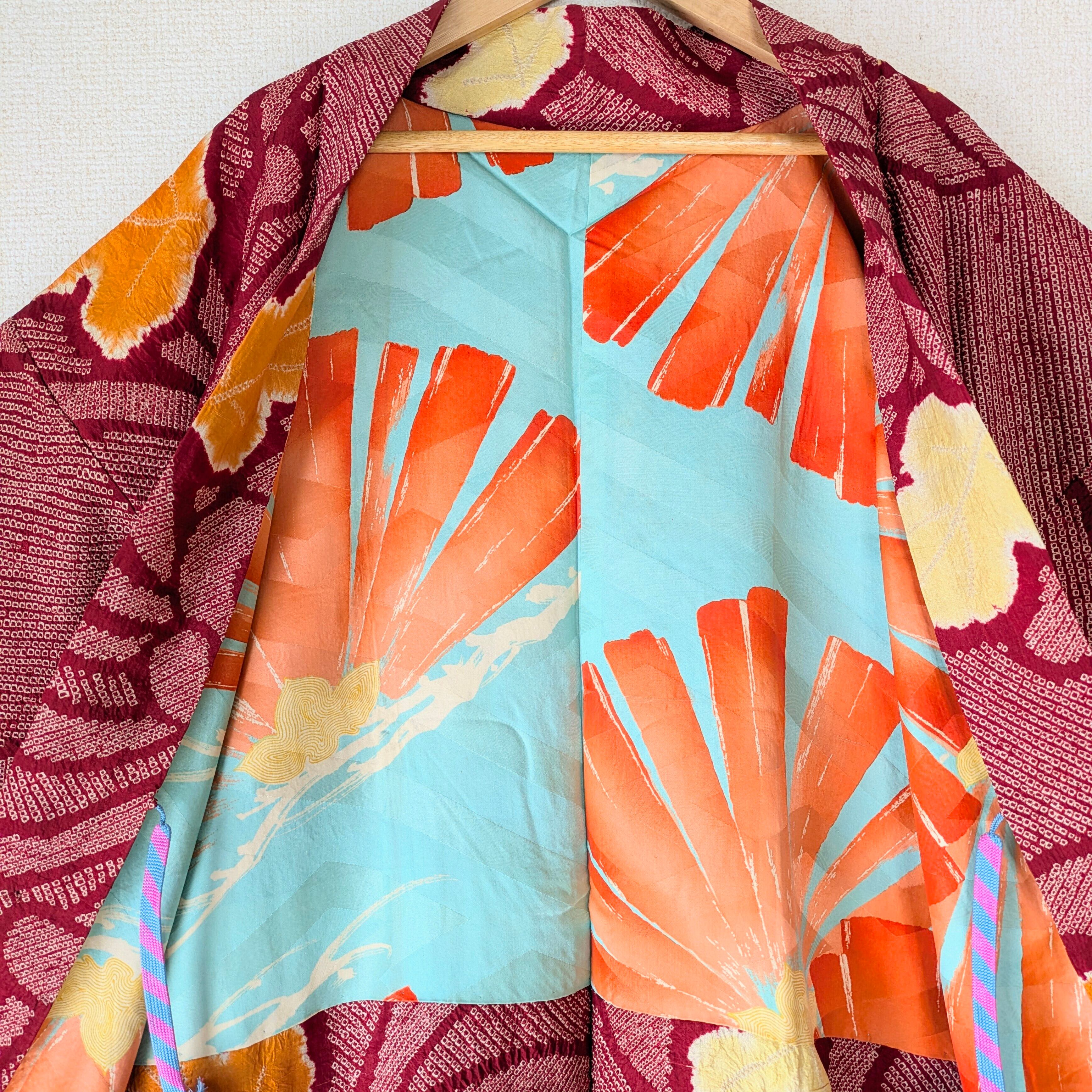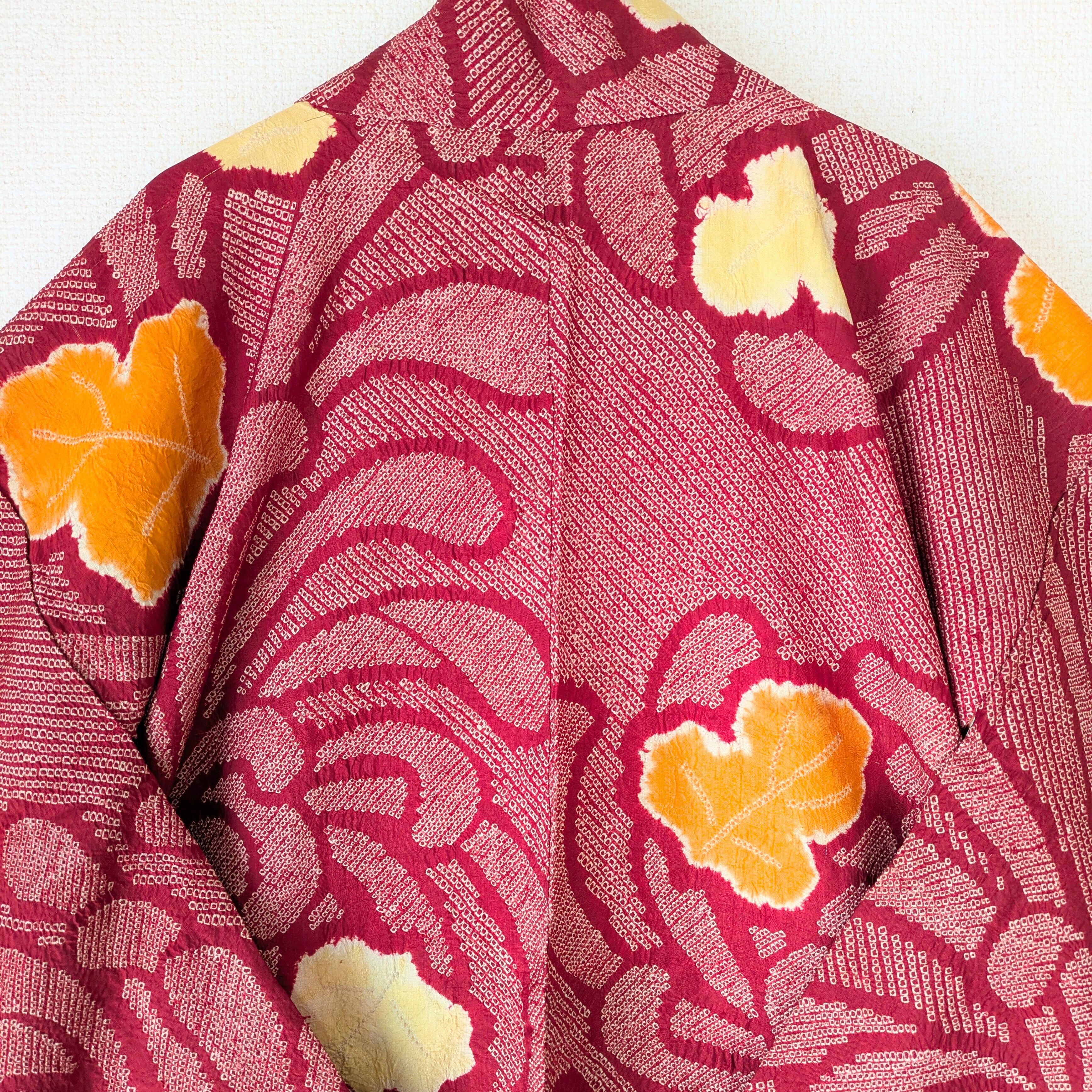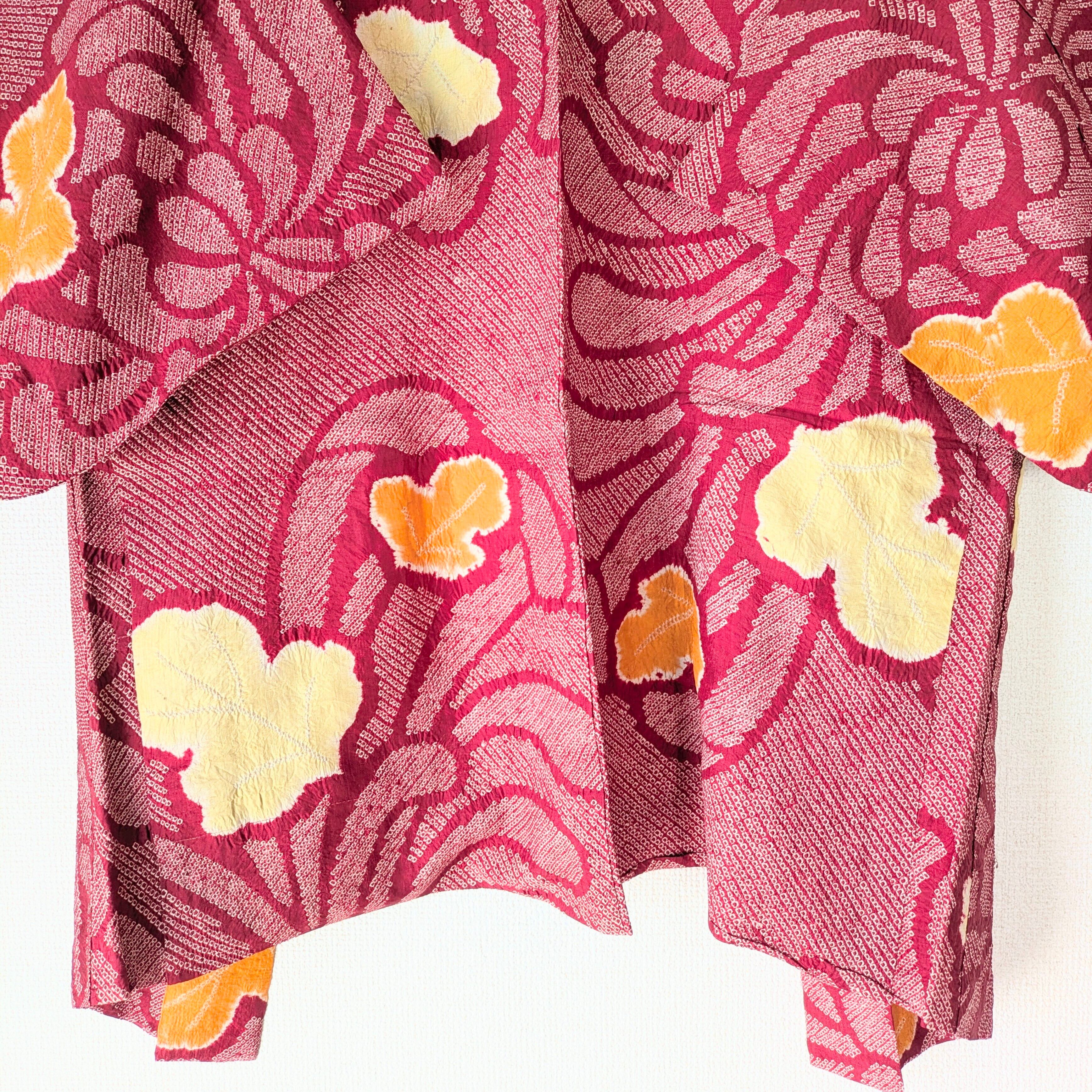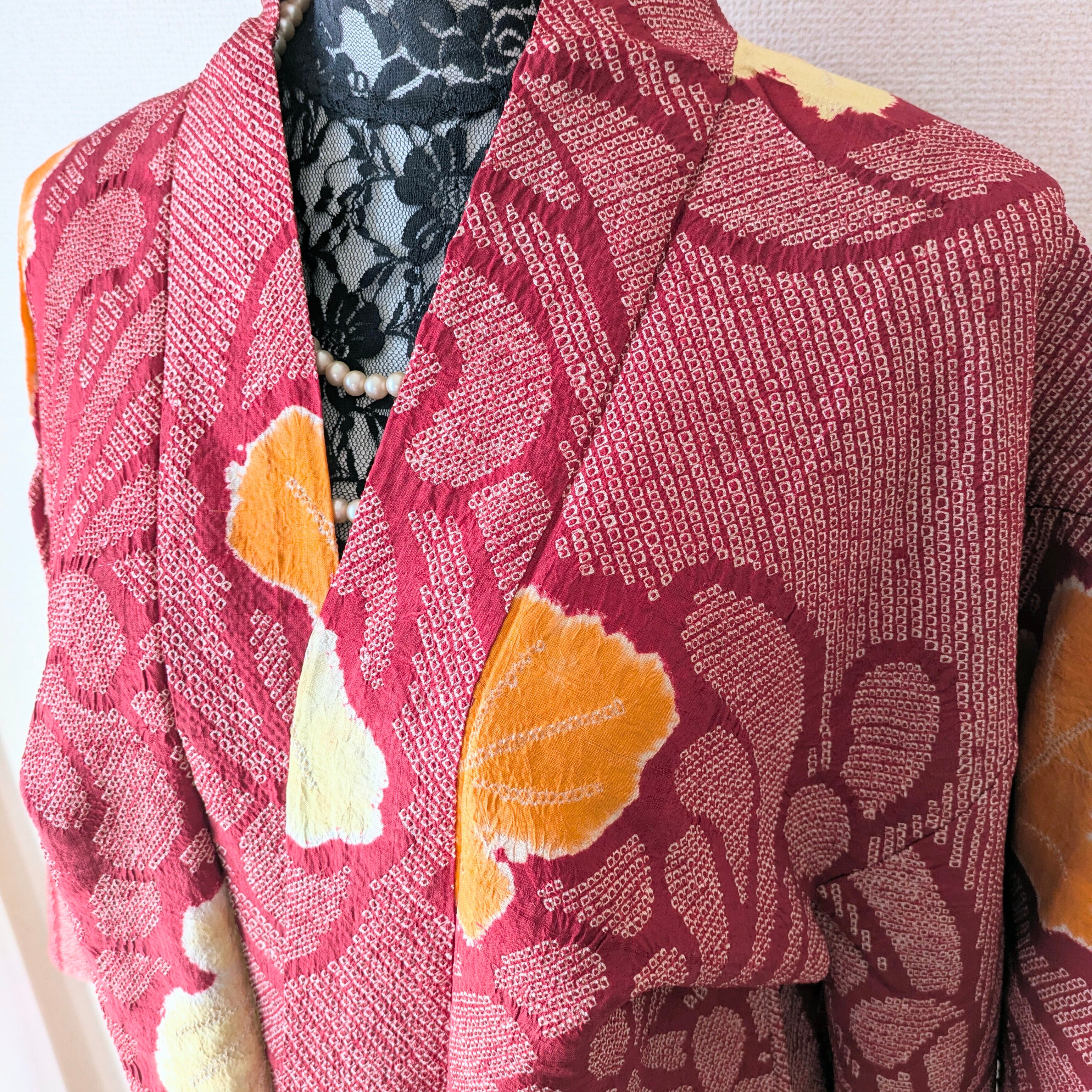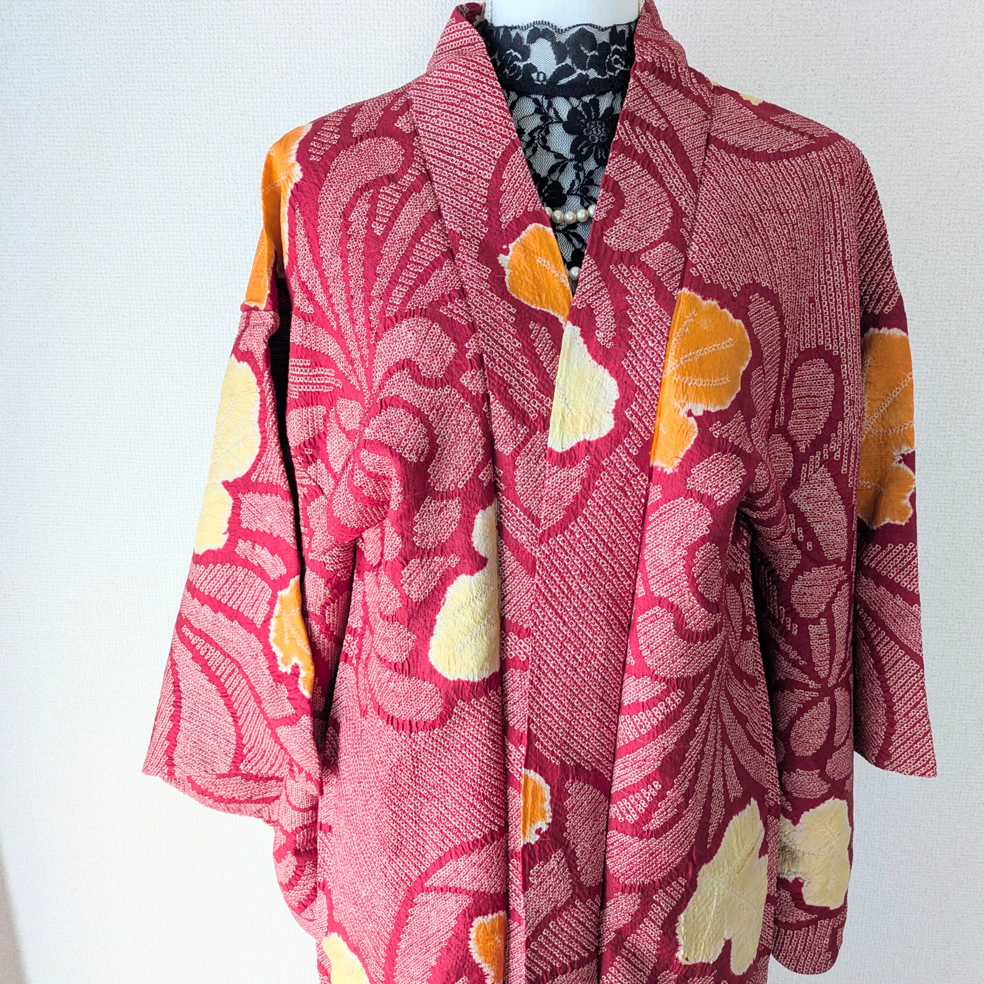 赤の総絞りの長羽織です。舞っているかのような菊の模様に葉っぱの飛び柄がデザインされています。
