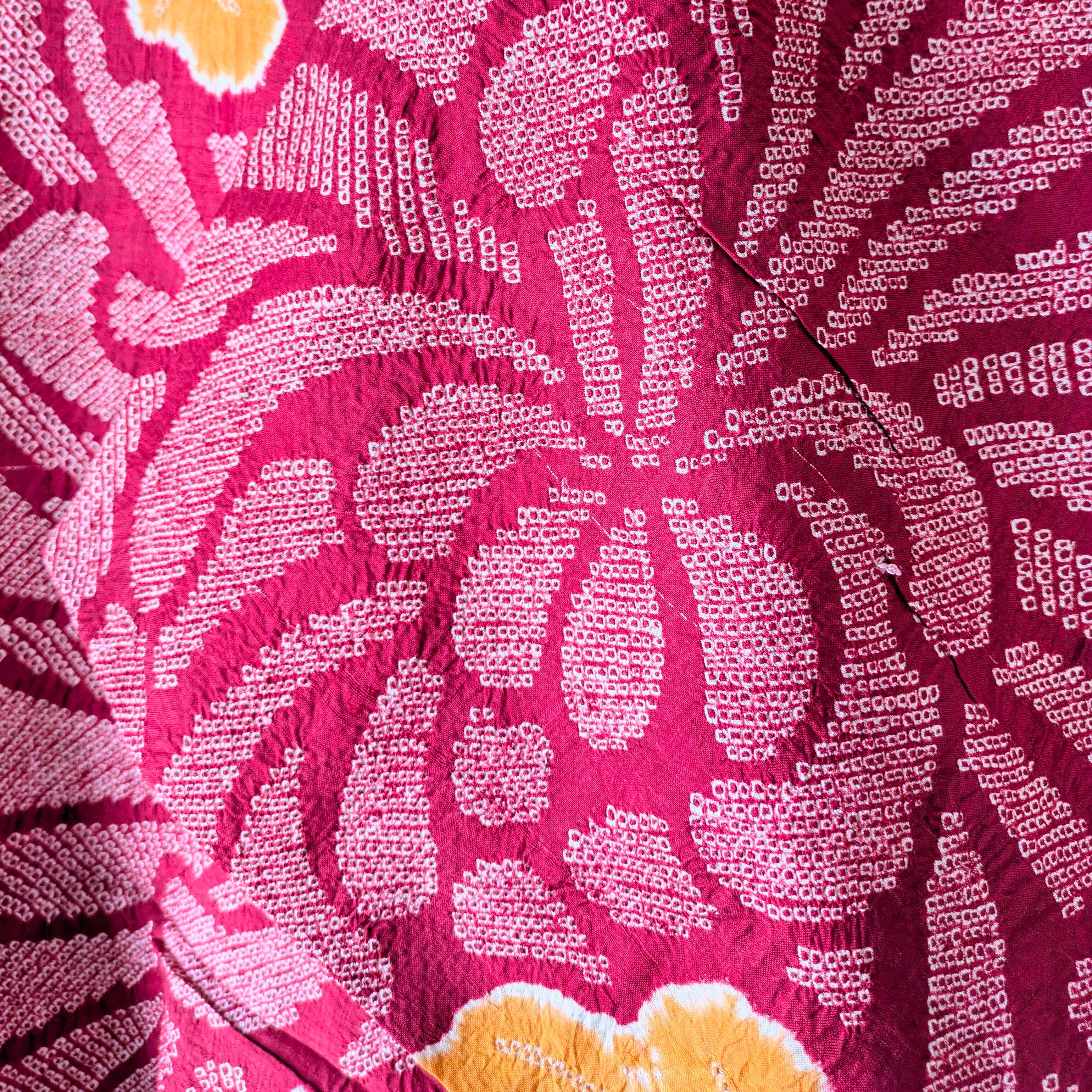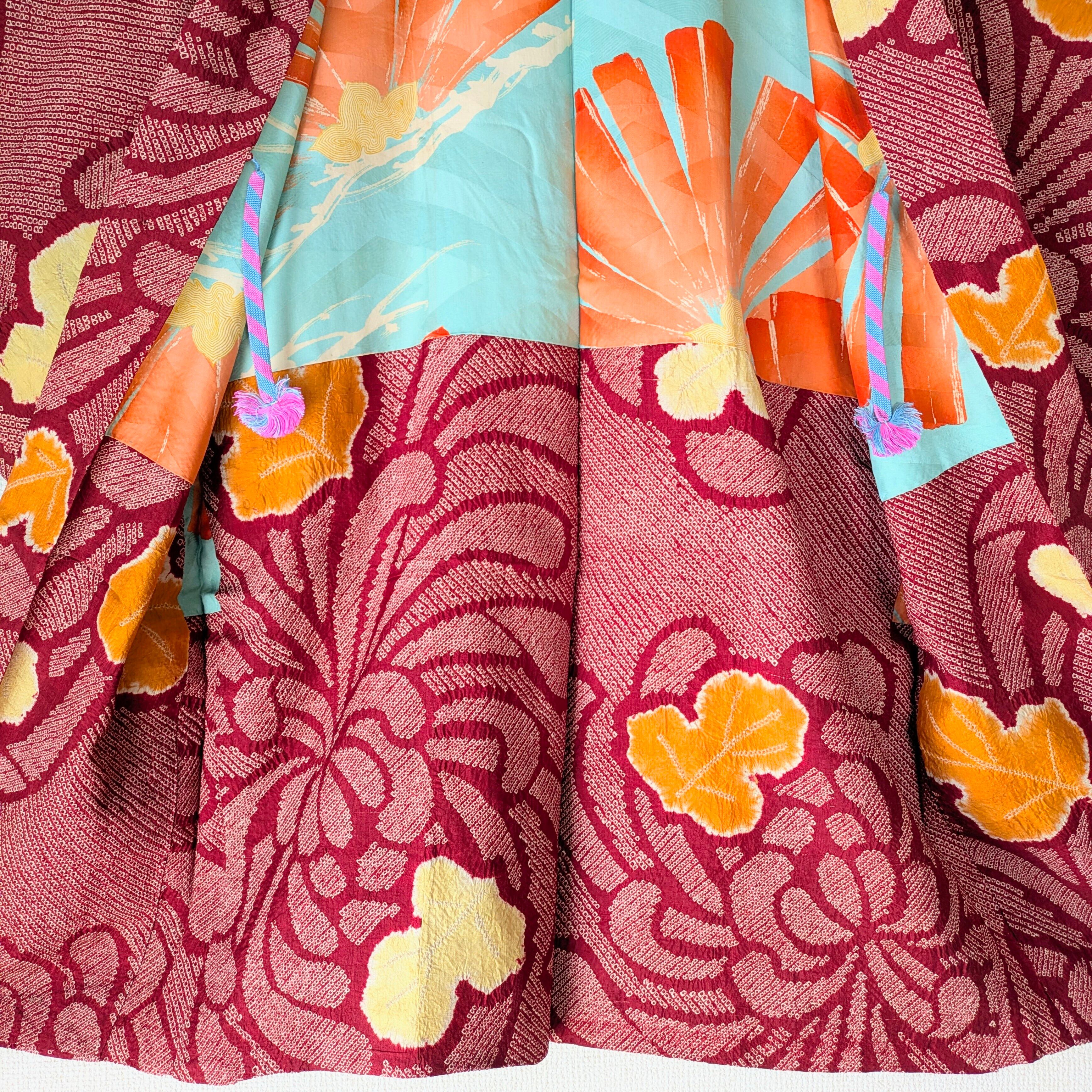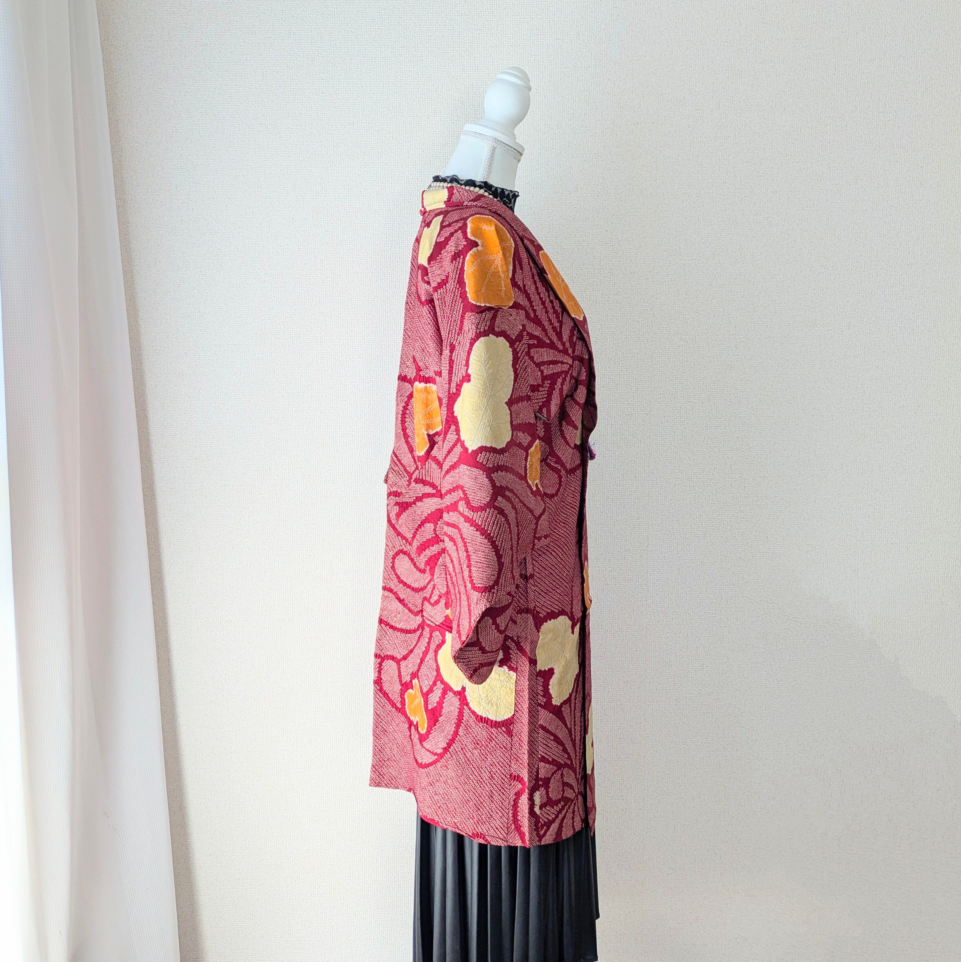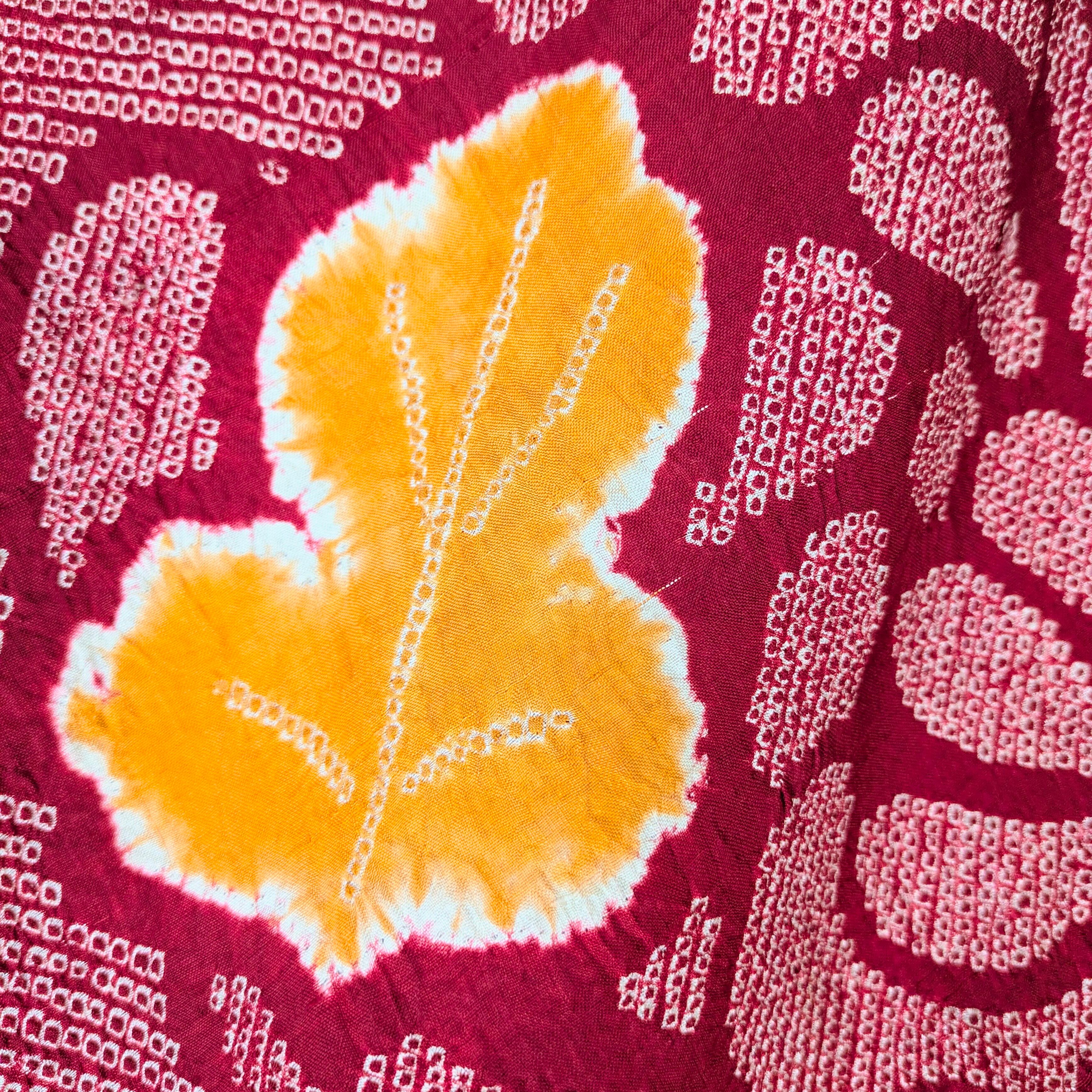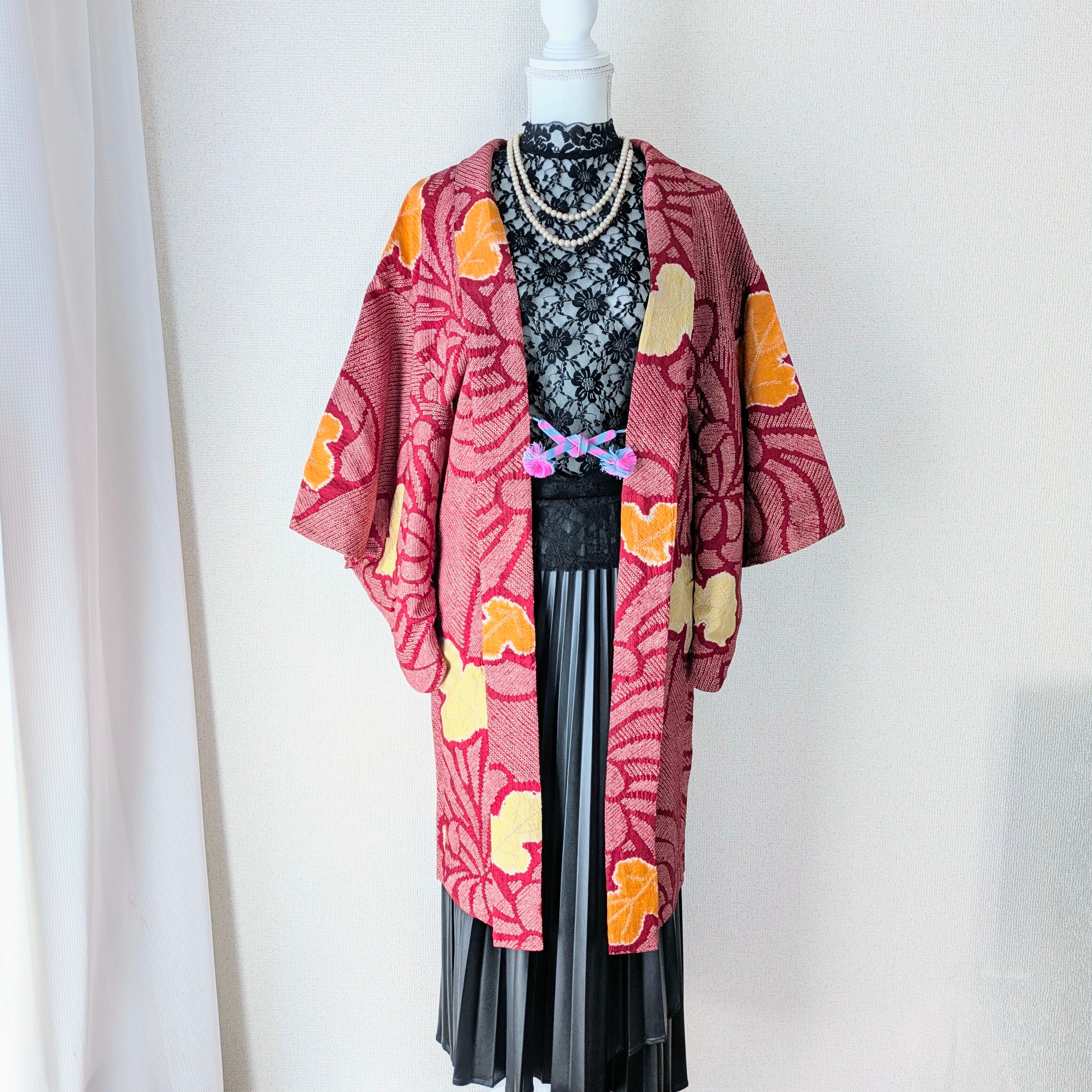 赤の総絞りの長羽織です。舞っているかのような菊の模様に葉っぱの飛び柄がデザインされています。