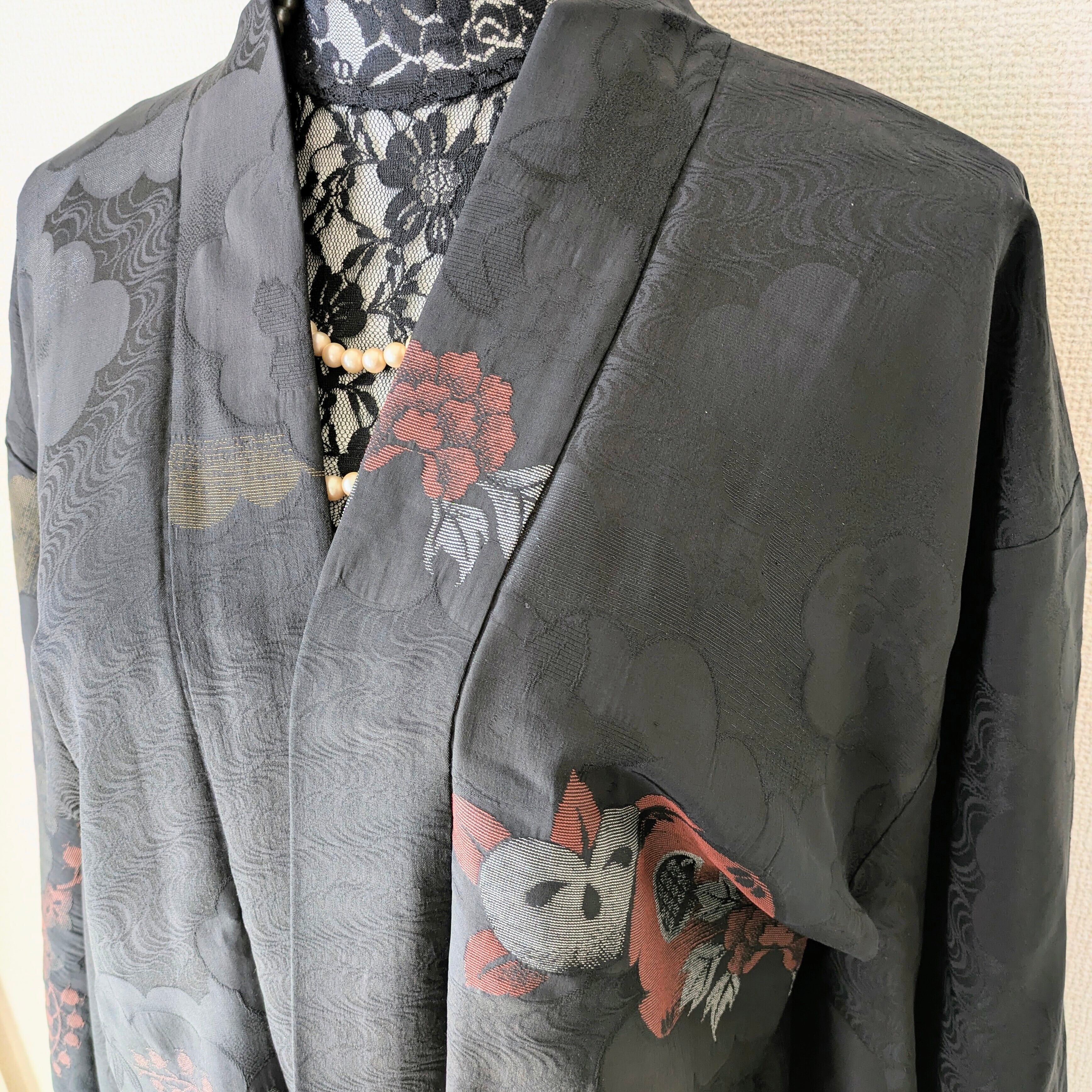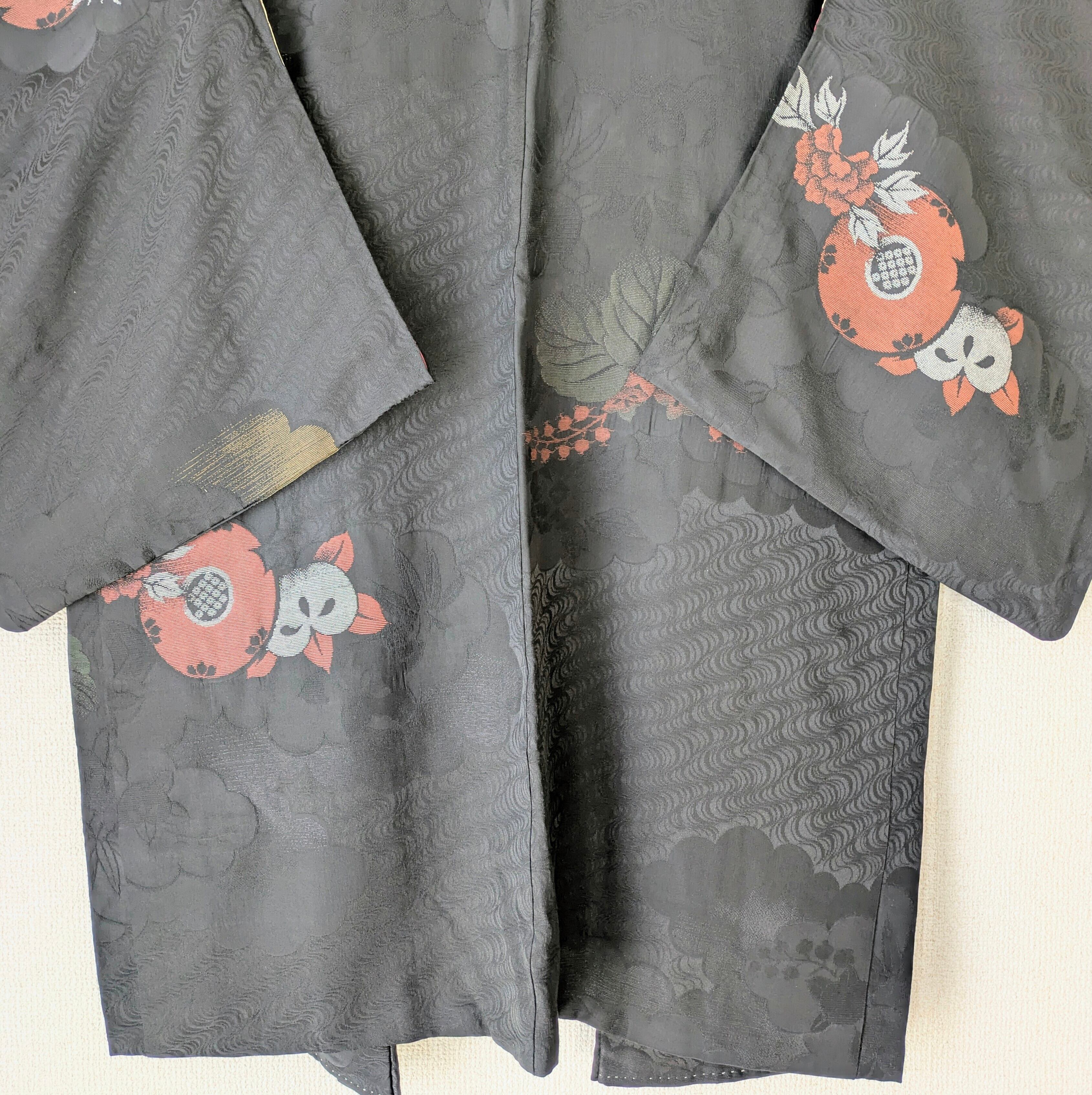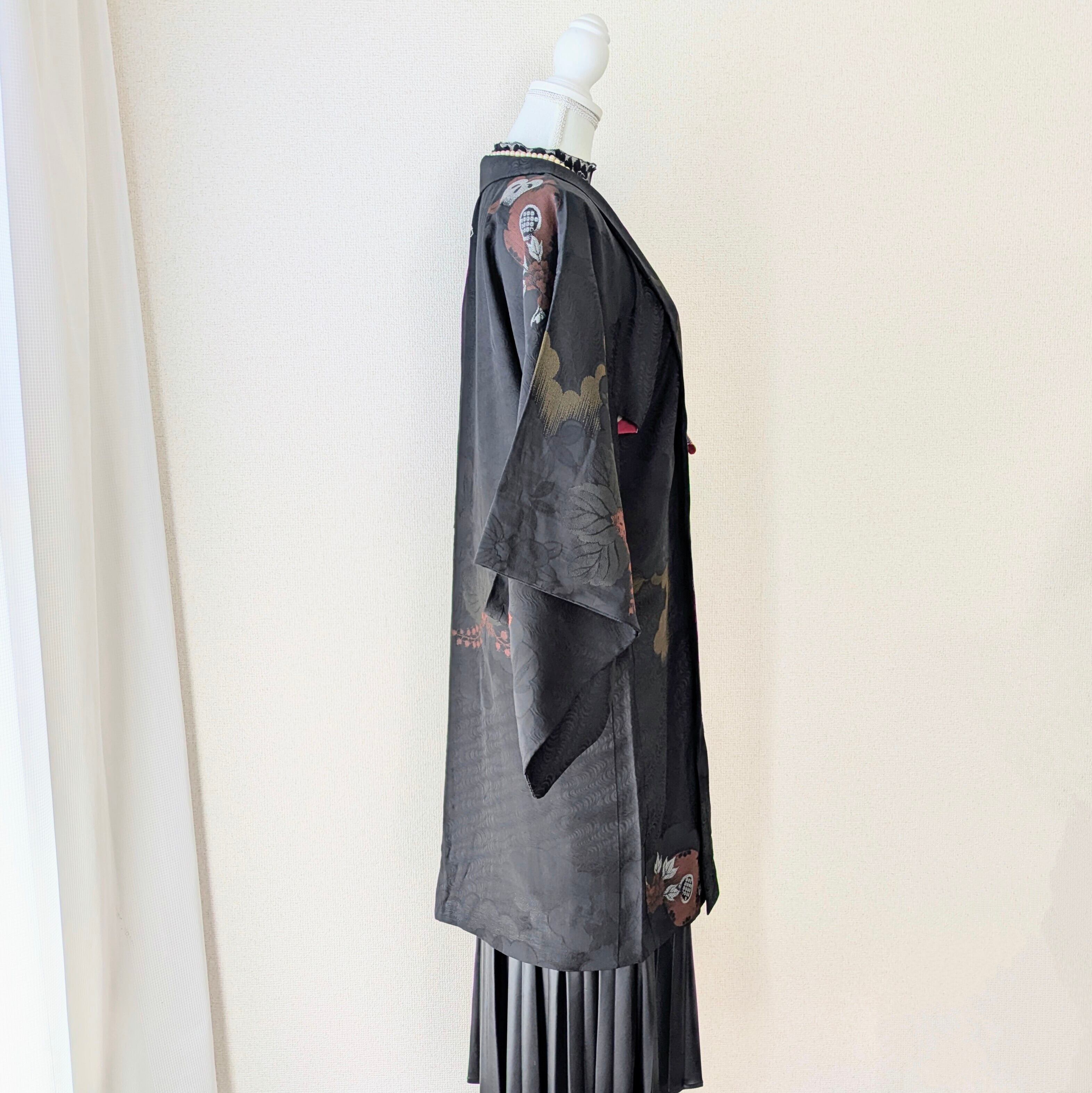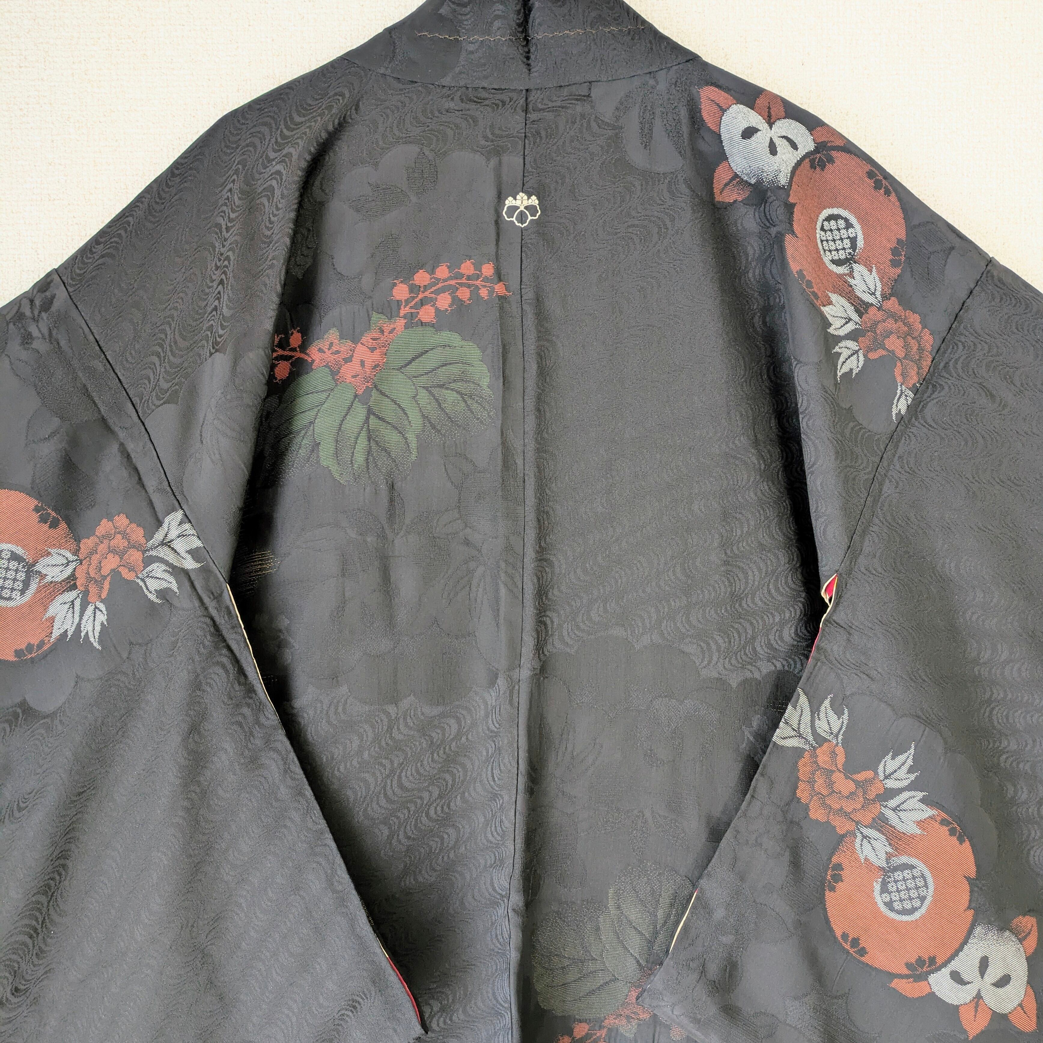 桐や橘などの古典柄、三つ紋の入った黒の絵羽織です。