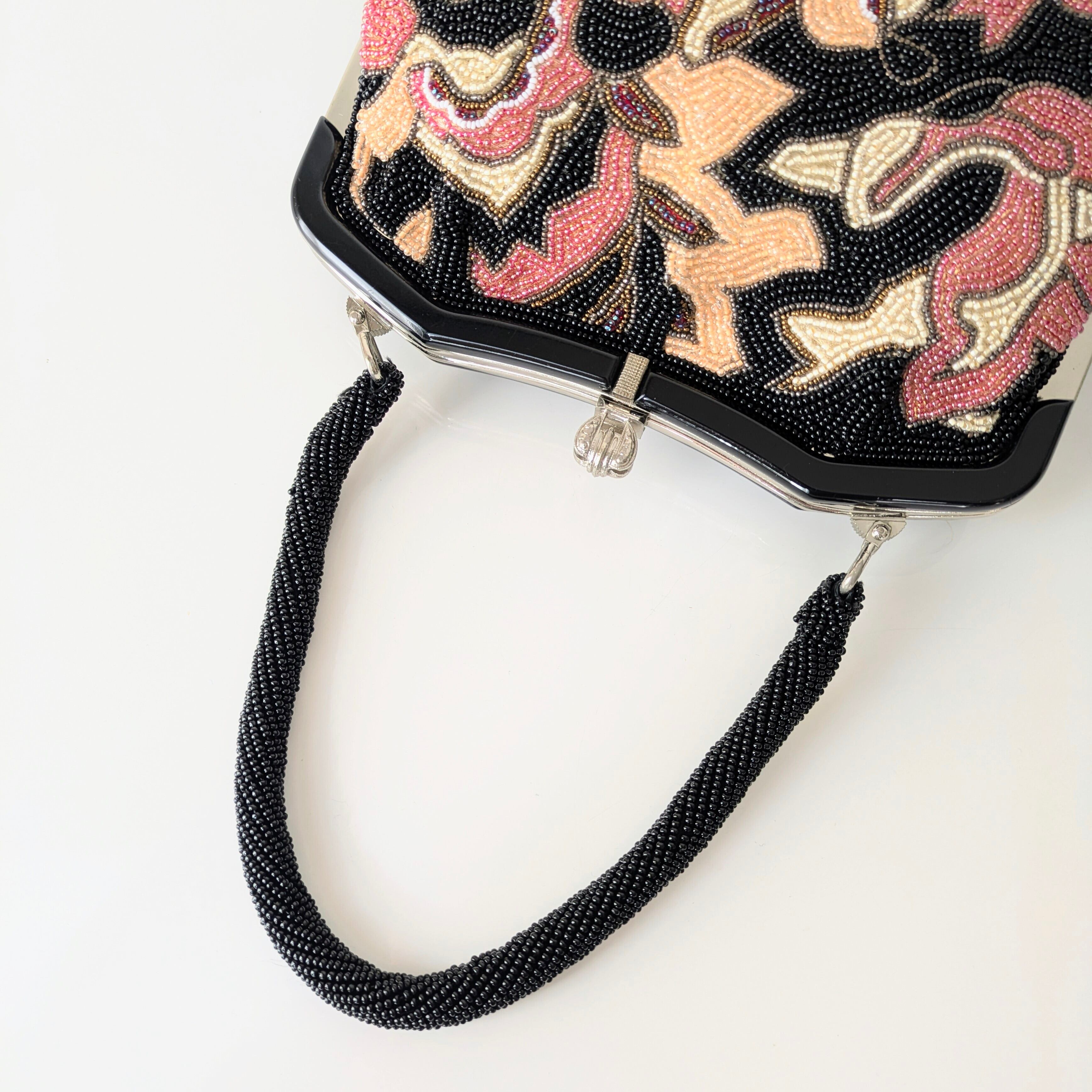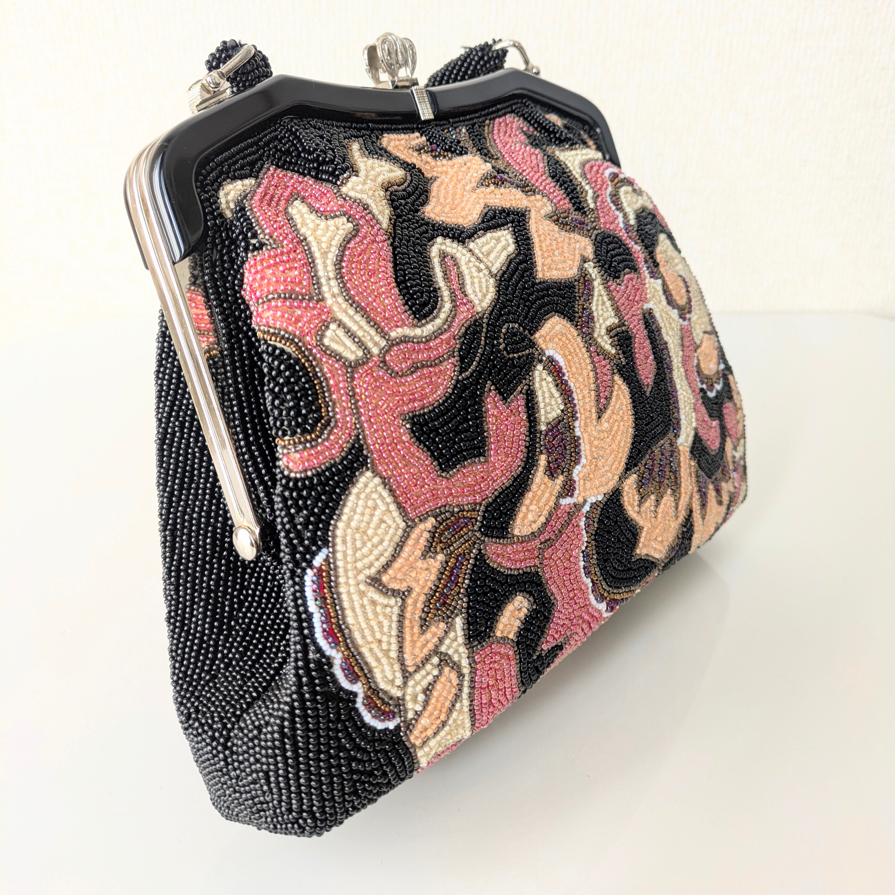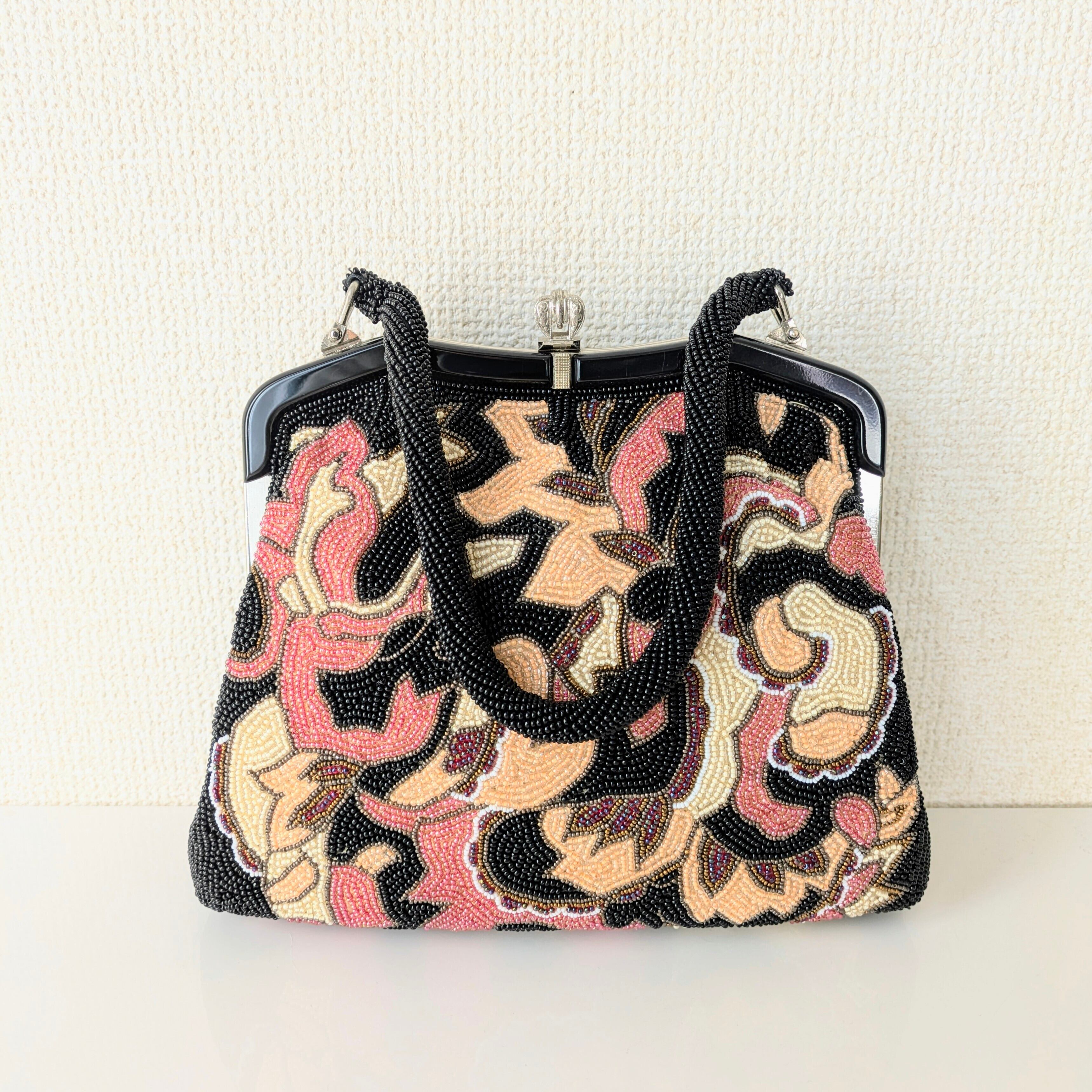 黒地に映えるカラフルな抽象画柄のビーズバッグです。斬新でユニークな柄は装いのアクセントになります。