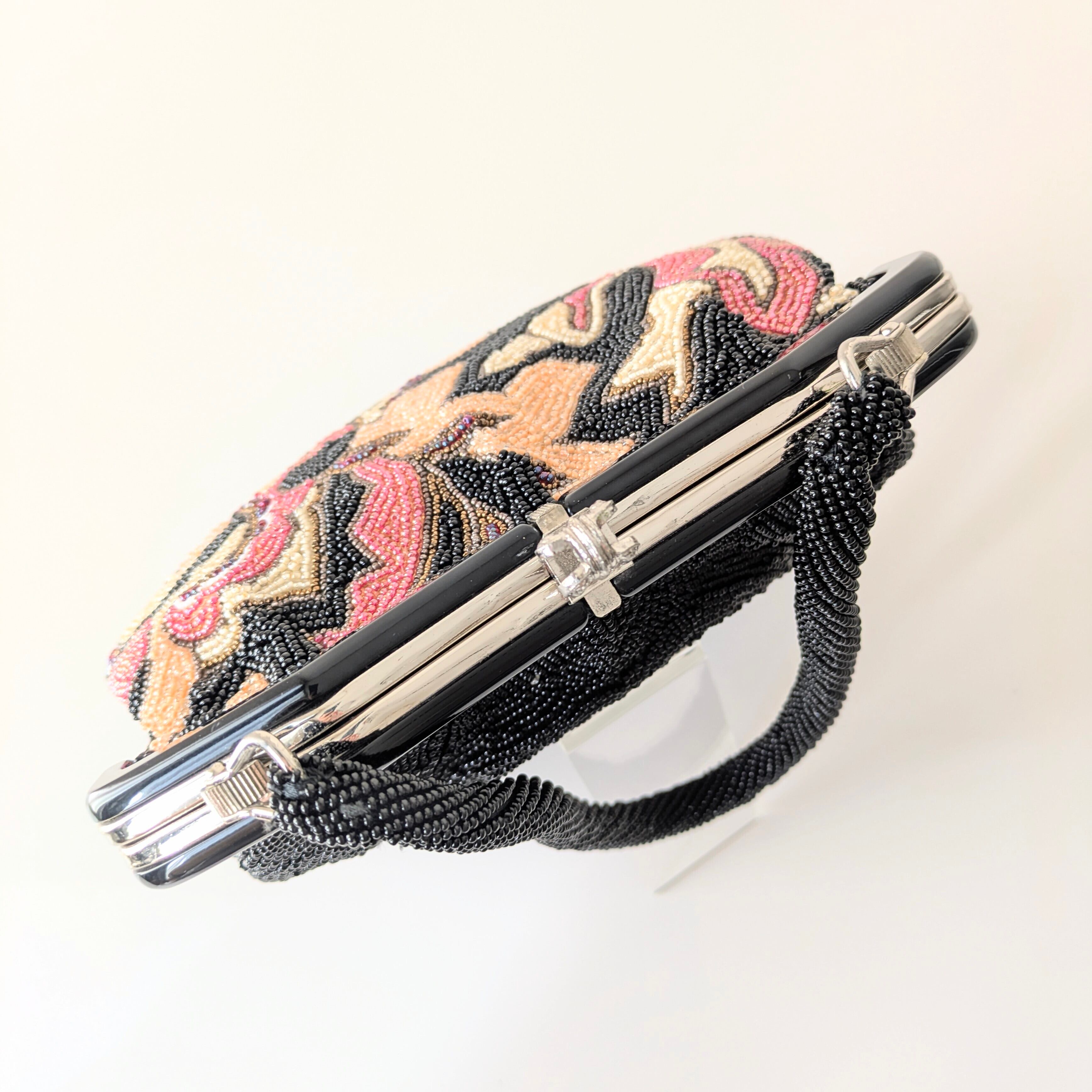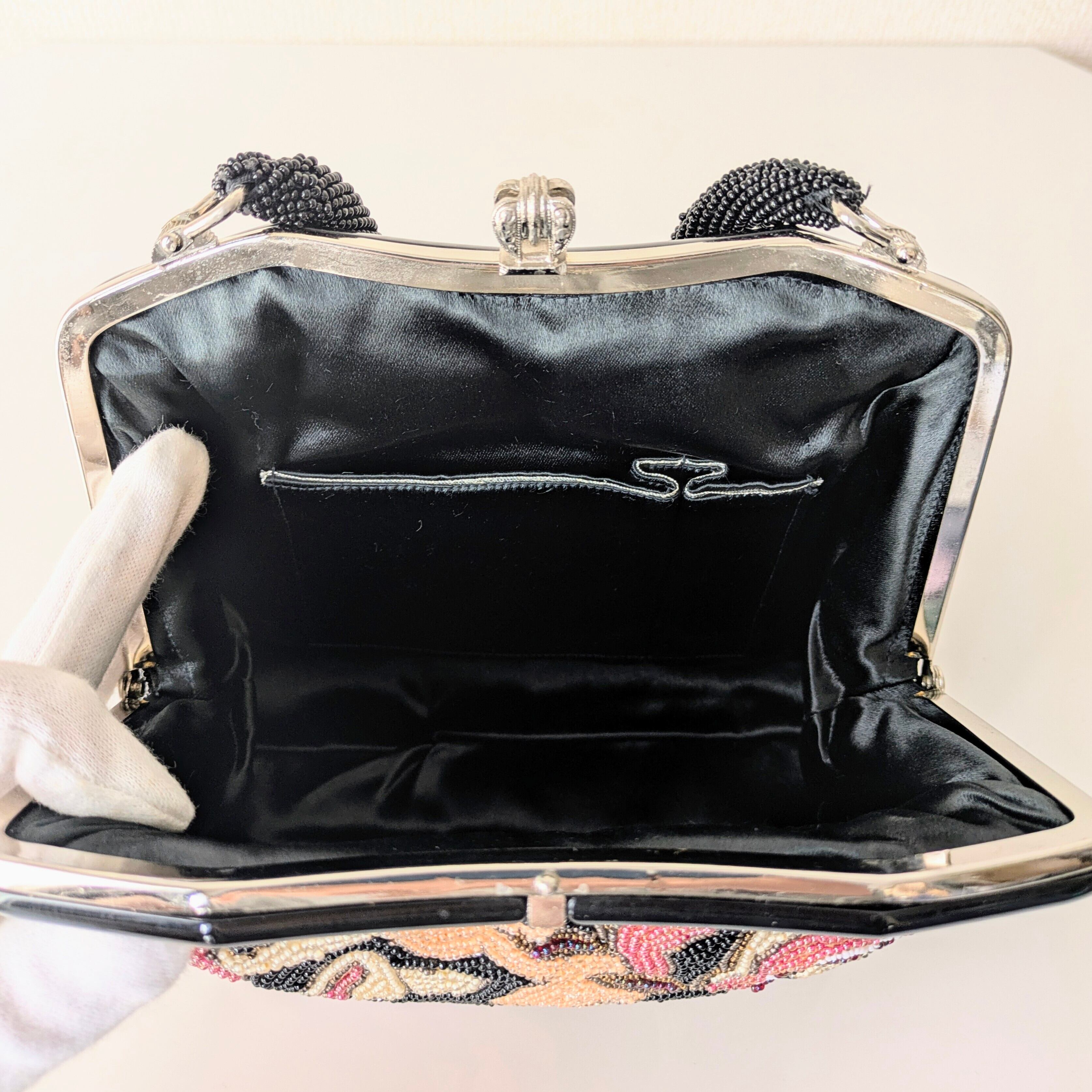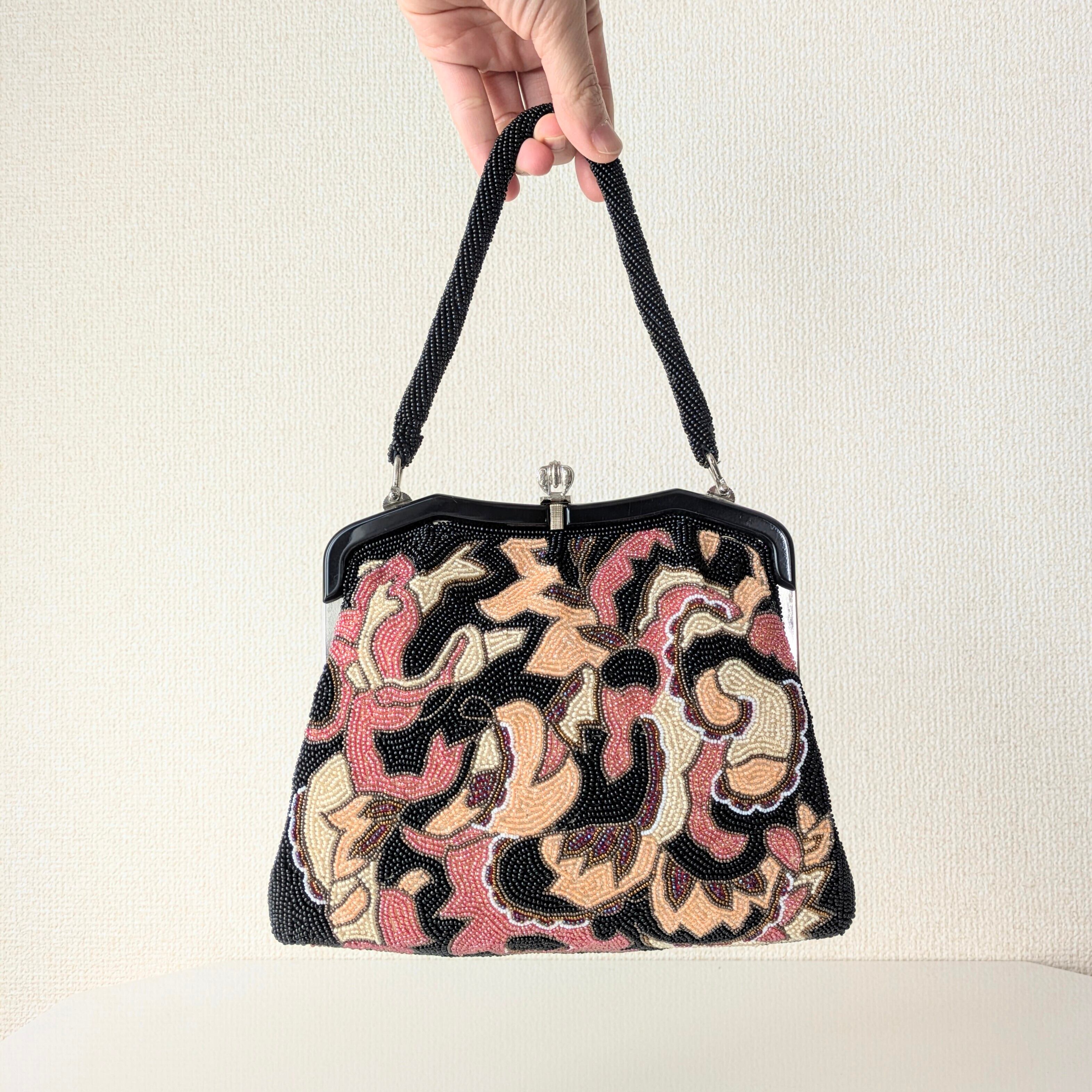 黒地に映えるカラフルな抽象画柄のビーズバッグです。斬新でユニークな柄は装いのアクセントになります。