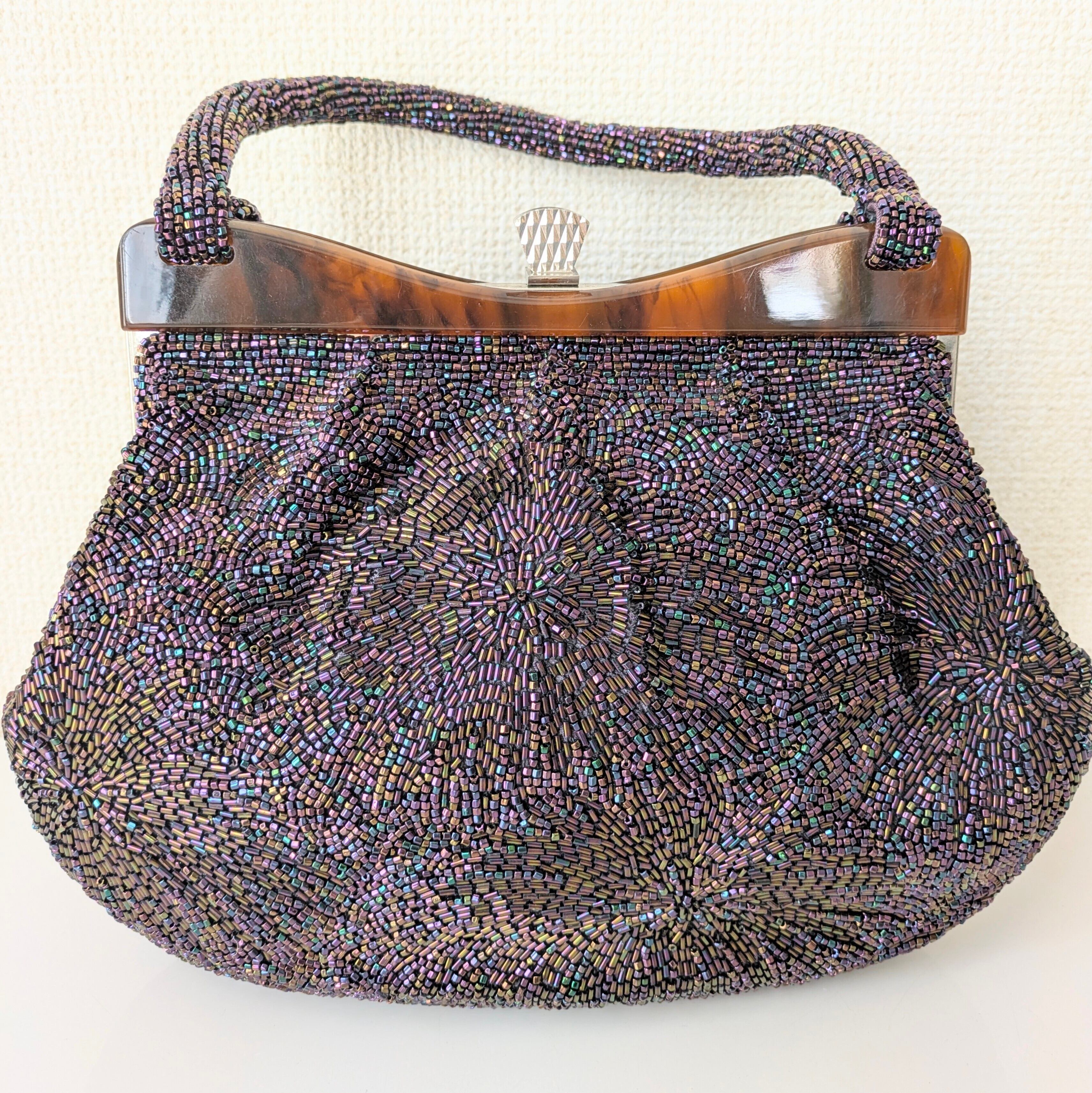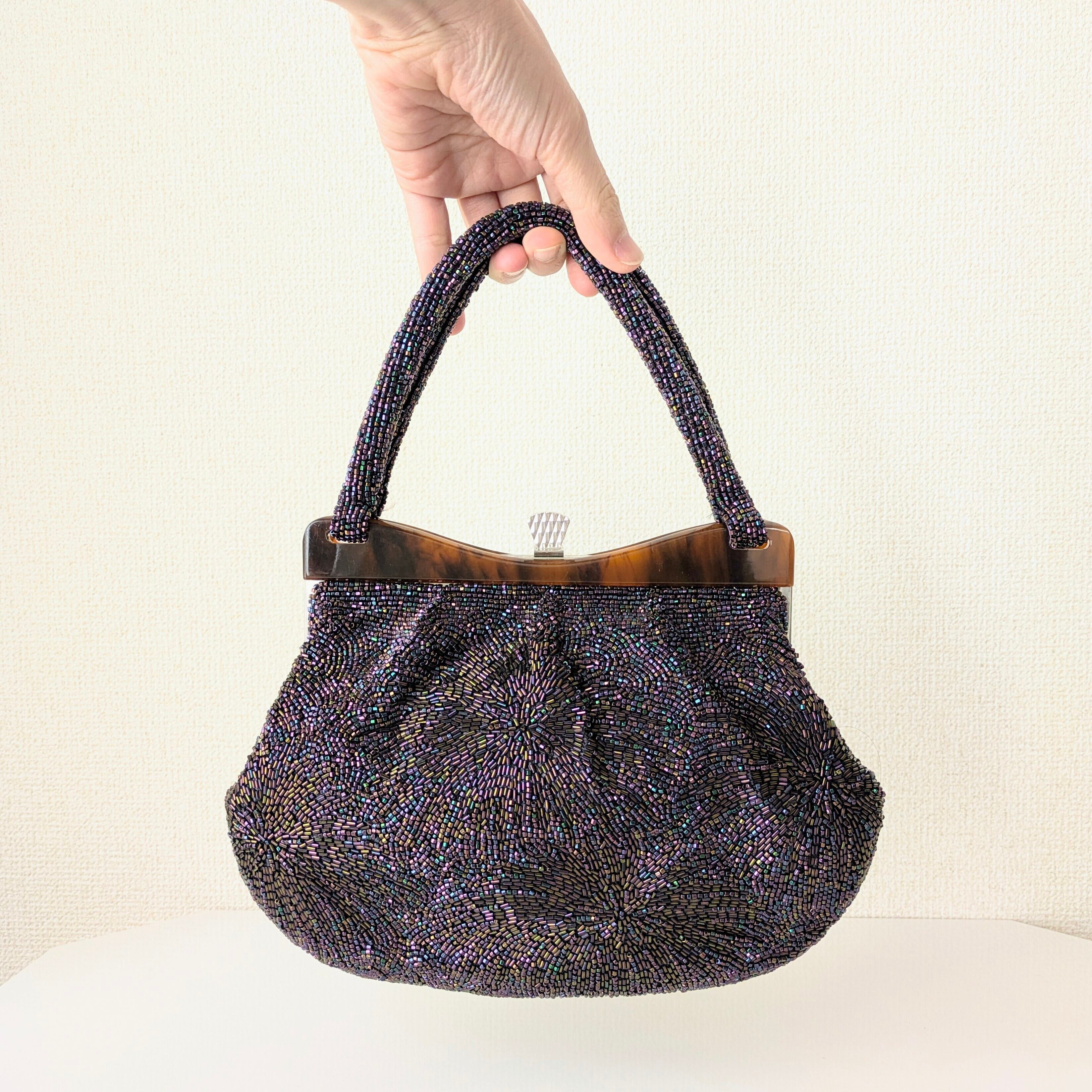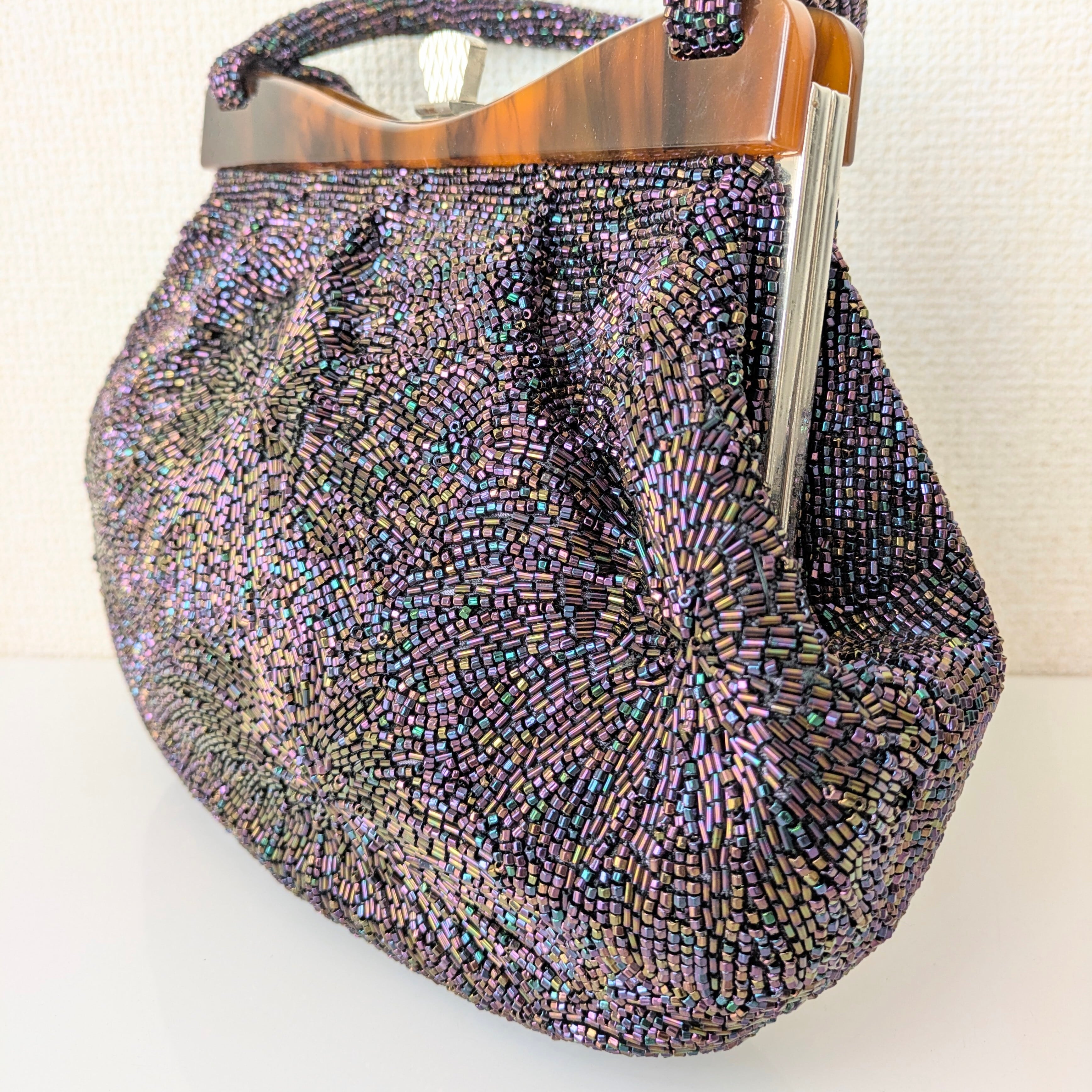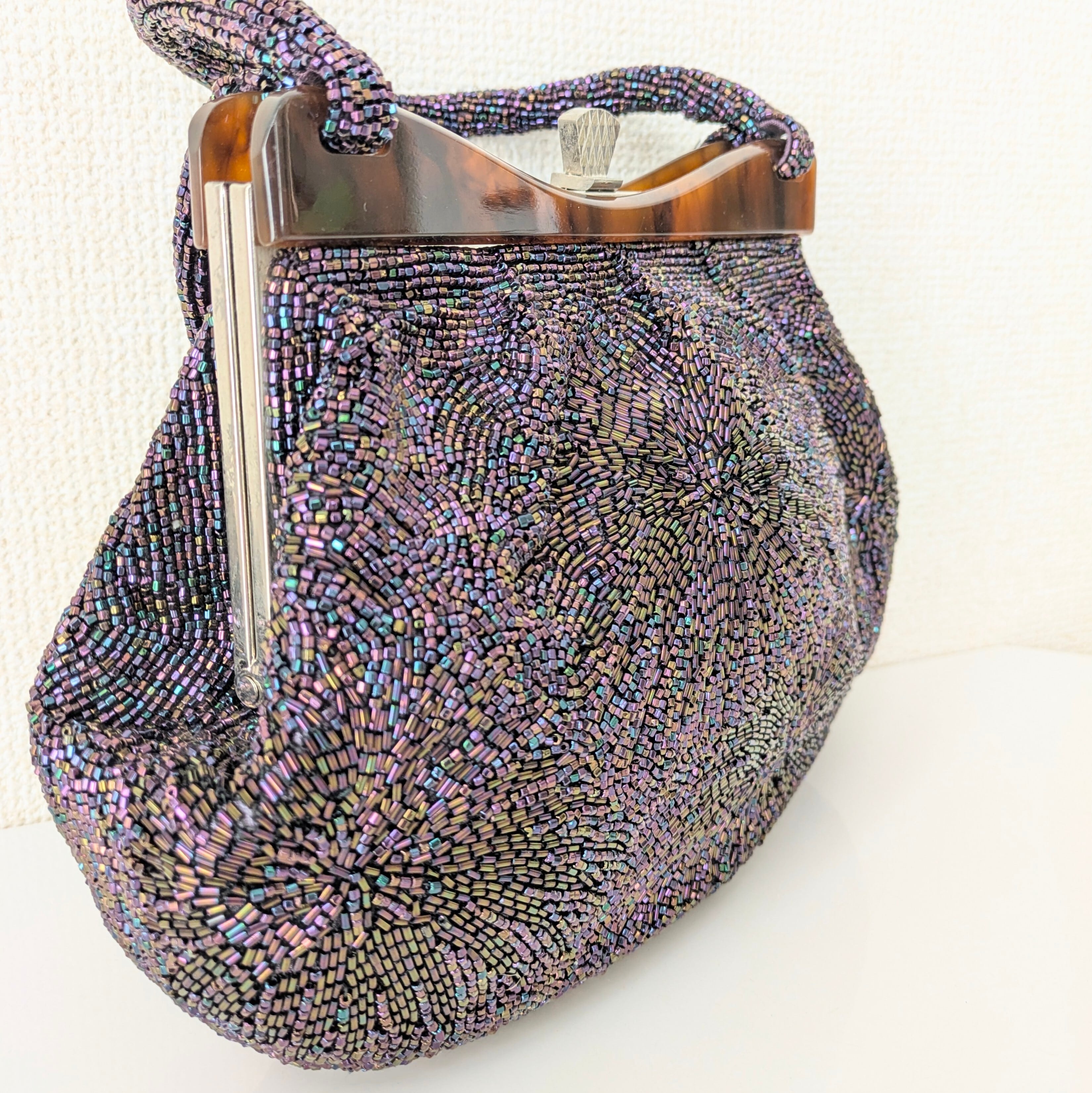 紫の玉蟲色に輝くカットビーズがゴージャスで美しいビーズバッグ。べっ甲色のがま口もレトロな雰囲気を醸し出しています。