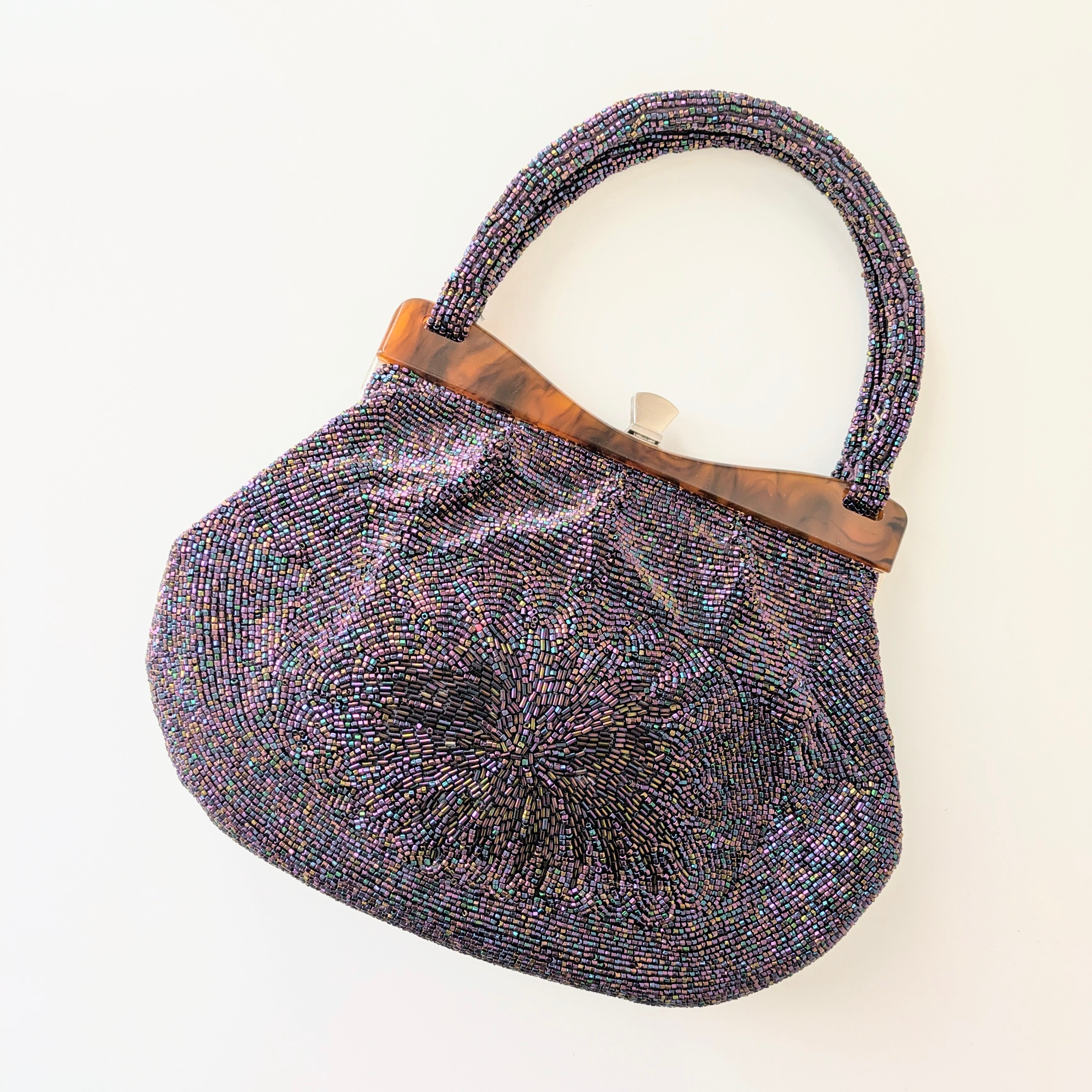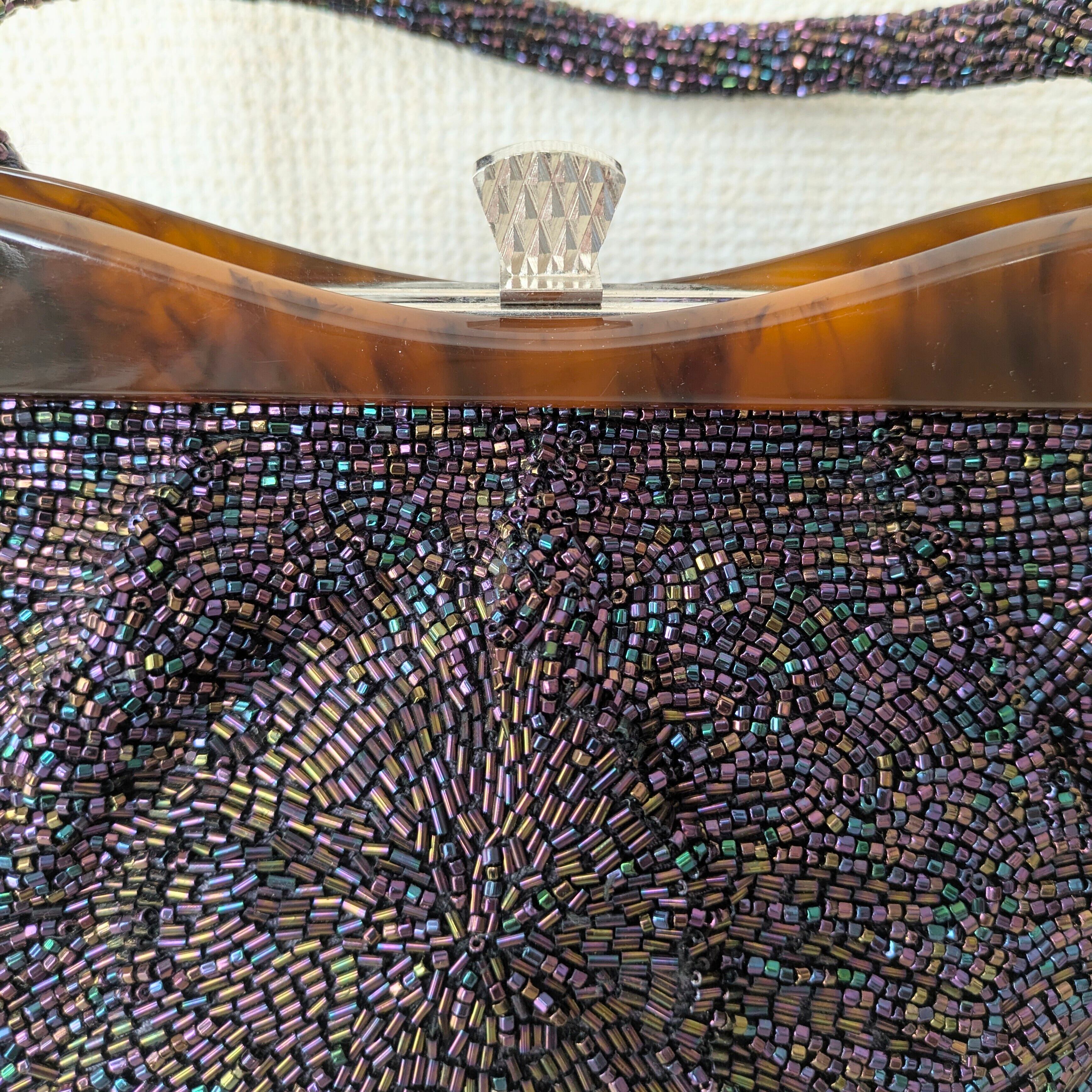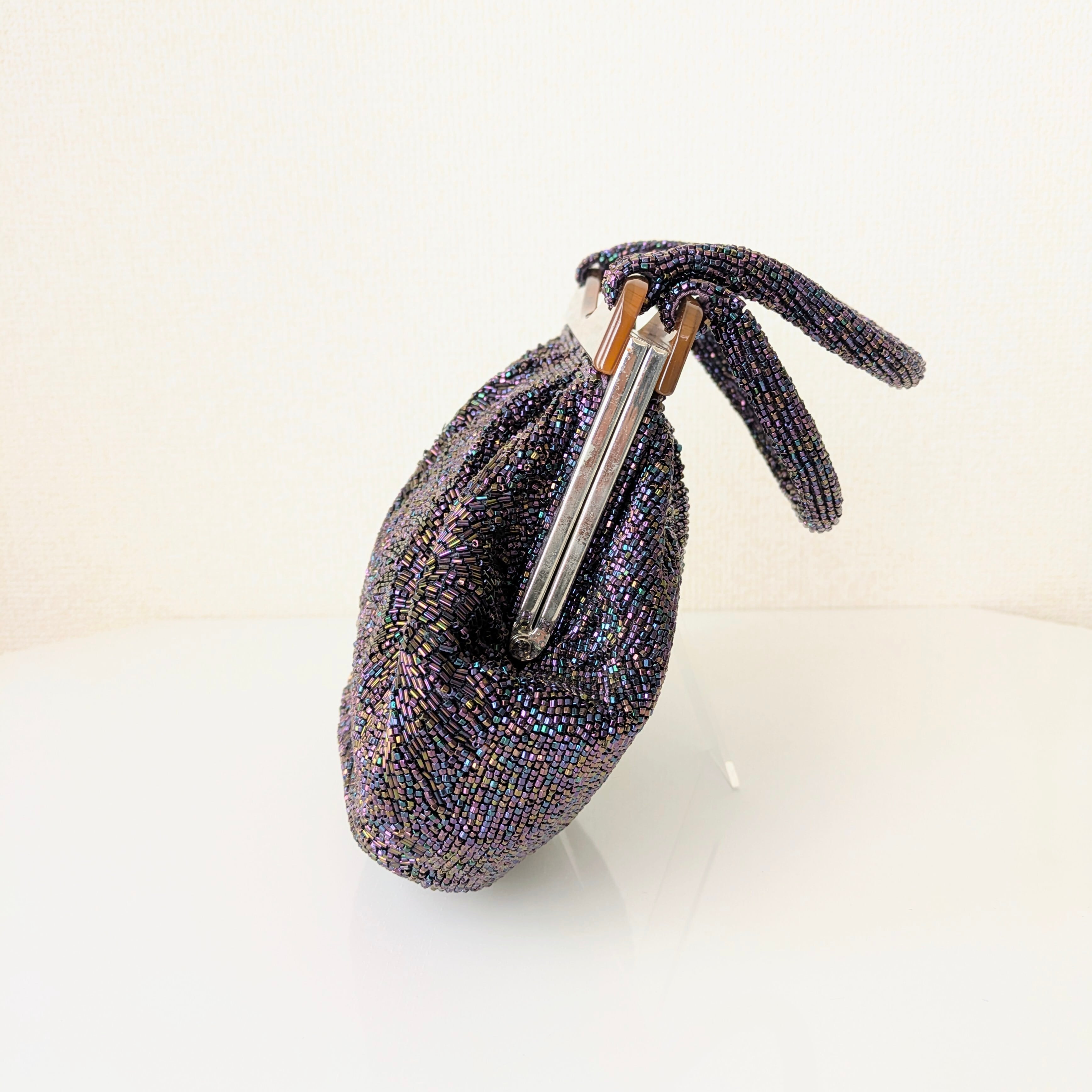 紫の玉蟲色に輝くカットビーズがゴージャスで美しいビーズバッグ。べっ甲色のがま口もレトロな雰囲気を醸し出しています。