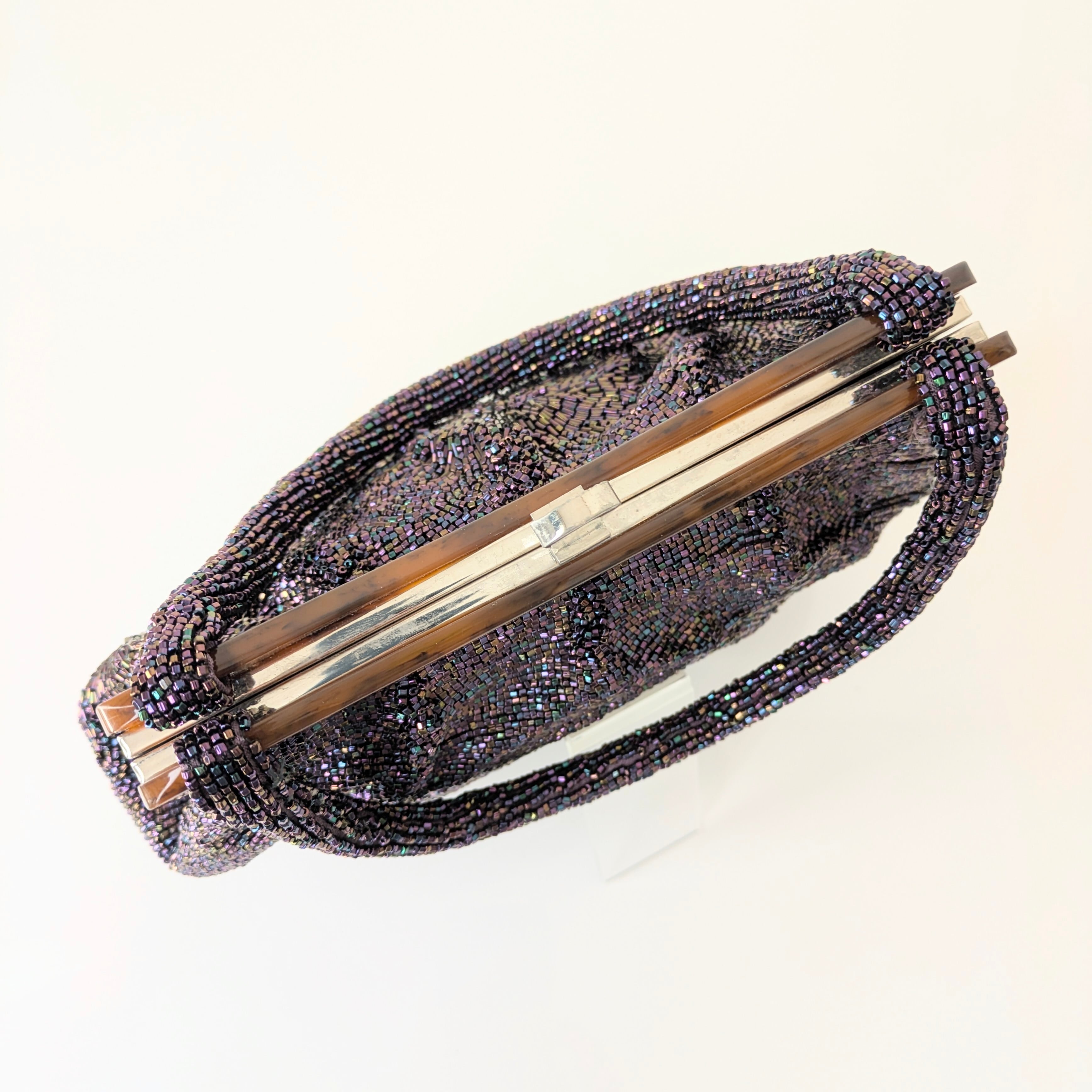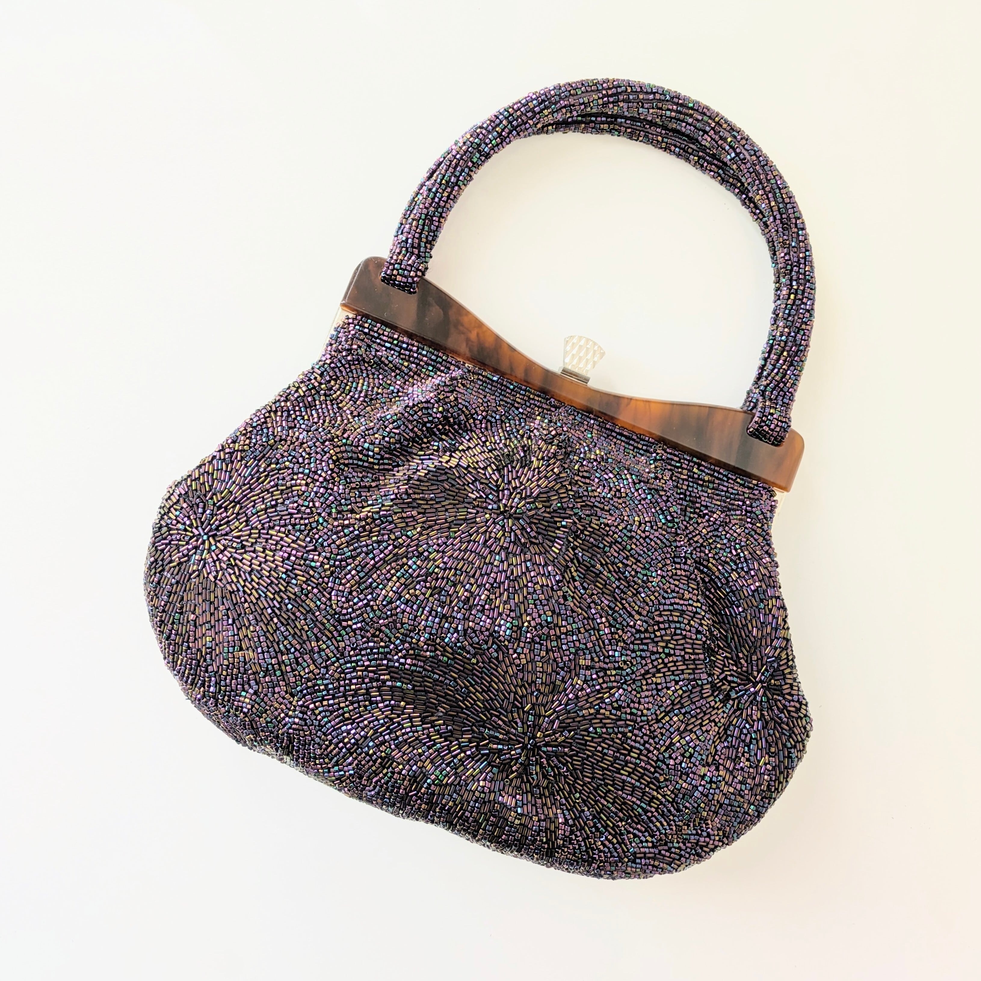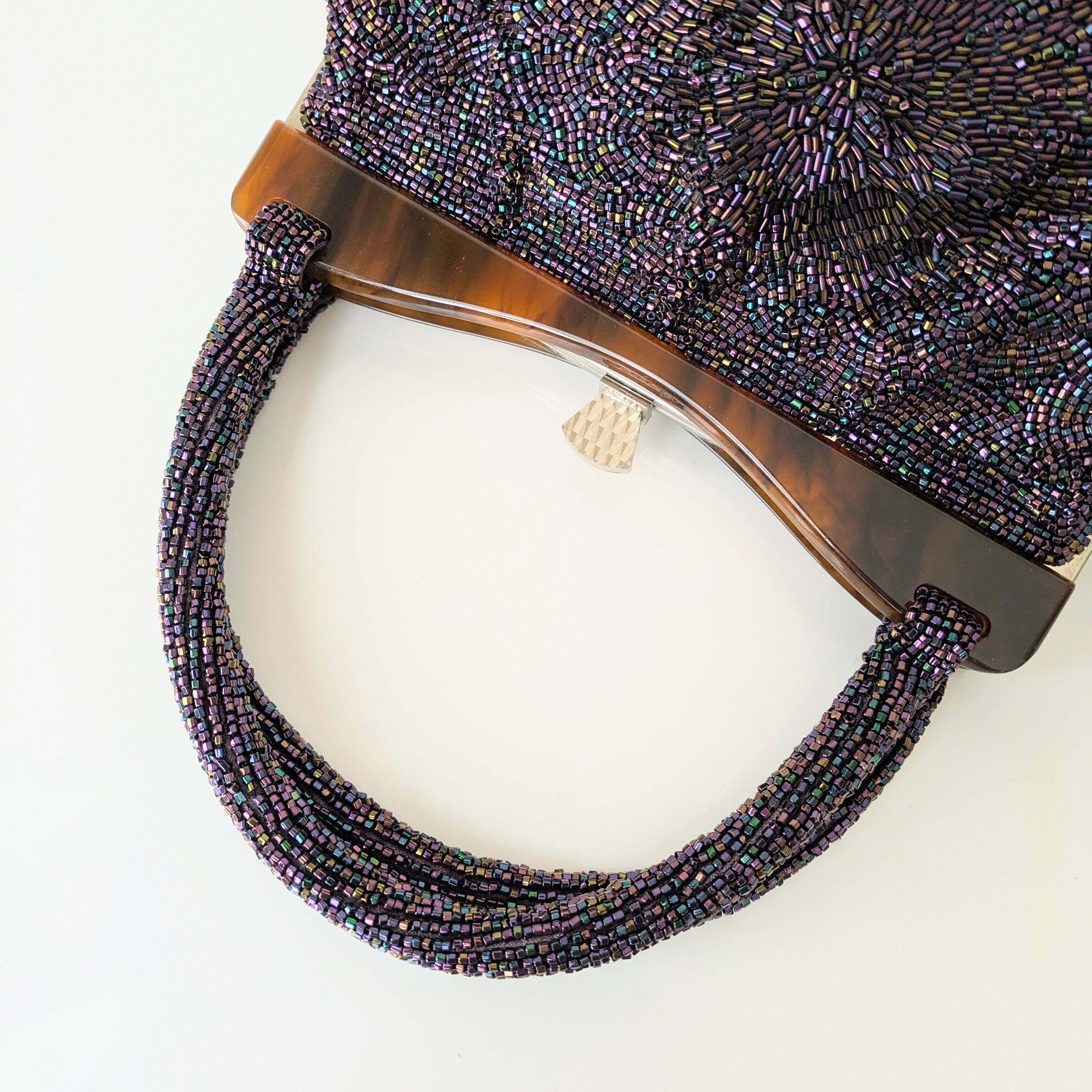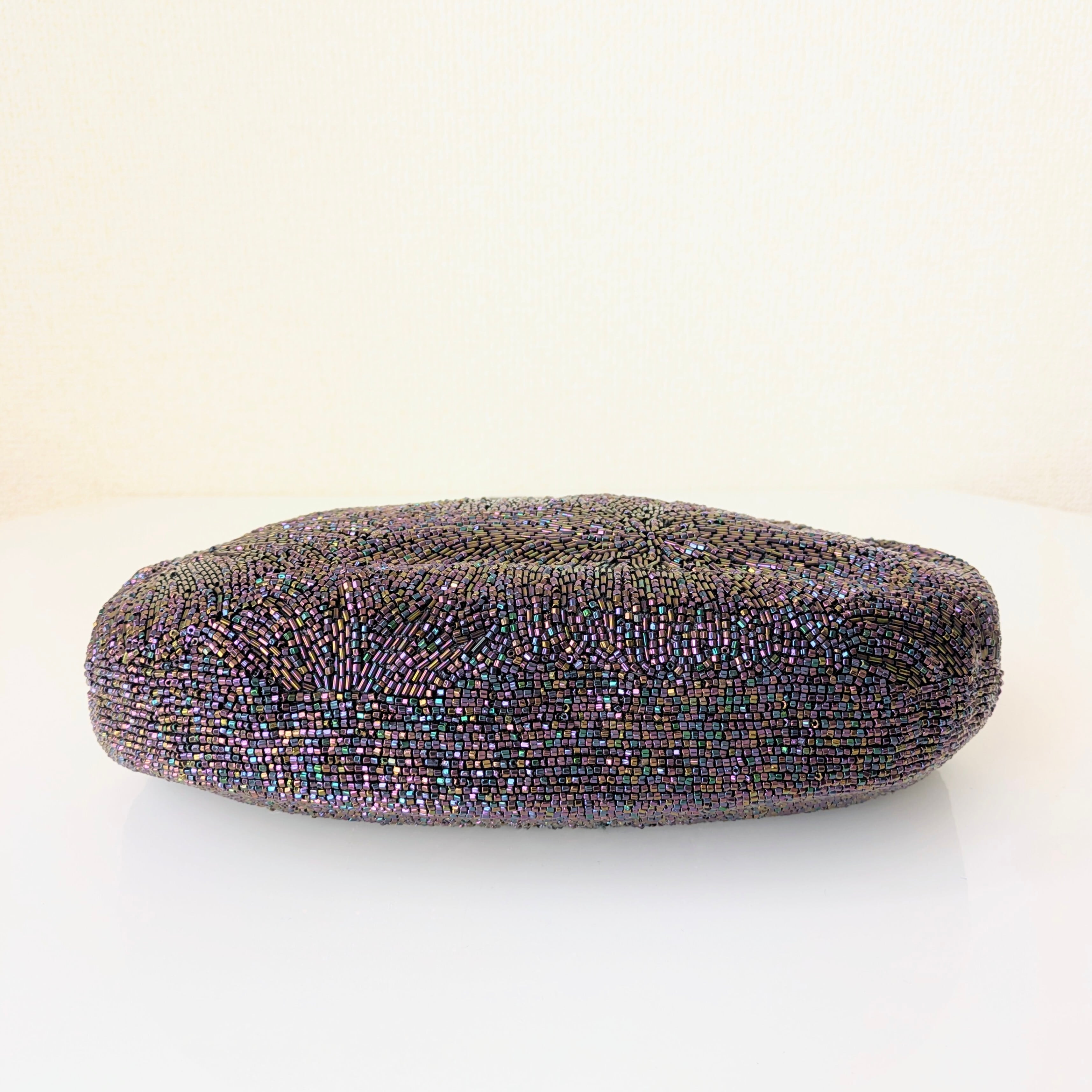 紫の玉蟲色に輝くカットビーズがゴージャスで美しいビーズバッグ。べっ甲色のがま口もレトロな雰囲気を醸し出しています。